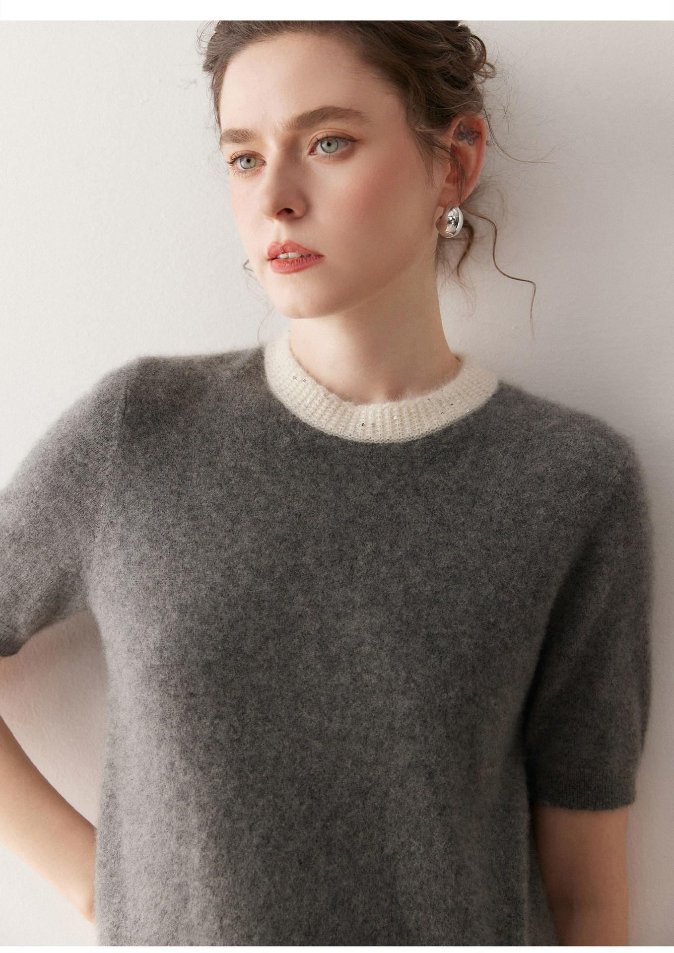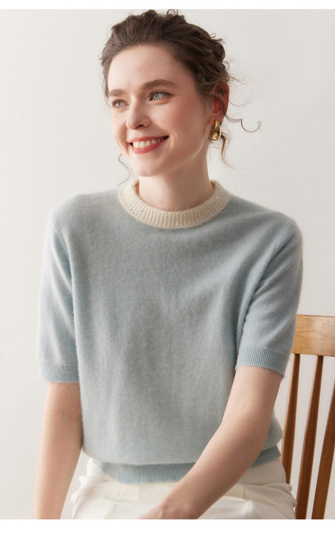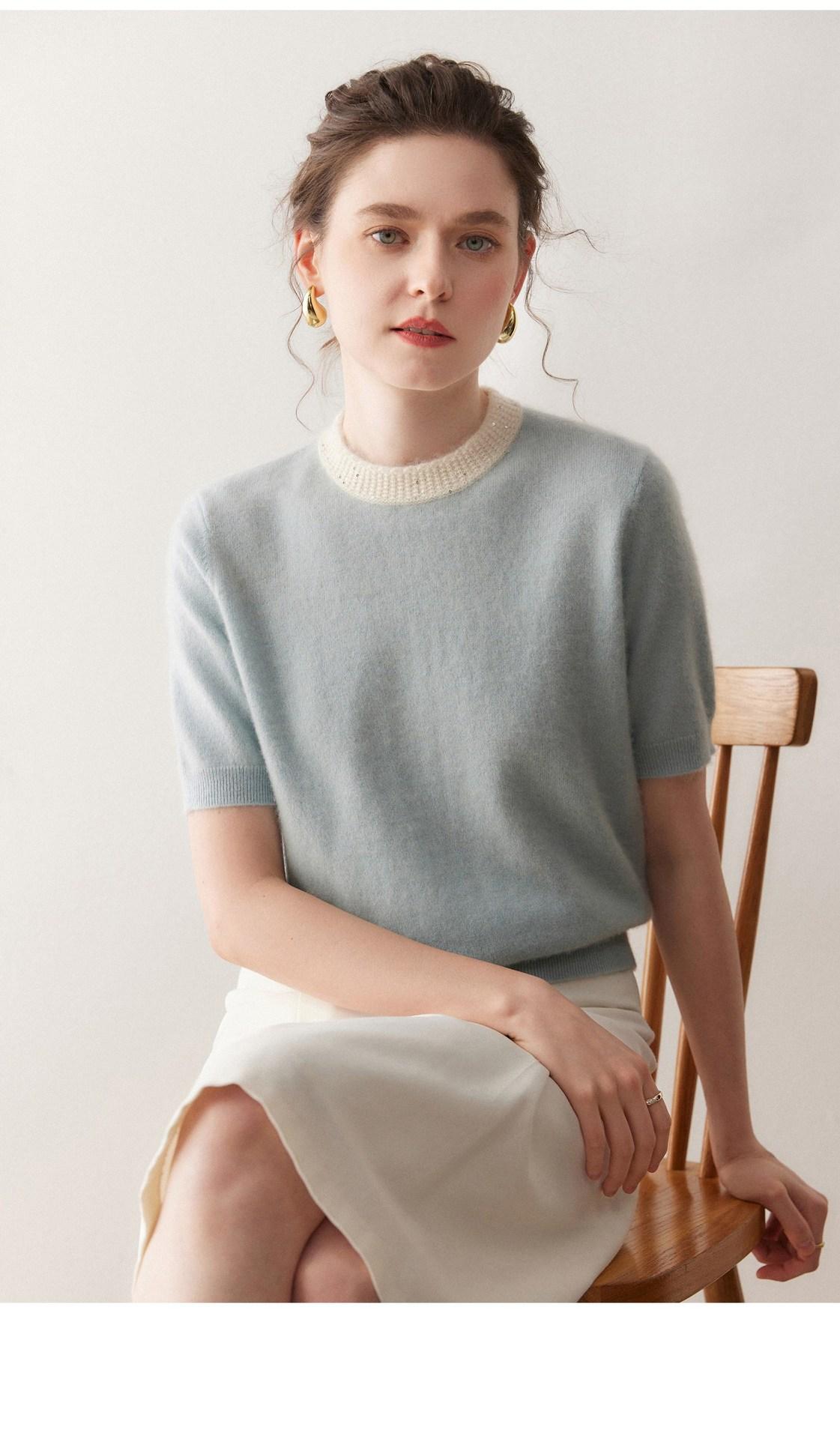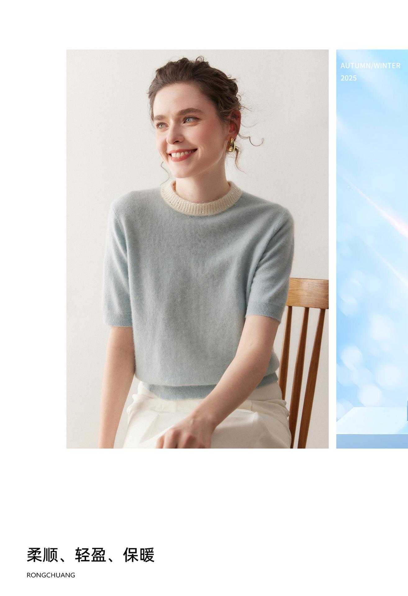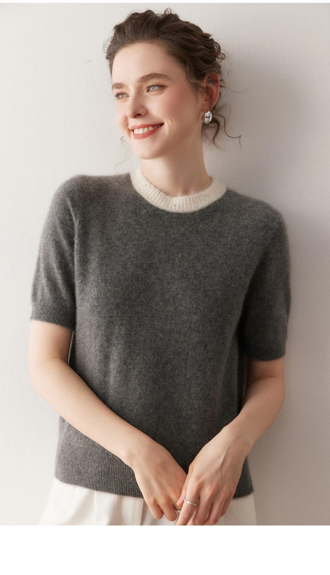Suéter de Cachemira de Manga Corta con Cuello Redondo y Lentejuelas Color Block para Mujer, Tejido de Punto Suave al Tacto, Otoño/Invierno 2025, Capa Base de Punto de Media Manga