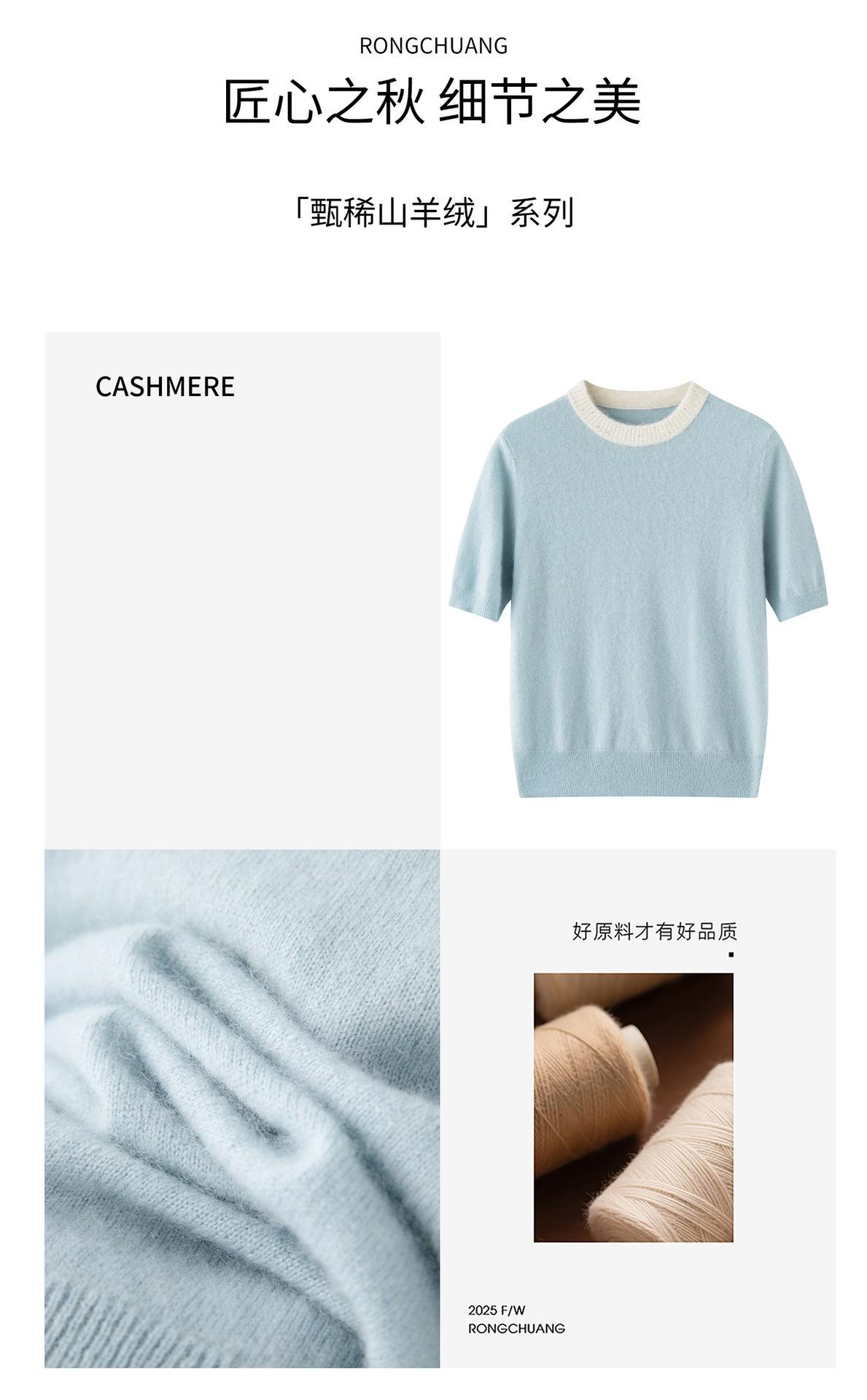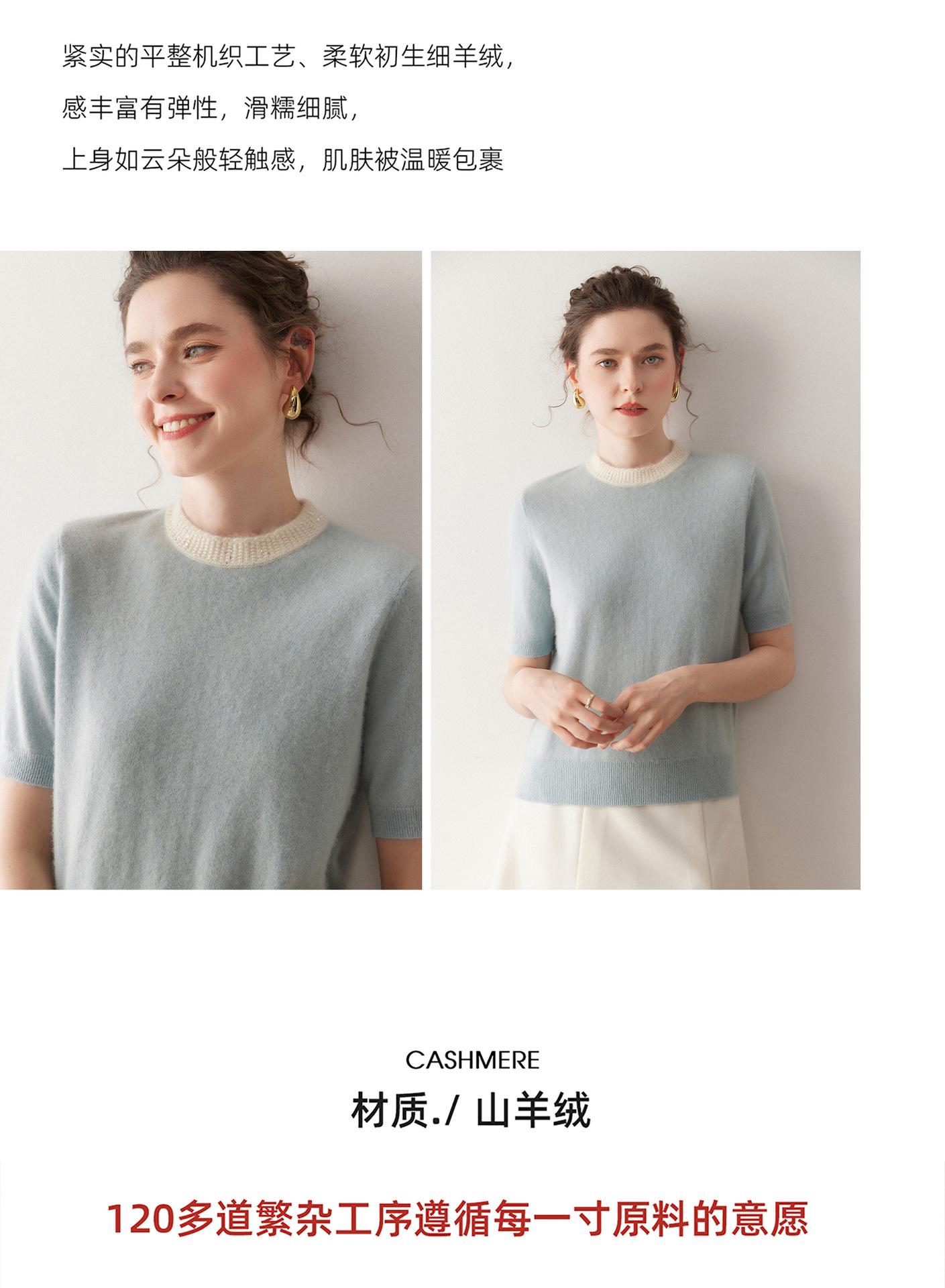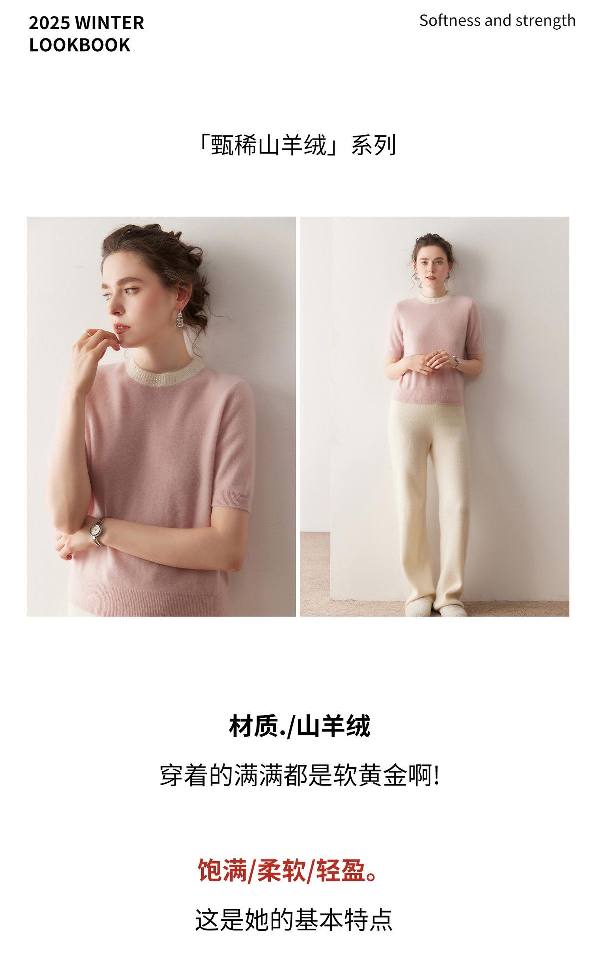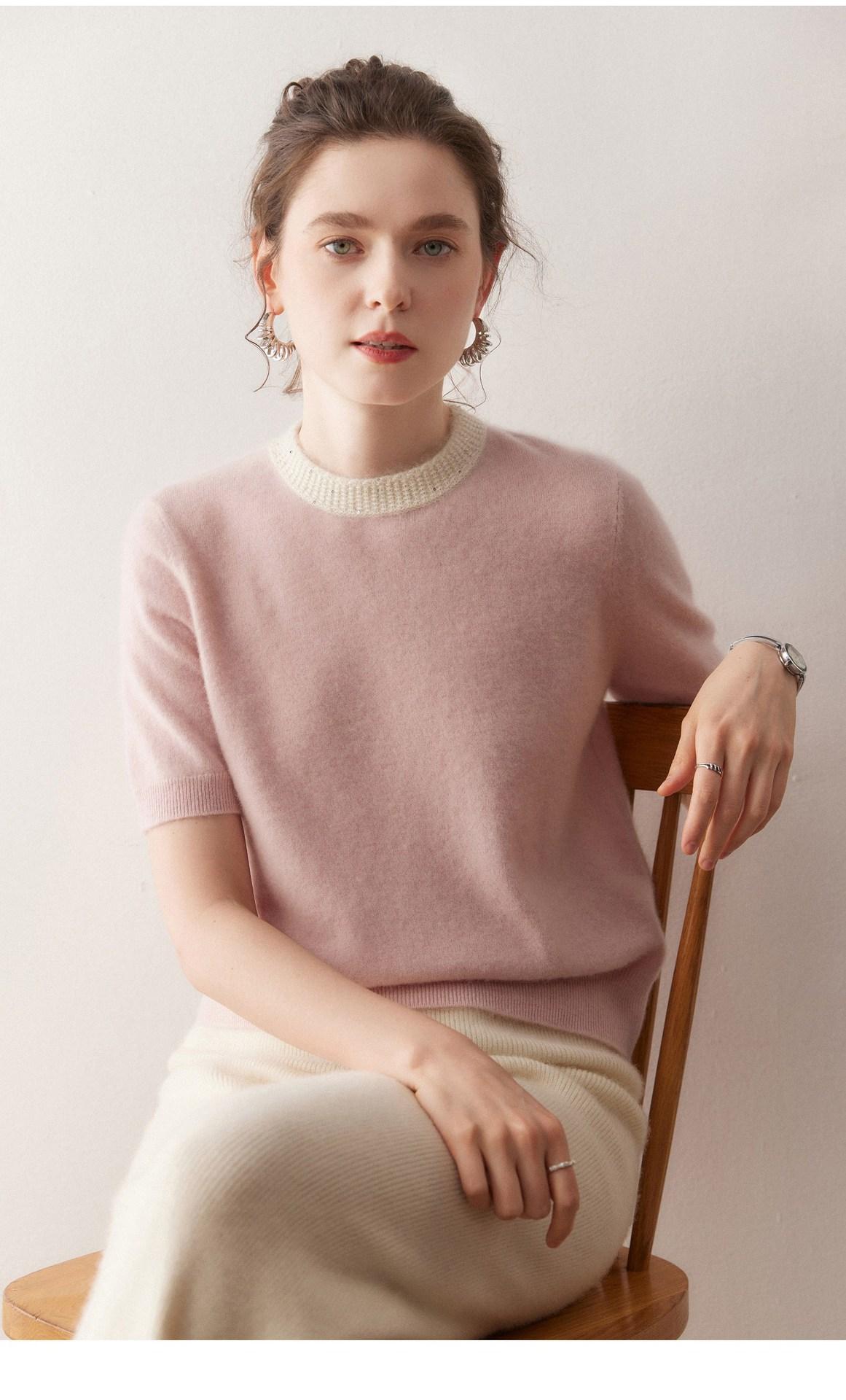 Suéter de Cachemira de Manga Corta con Cuello Redondo y Lentejuelas Color Block para Mujer, Tejido de Punto Suave al Tacto, Otoño/Invierno 2025, Capa Base de Punto de Media Manga