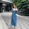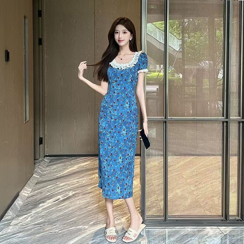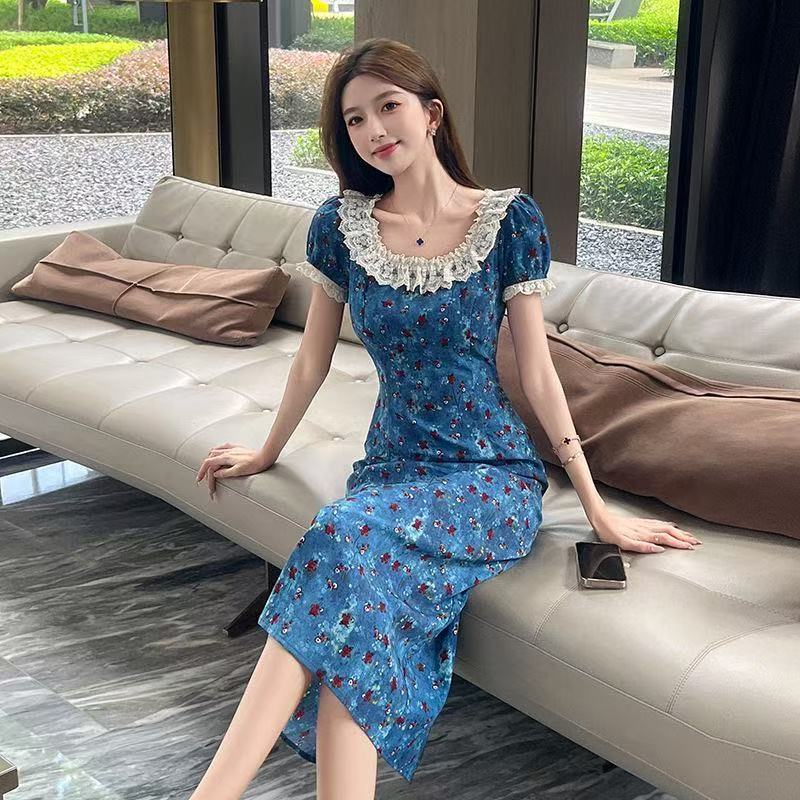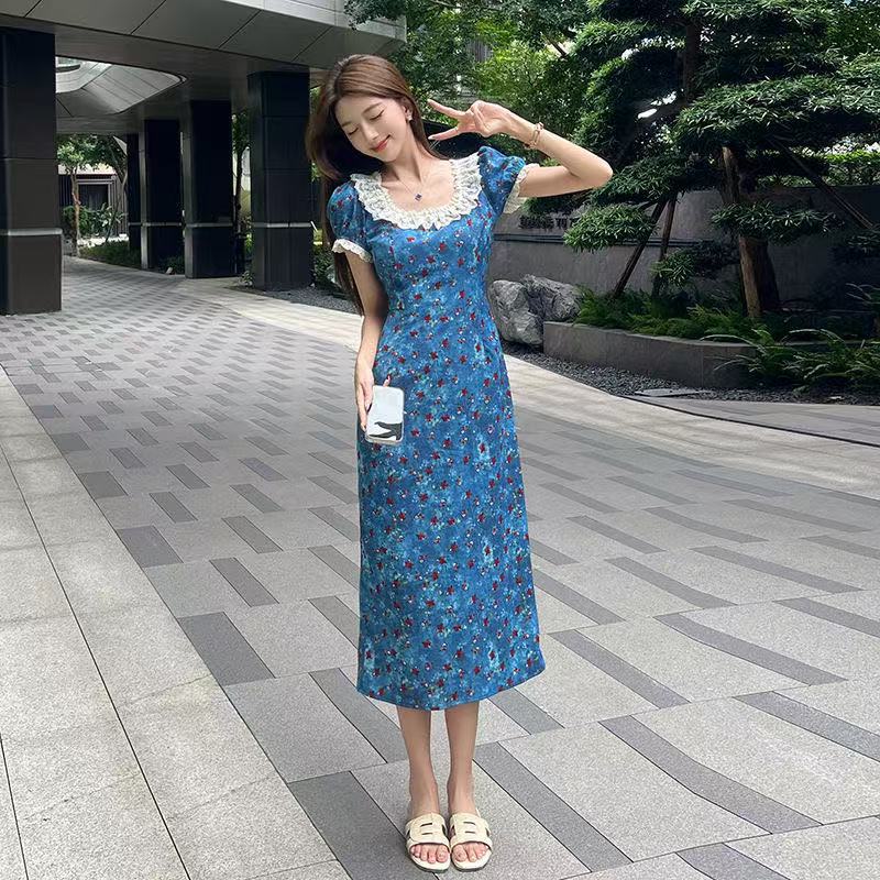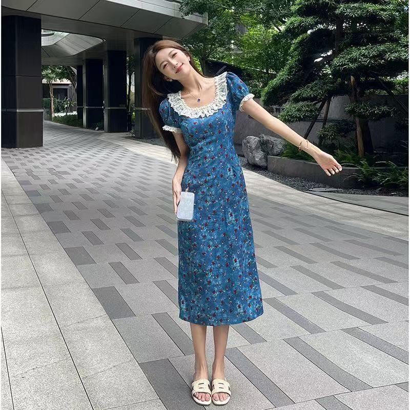 Vestido Retro Francés Azul Floral Estilo Palacio Verano Nuevo Diseño Adelgazante y Hermoso Vestido Largo de Vacaciones
