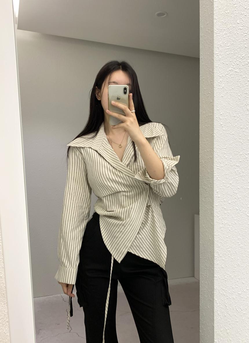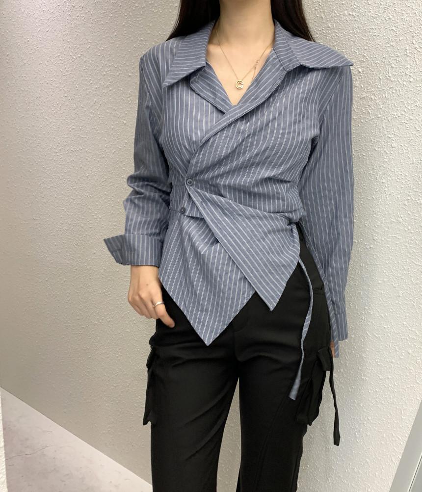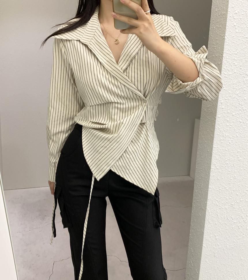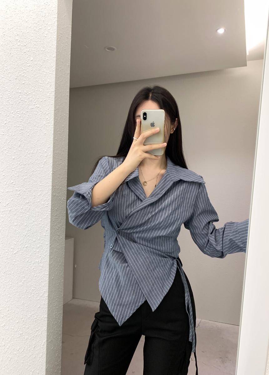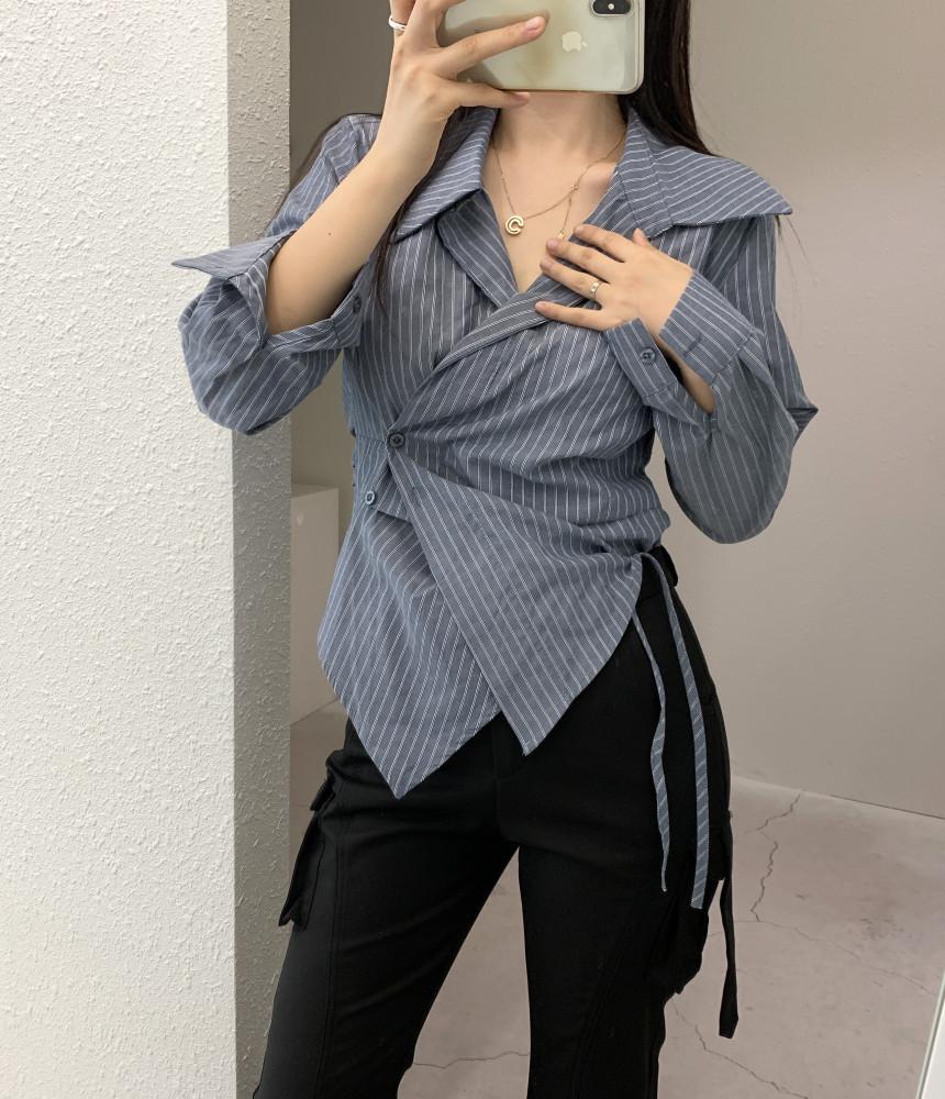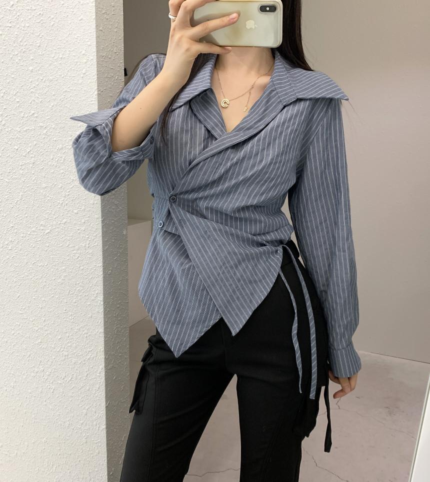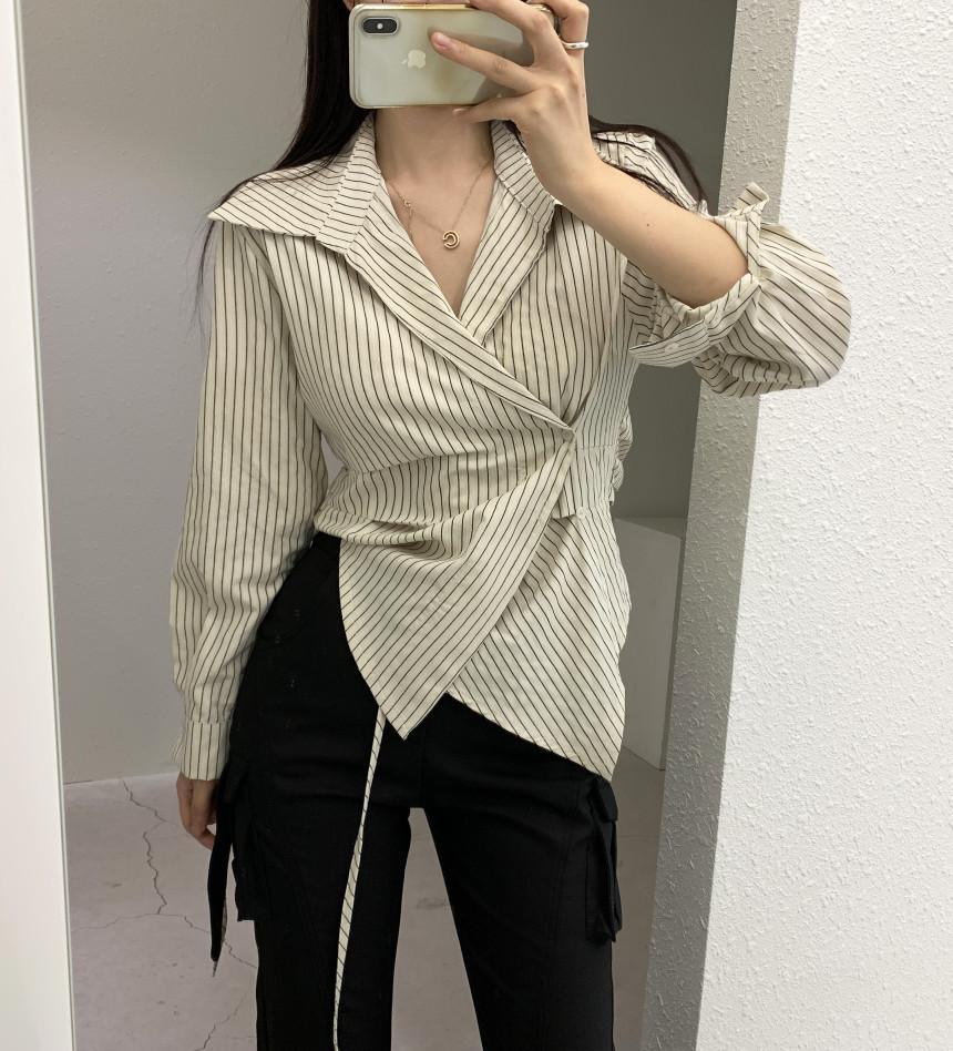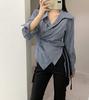 Otoño 2025 Nuevo Diseño Coreano Solapa Tapeta Diagonal Camisa de Una Pieza Rayada Irregular Top de Mujer