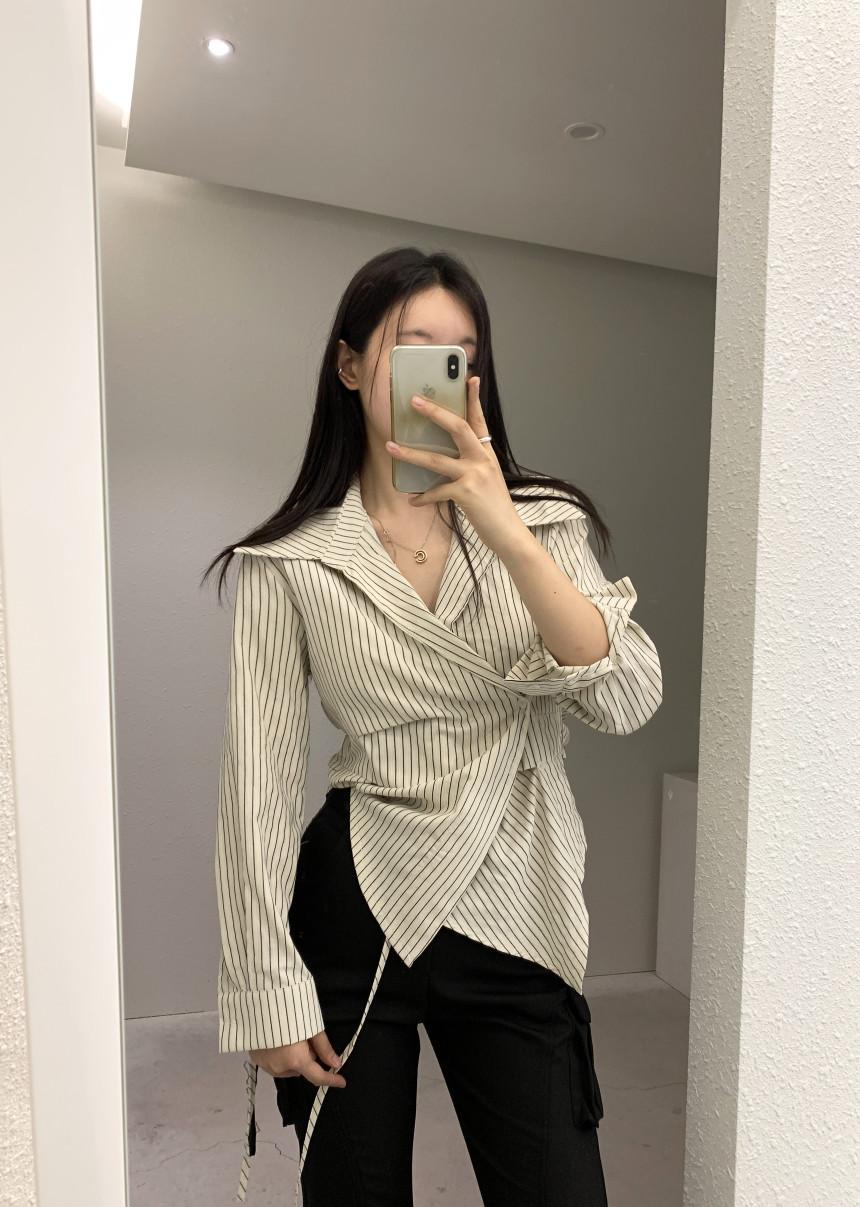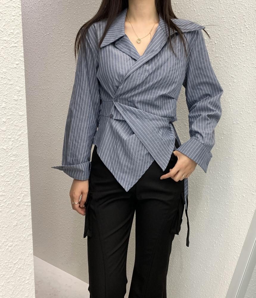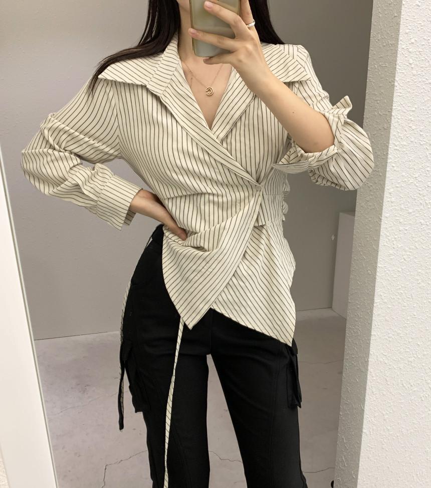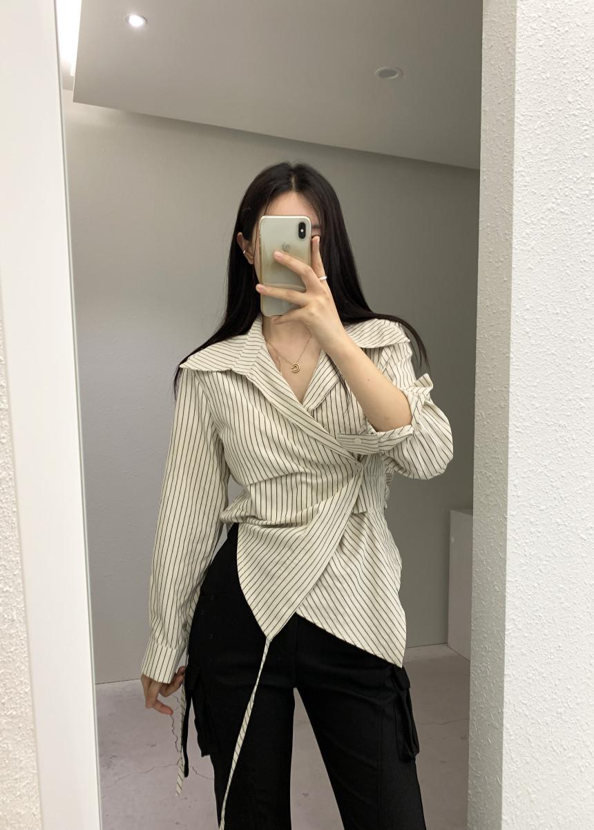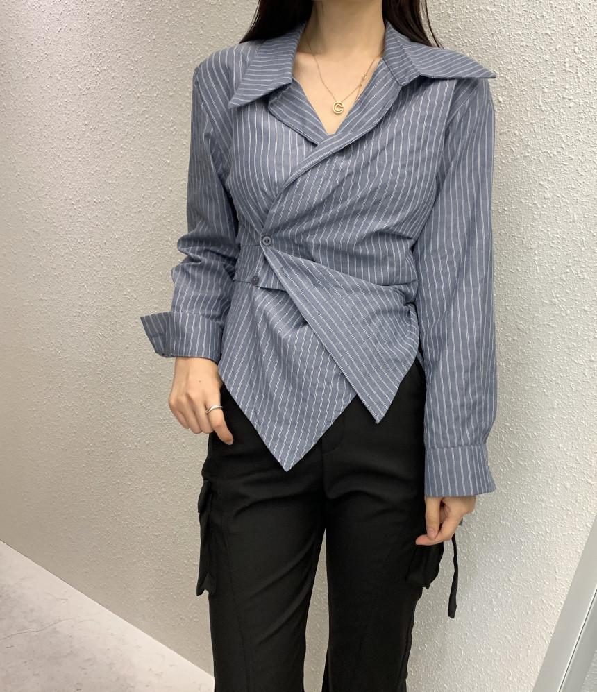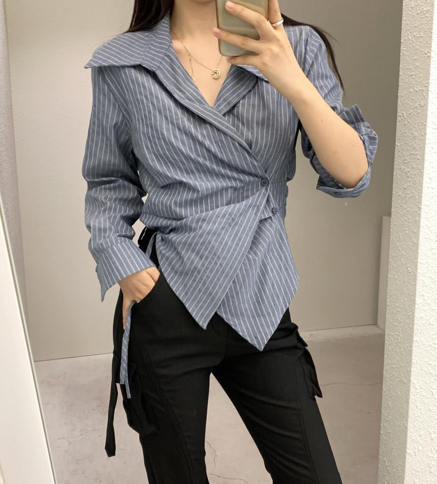 Otoño 2025 Nuevo Diseño Coreano Solapa Tapeta Diagonal Camisa de Una Pieza Rayada Irregular Top de Mujer