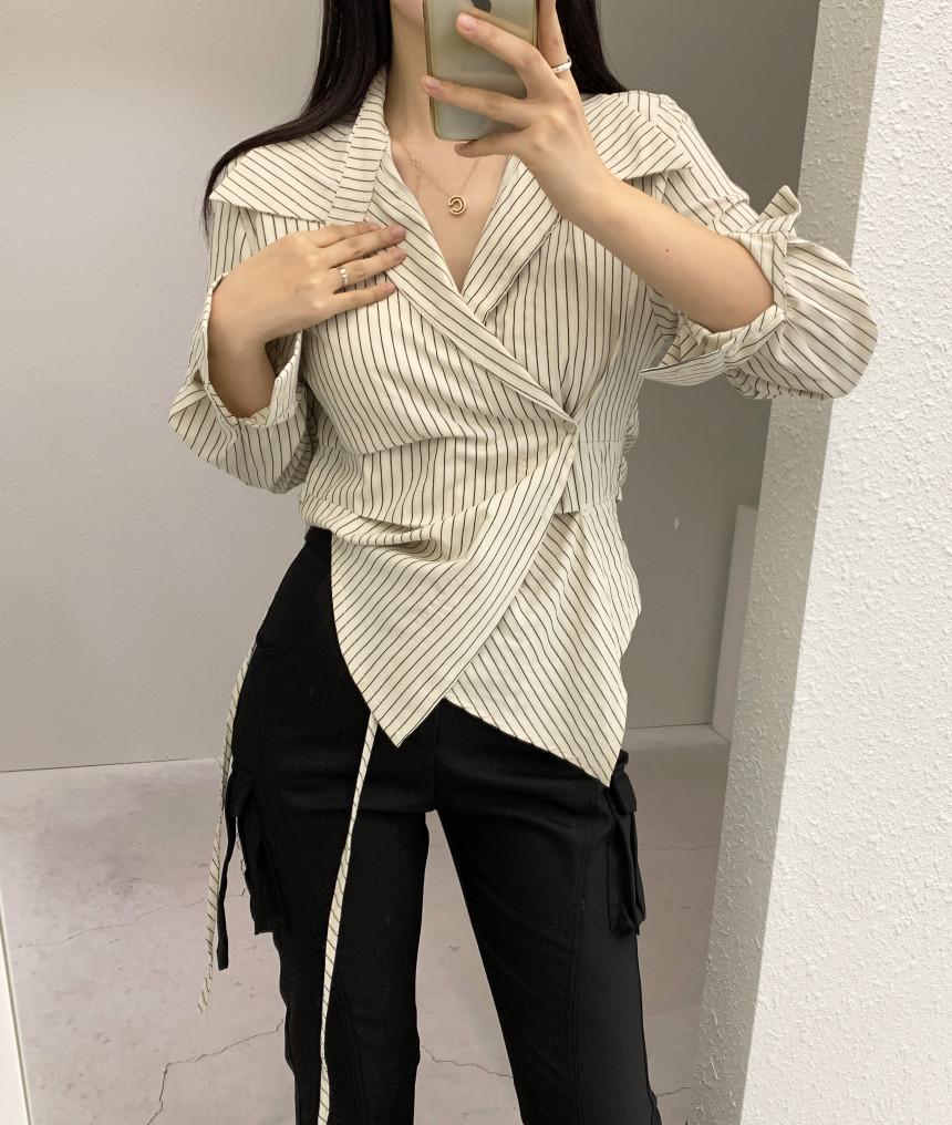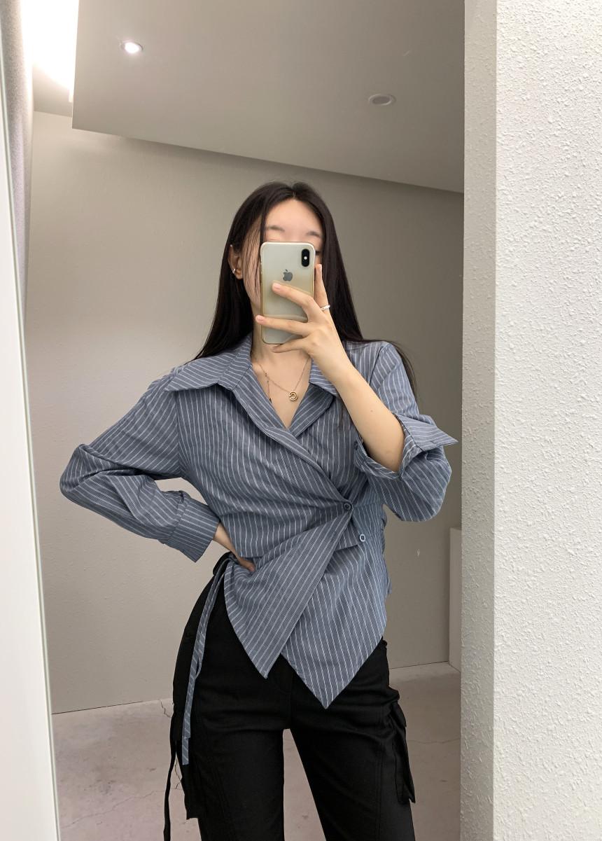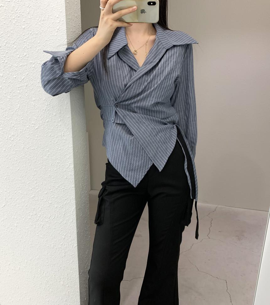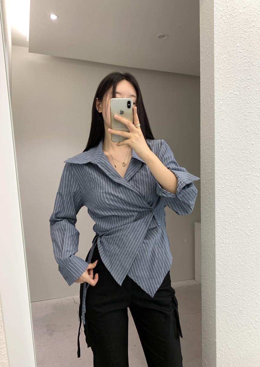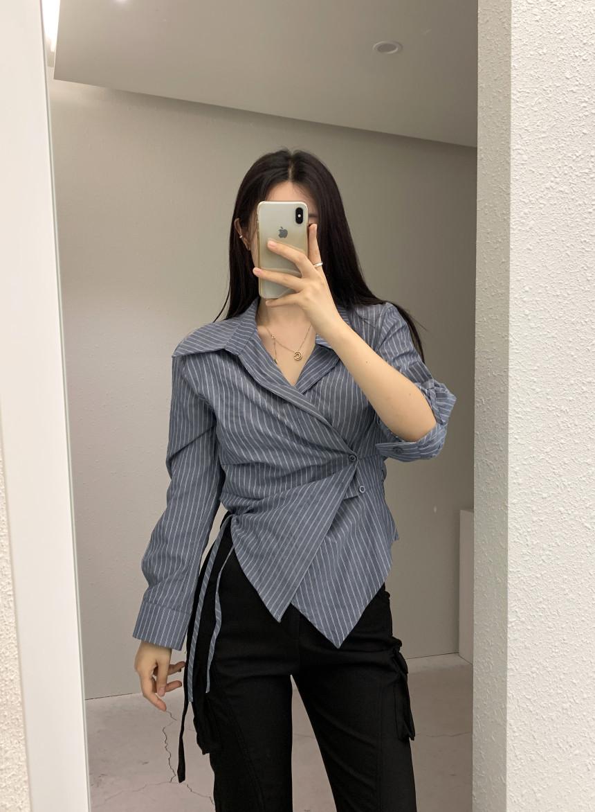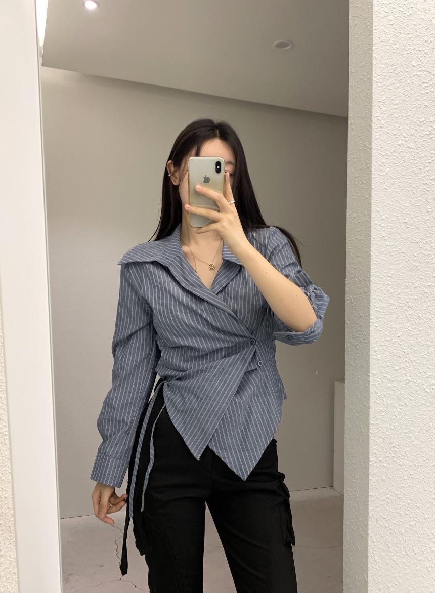 Otoño 2025 Nuevo Diseño Coreano Solapa Tapeta Diagonal Camisa de Una Pieza Rayada Irregular Top de Mujer