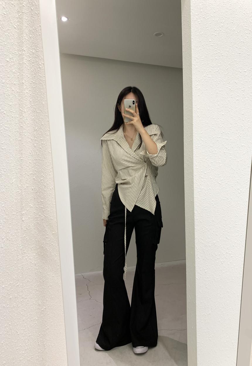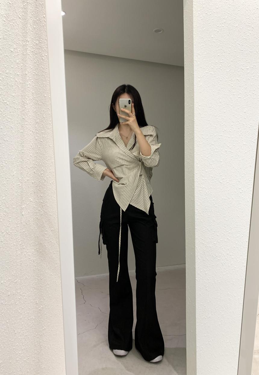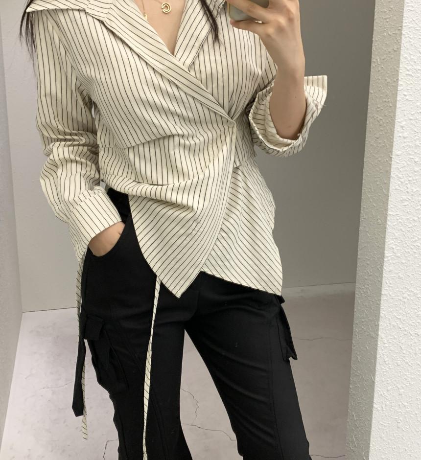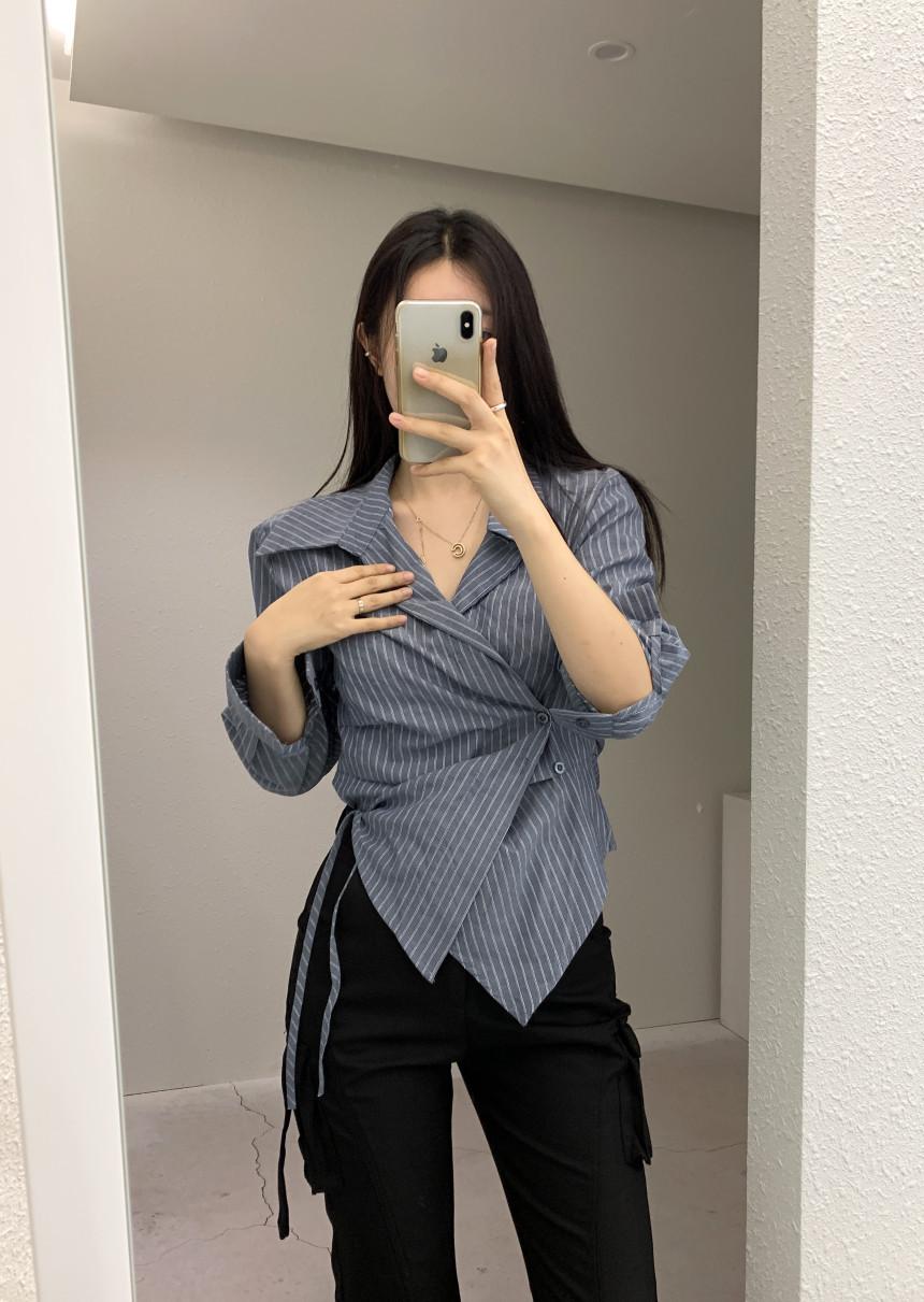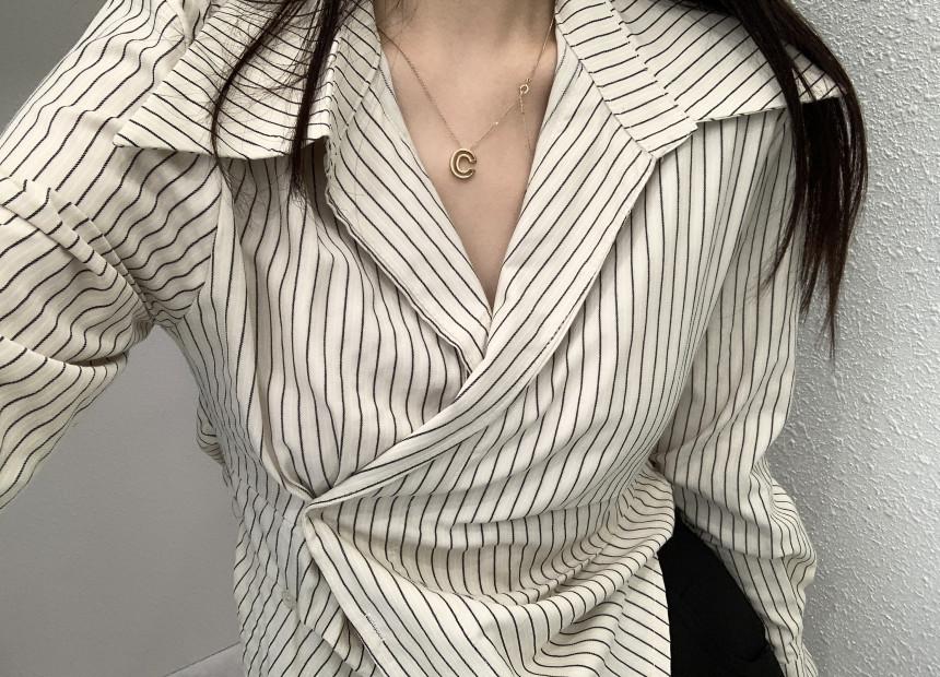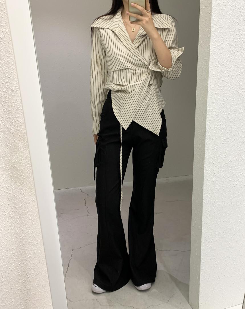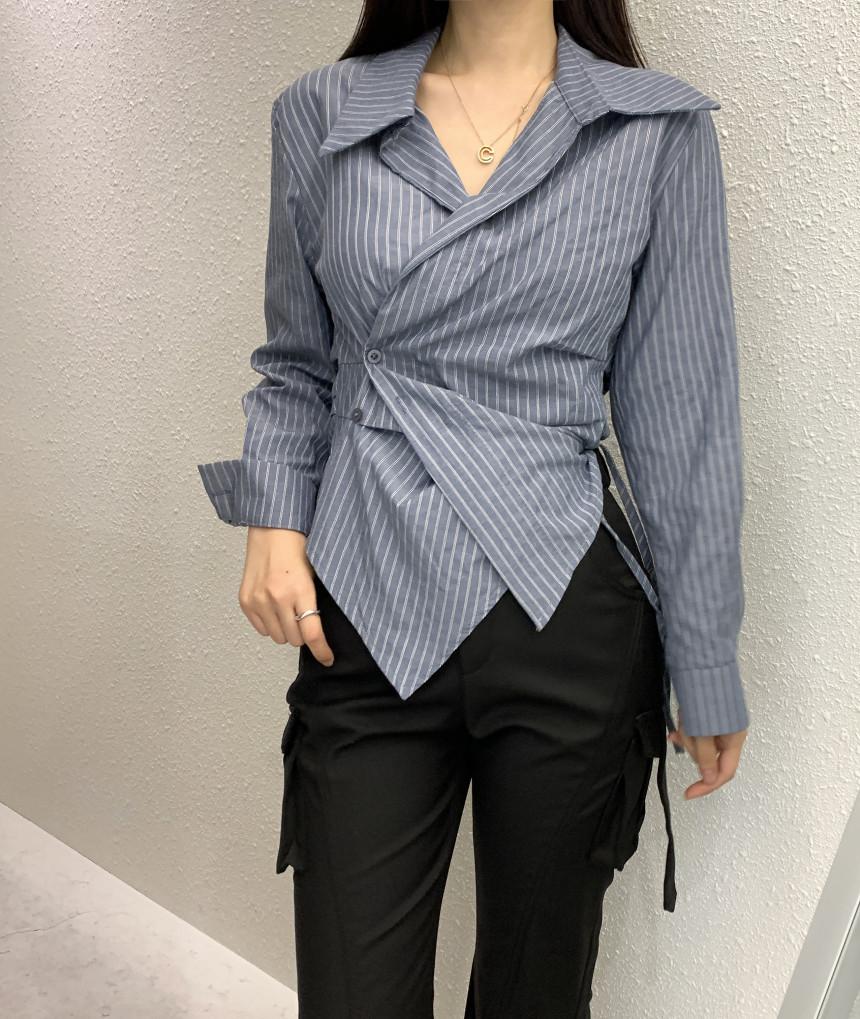 Otoño 2025 Nuevo Diseño Coreano Solapa Tapeta Diagonal Camisa de Una Pieza Rayada Irregular Top de Mujer