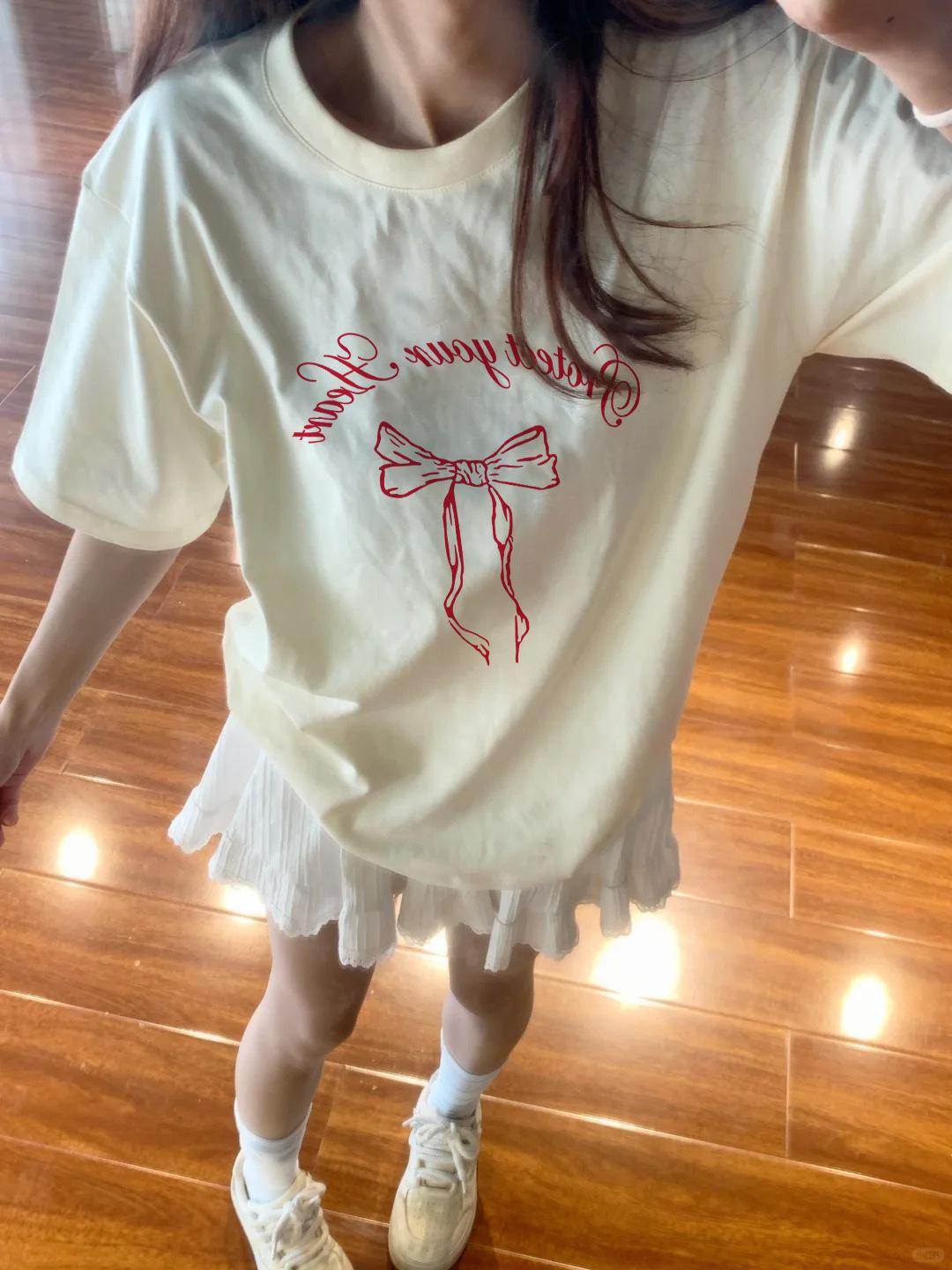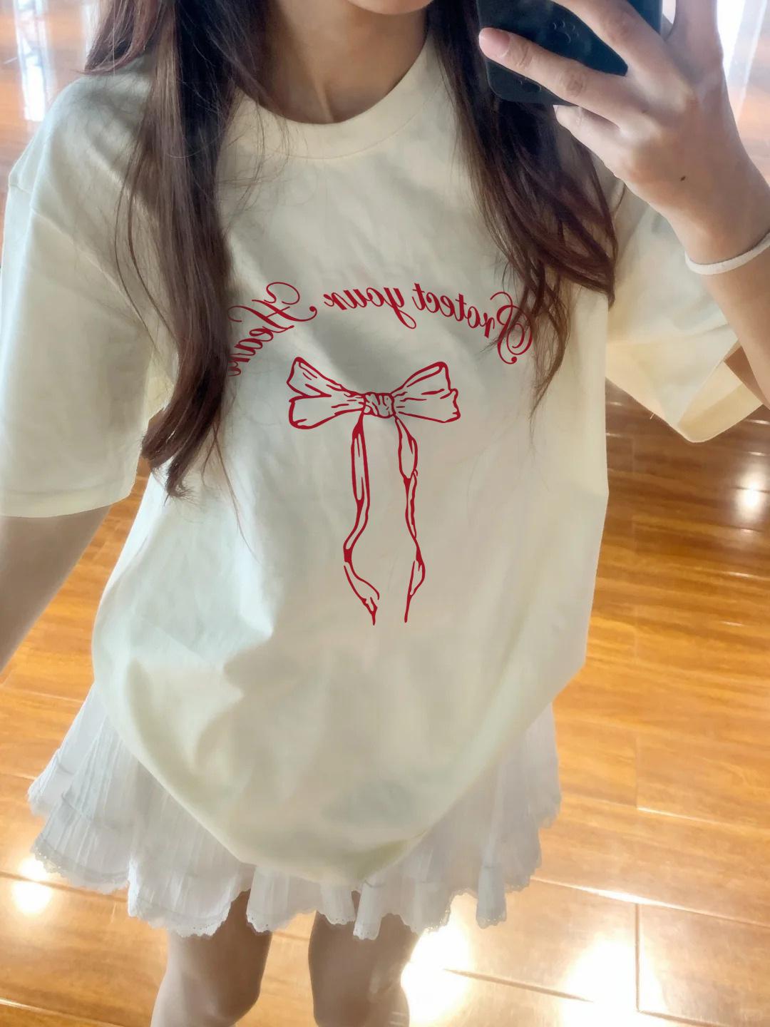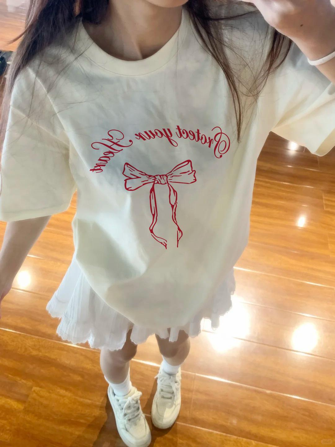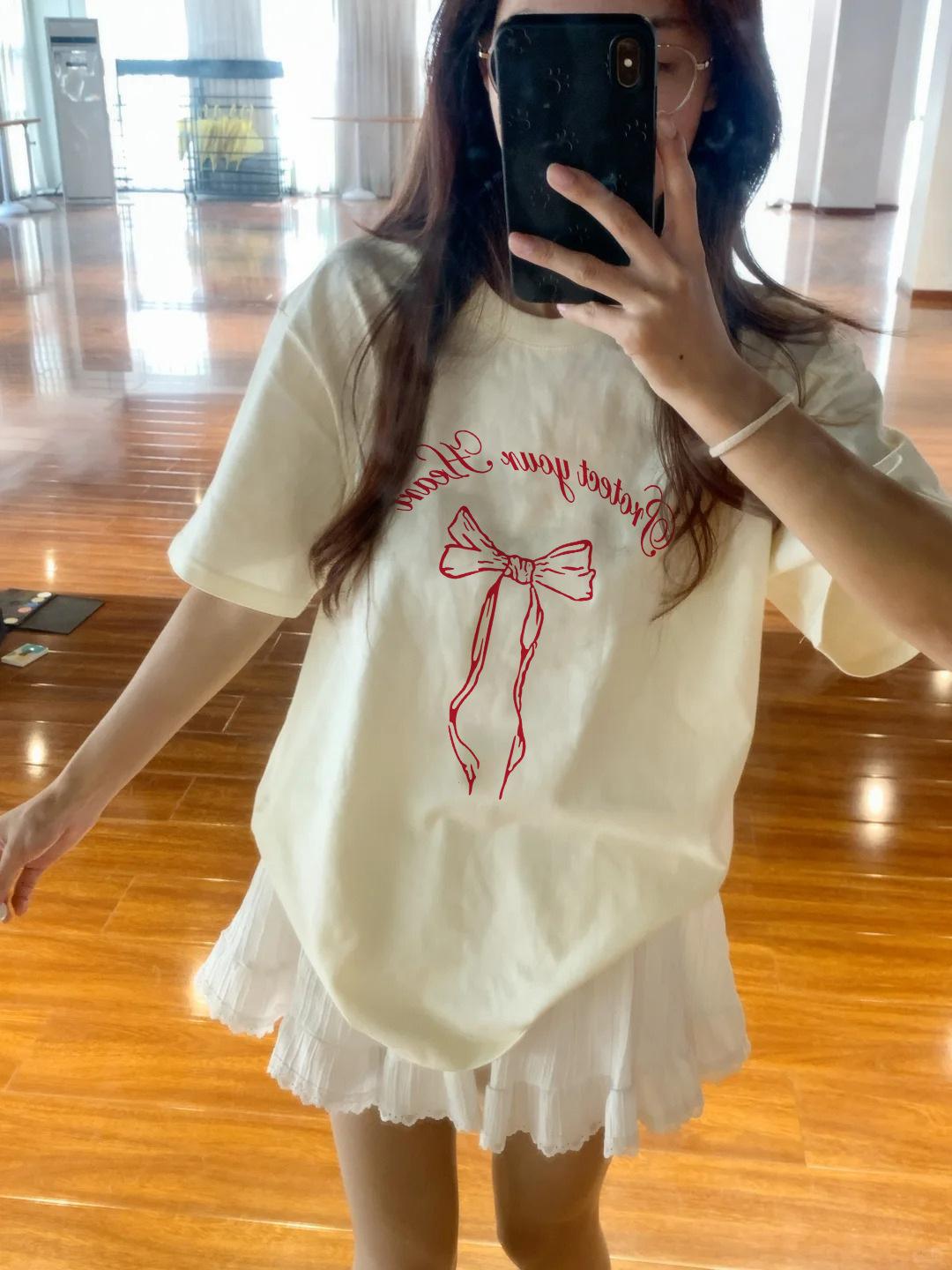 Verano 2025 Nuevo Estilo Hombro Derecho Manga Corta para Mujer Lazo Estampado Algodón Camiseta Básica Casual Holgada Cuello Redondo
