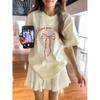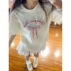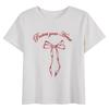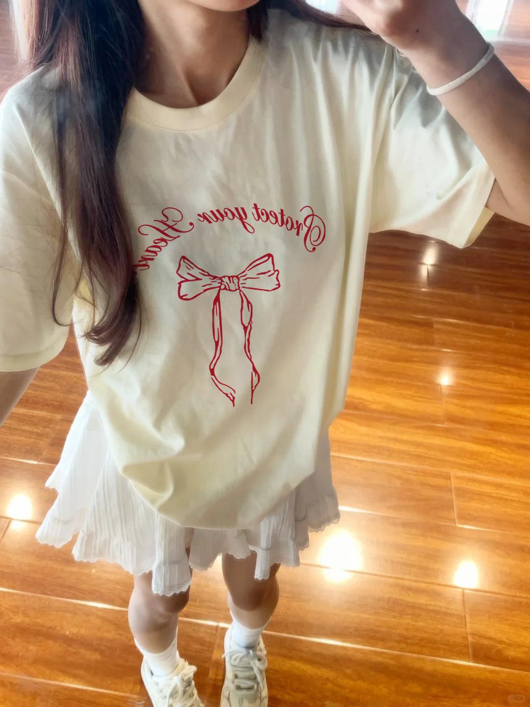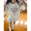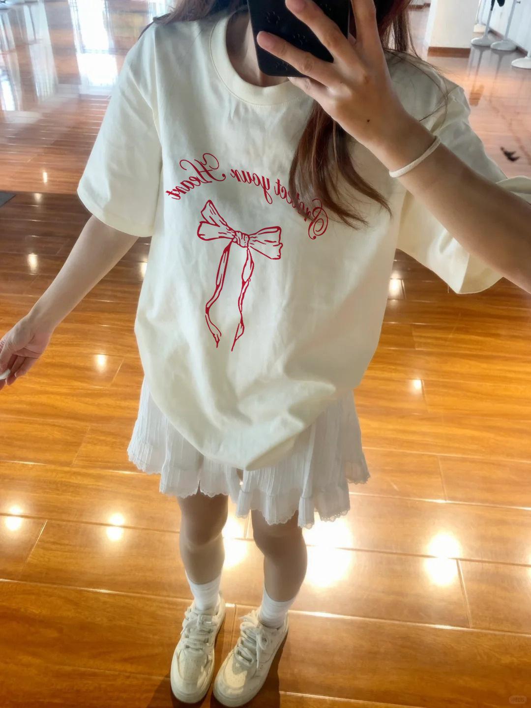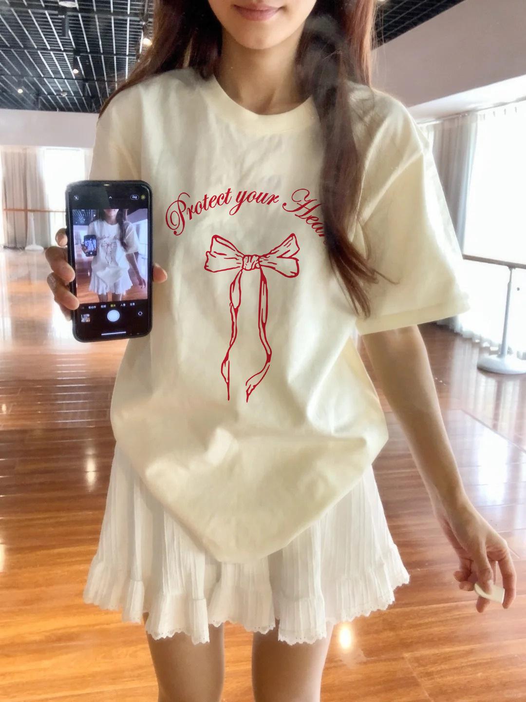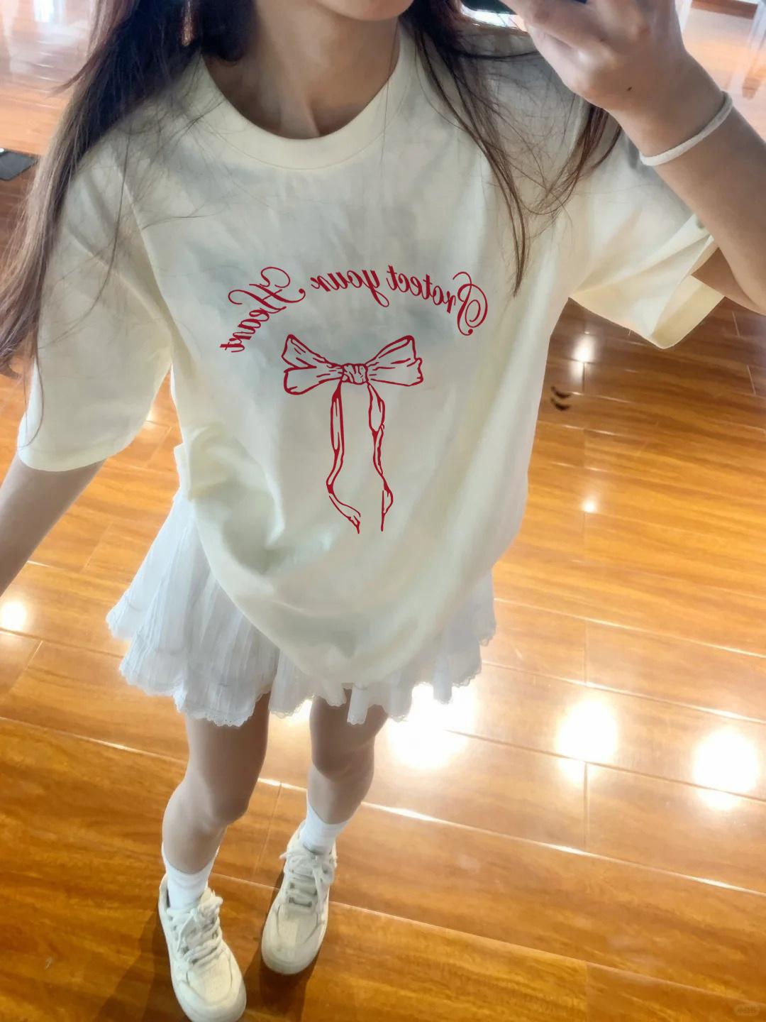 Verano 2025 Nuevo Estilo Hombro Derecho Manga Corta para Mujer Lazo Estampado Algodón Camiseta Básica Casual Holgada Cuello Redondo