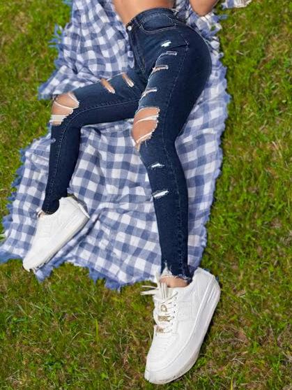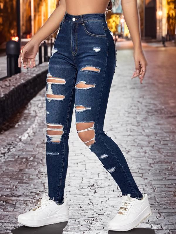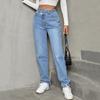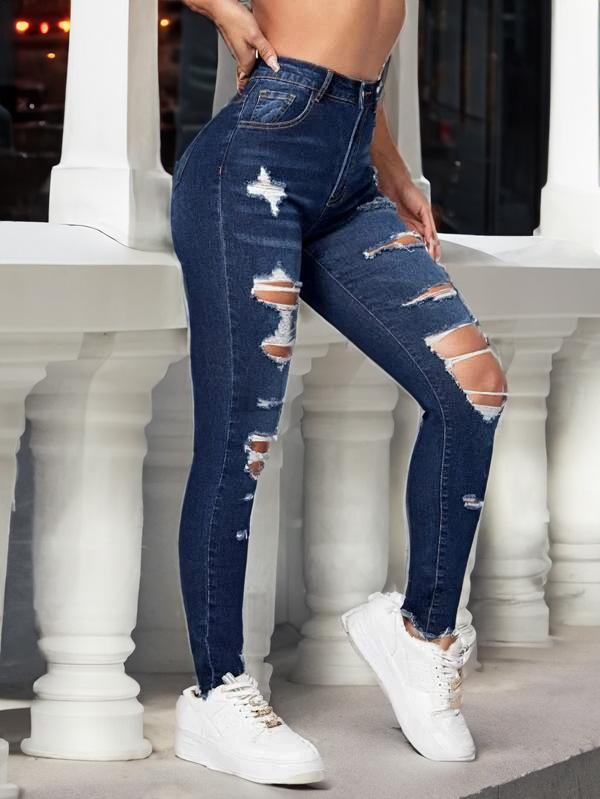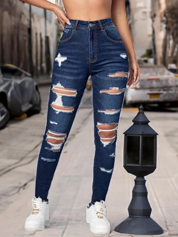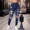 Amazon Ventas Directas de Fábrica Pantalones Casuales Cintura Alta Alta Elasticidad Jeans Lavados Pantalones Rotos para Mujer Nuevo Transfronterizo Europeo y Americano