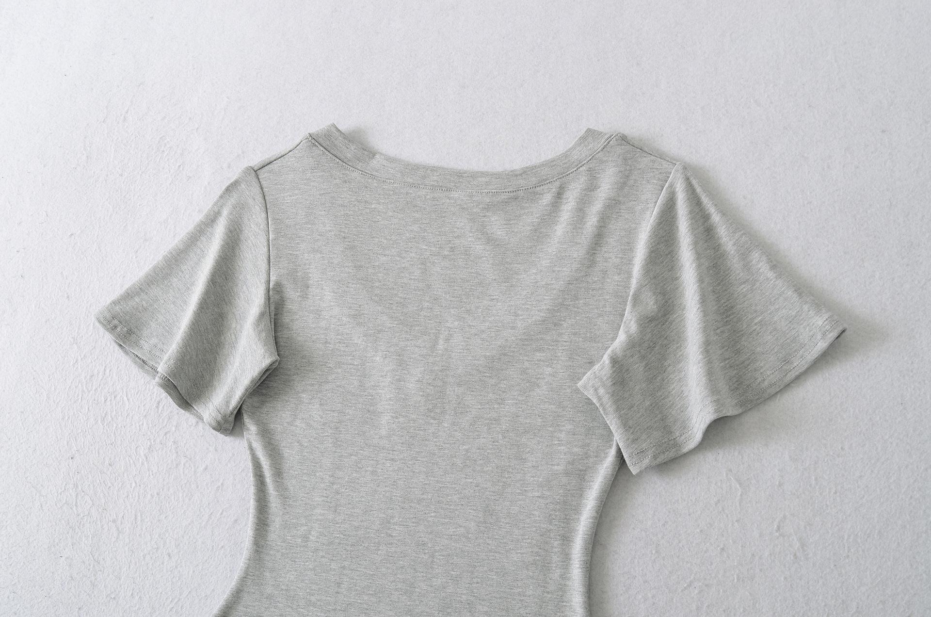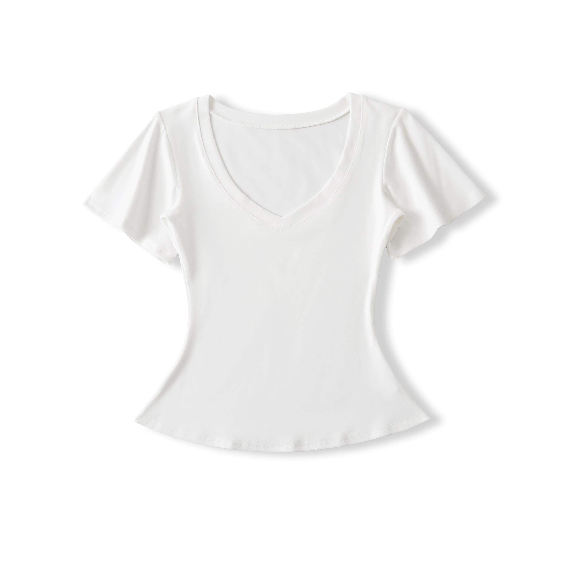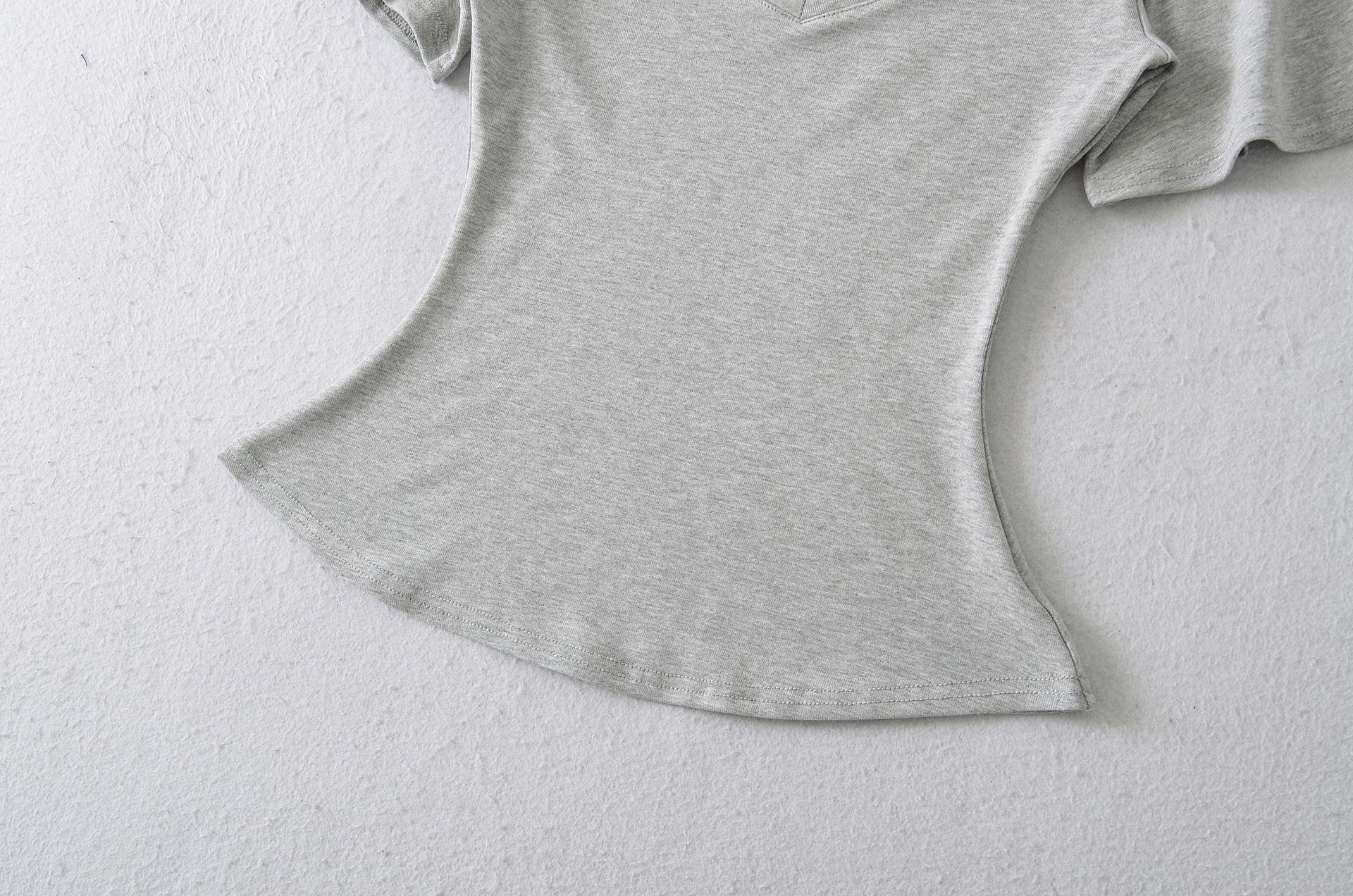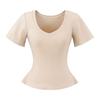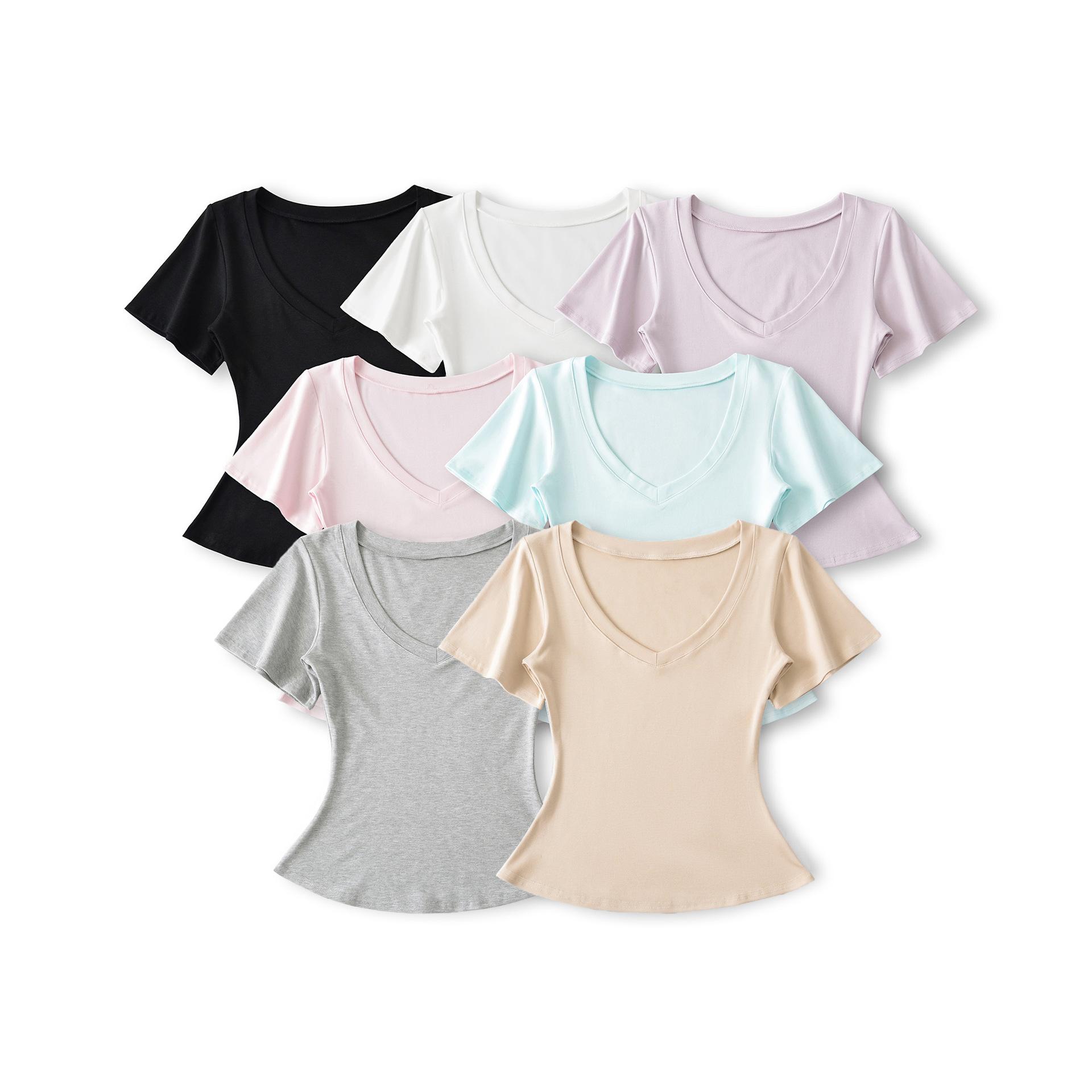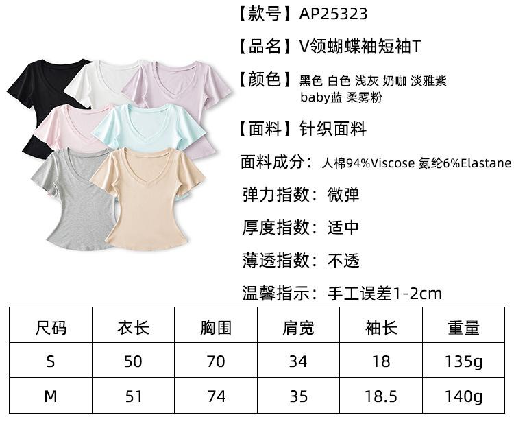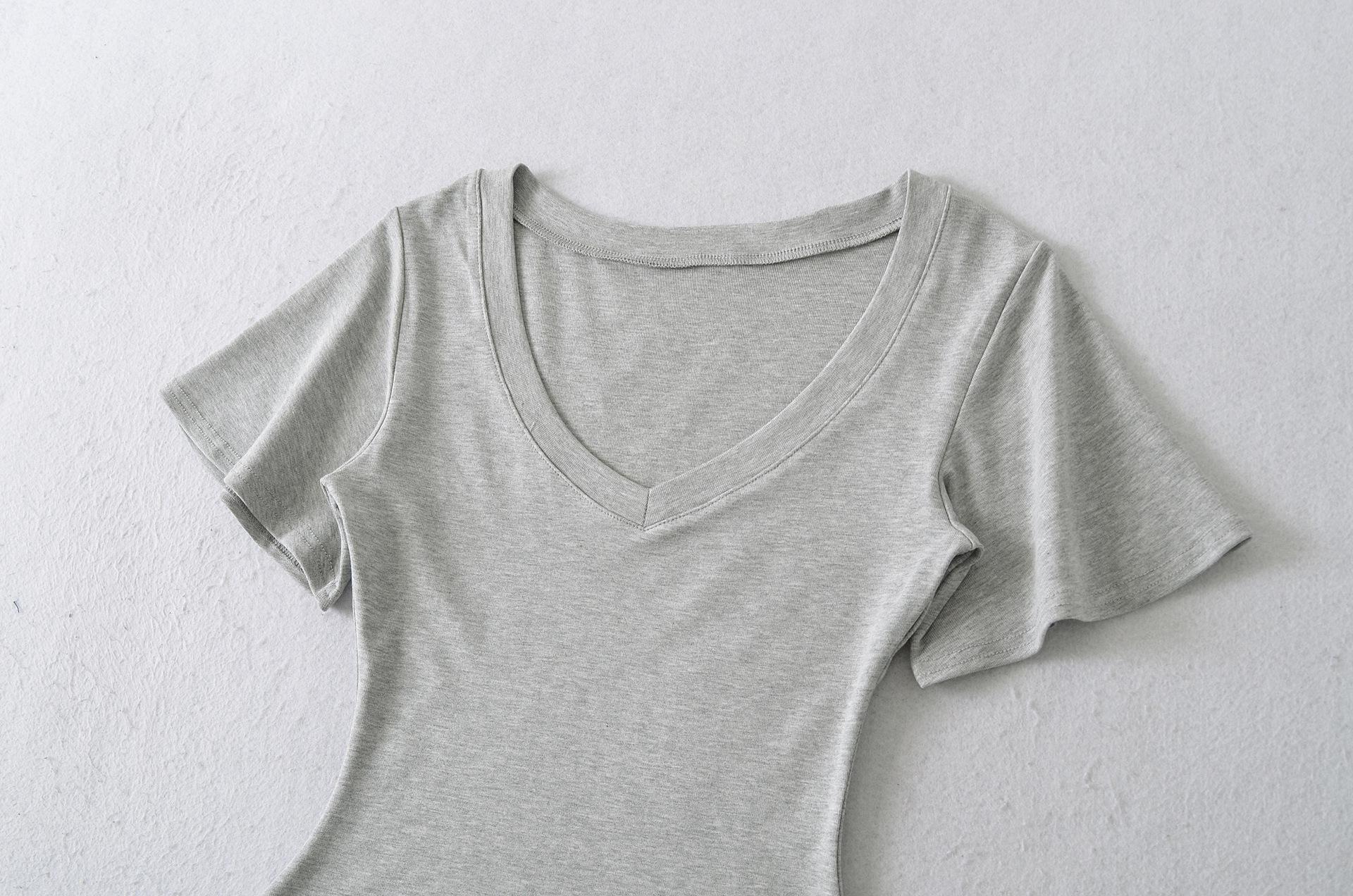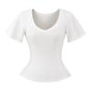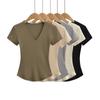 25323-Camiseta de Moda Sexy de Manga Corta con Cuello en V Estilo Europeo y Americano para Mujer 2025 Nueva Camiseta Top Bajo de Aspecto Adelgazante Sexy