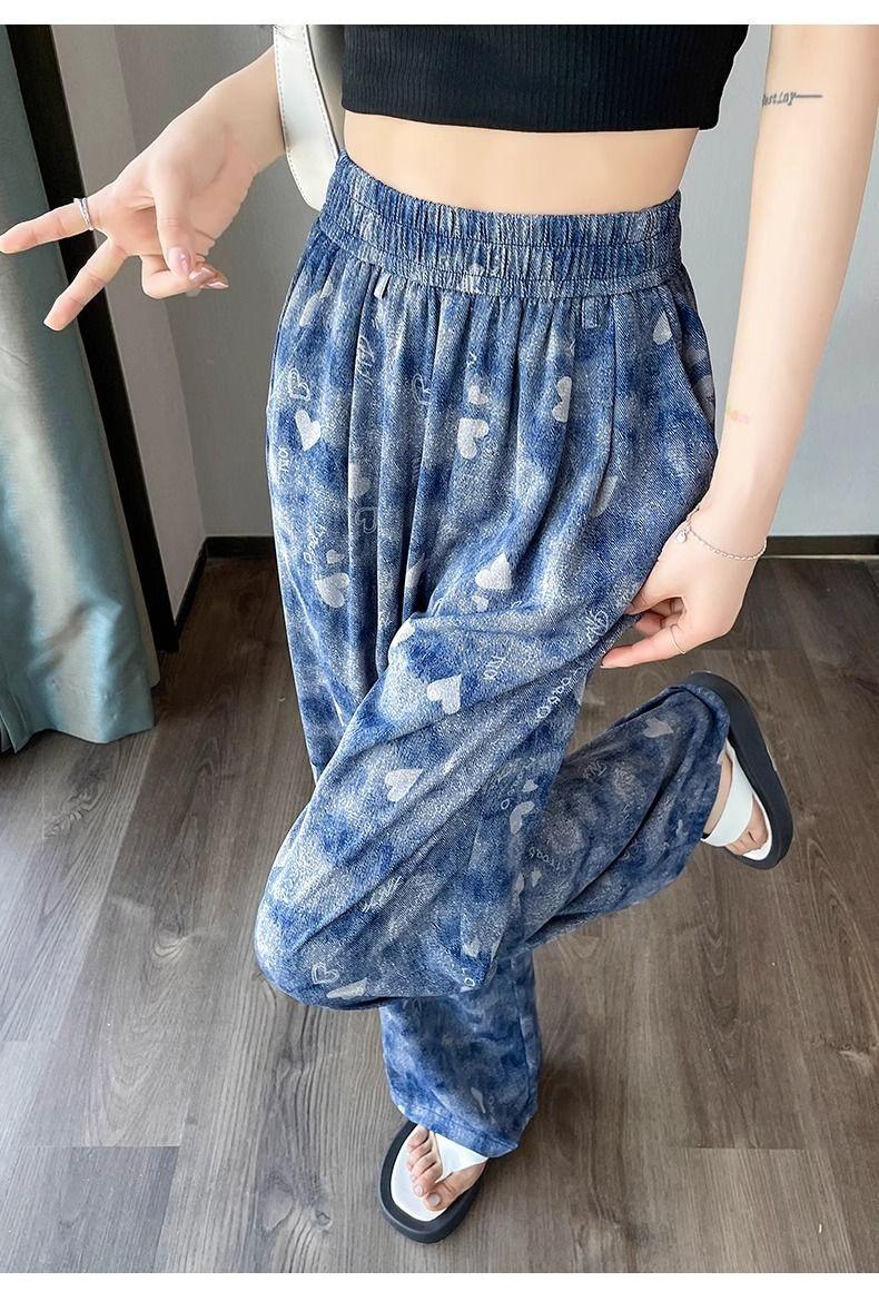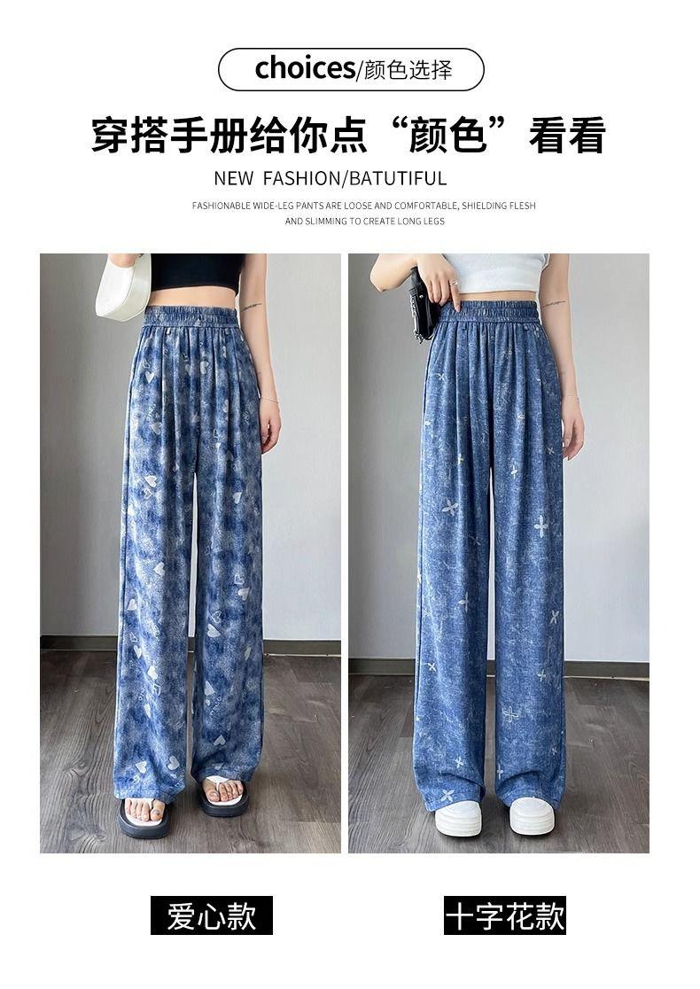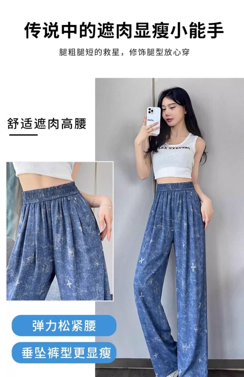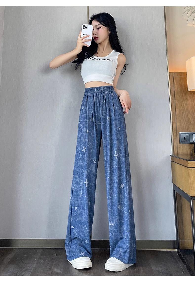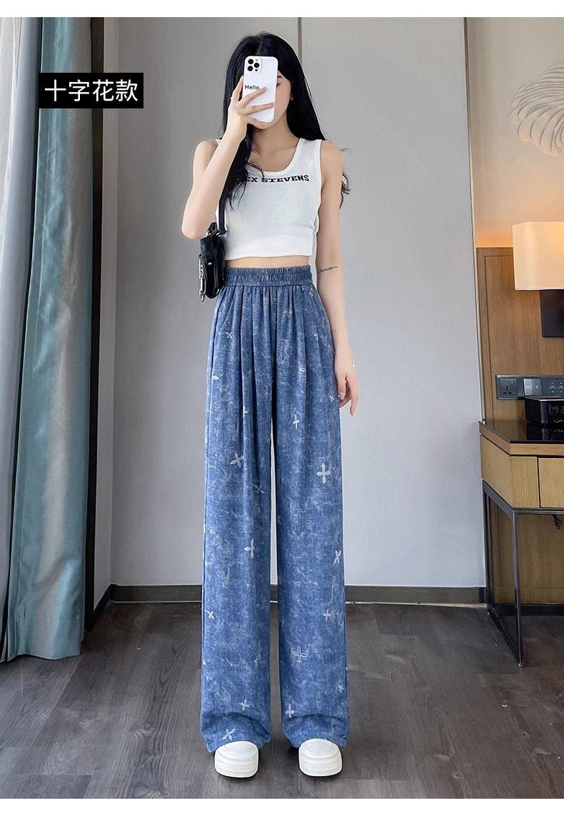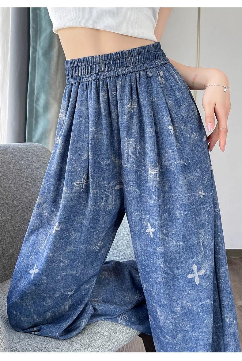Pantalones de Verano de Seda de Hielo de Pierna Ancha para Mujer, Delgados Casuales de Cintura Alta Holgados Talla Grande con Caída Retro Estampados de Mezclilla Rectos