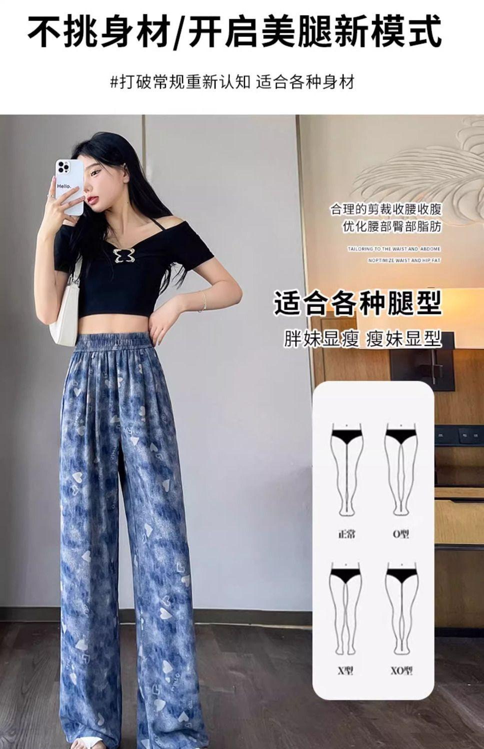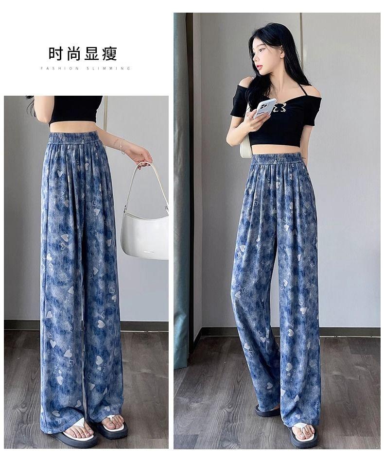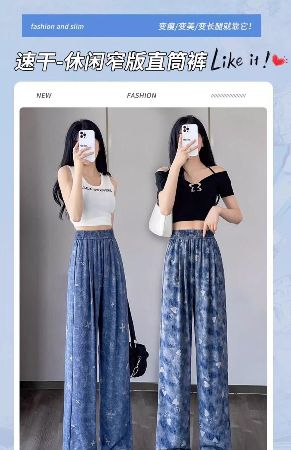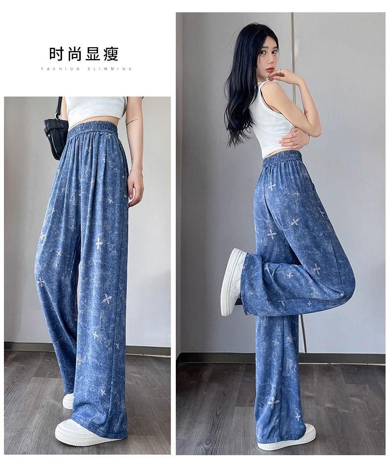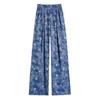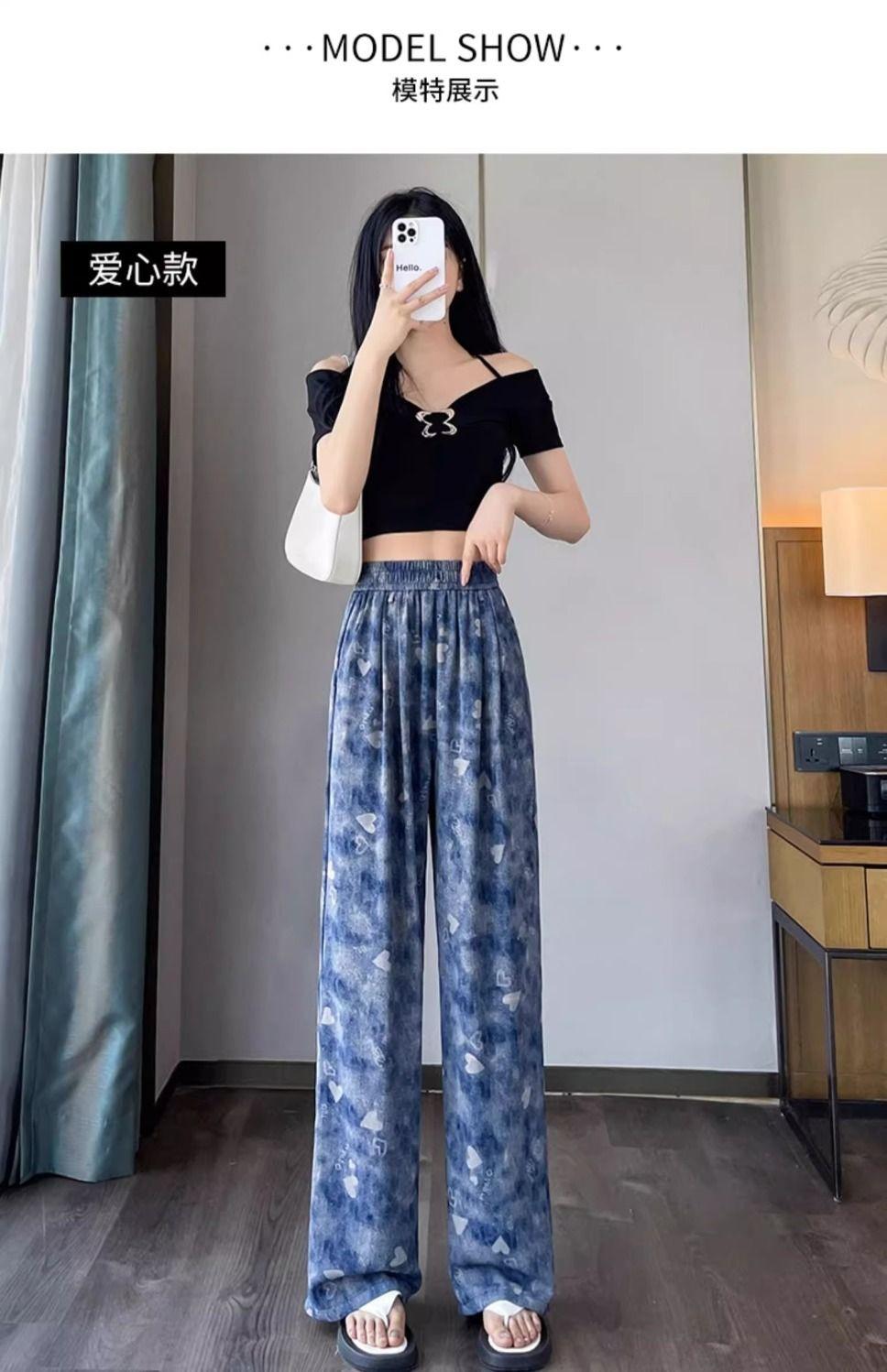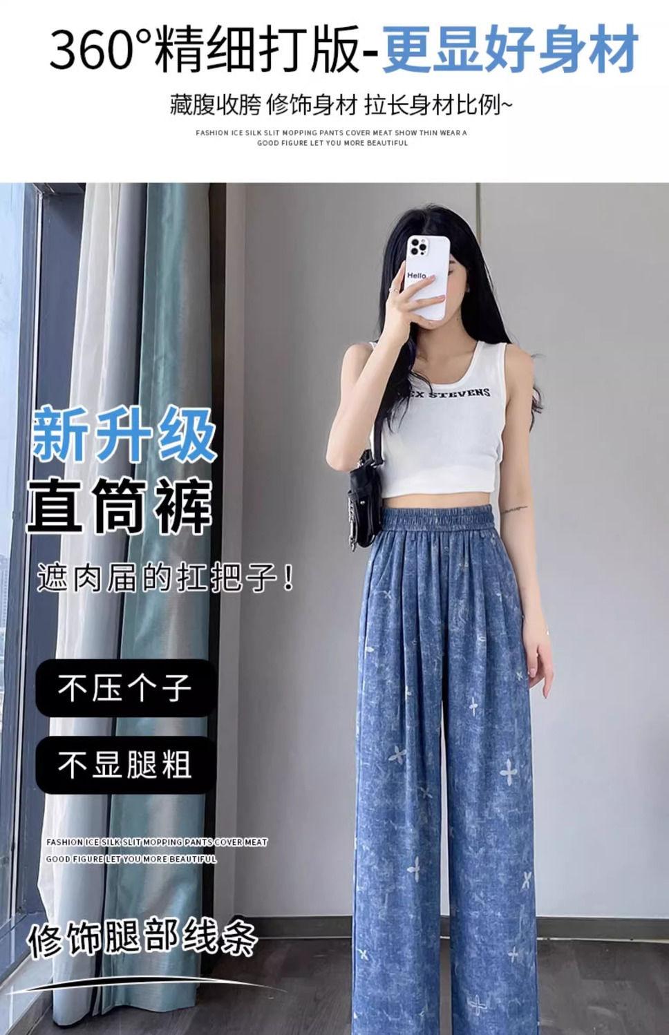 Pantalones de Verano de Seda de Hielo de Pierna Ancha para Mujer, Delgados Casuales de Cintura Alta Holgados Talla Grande con Caída Retro Estampados de Mezclilla Rectos