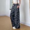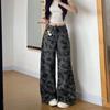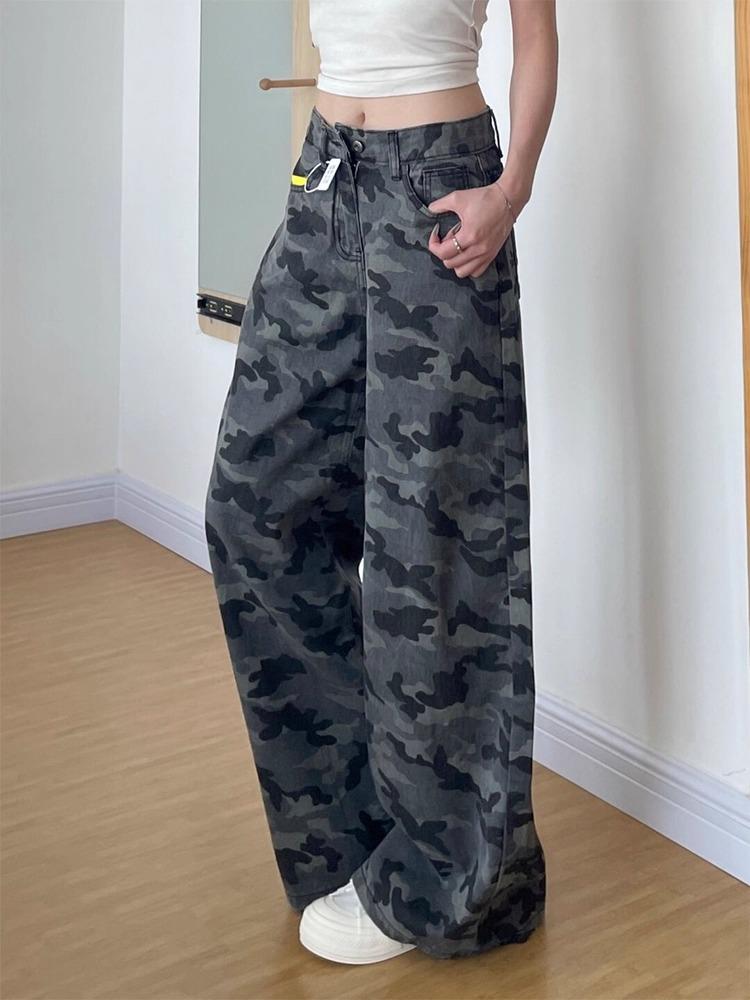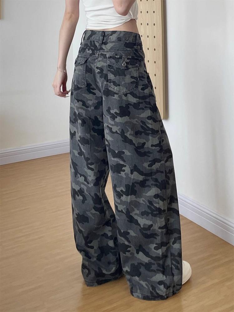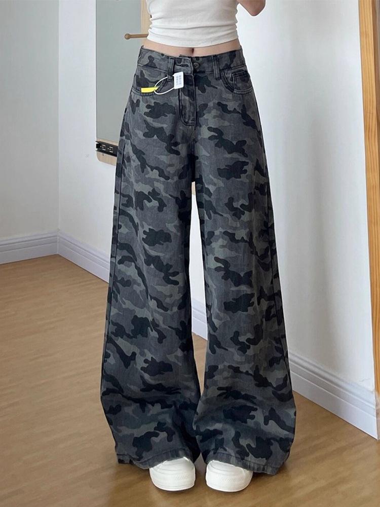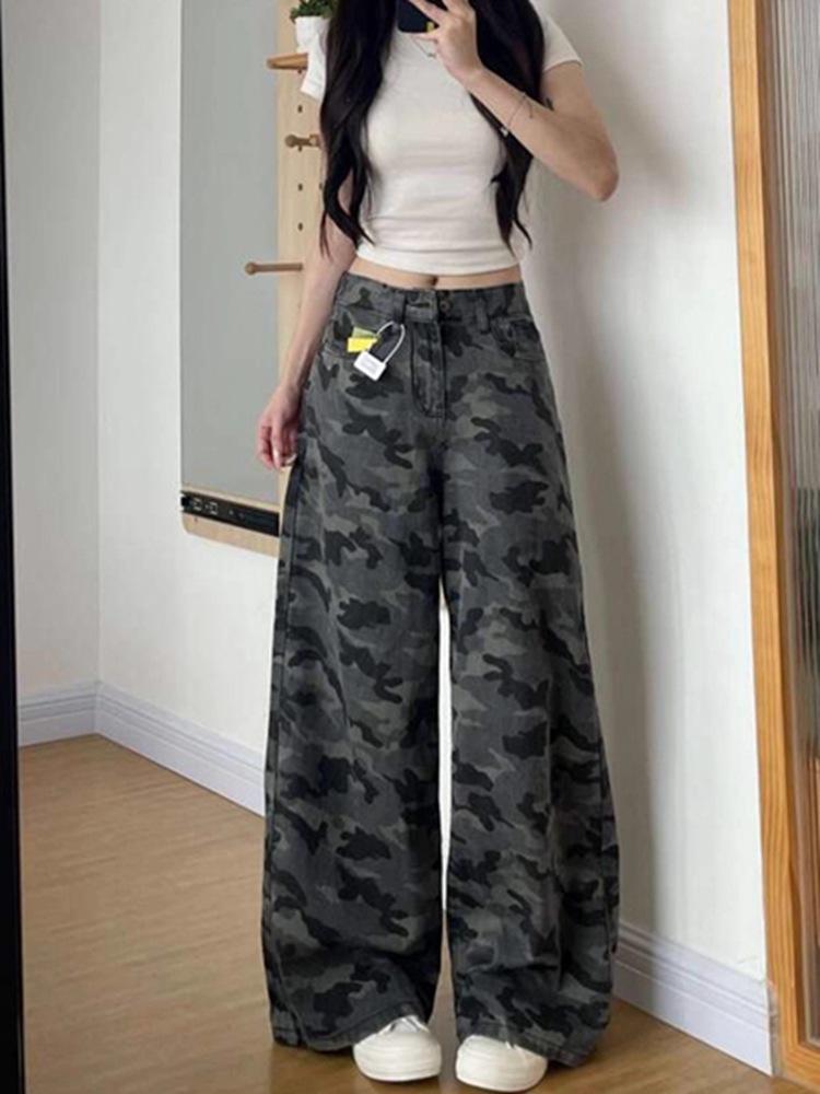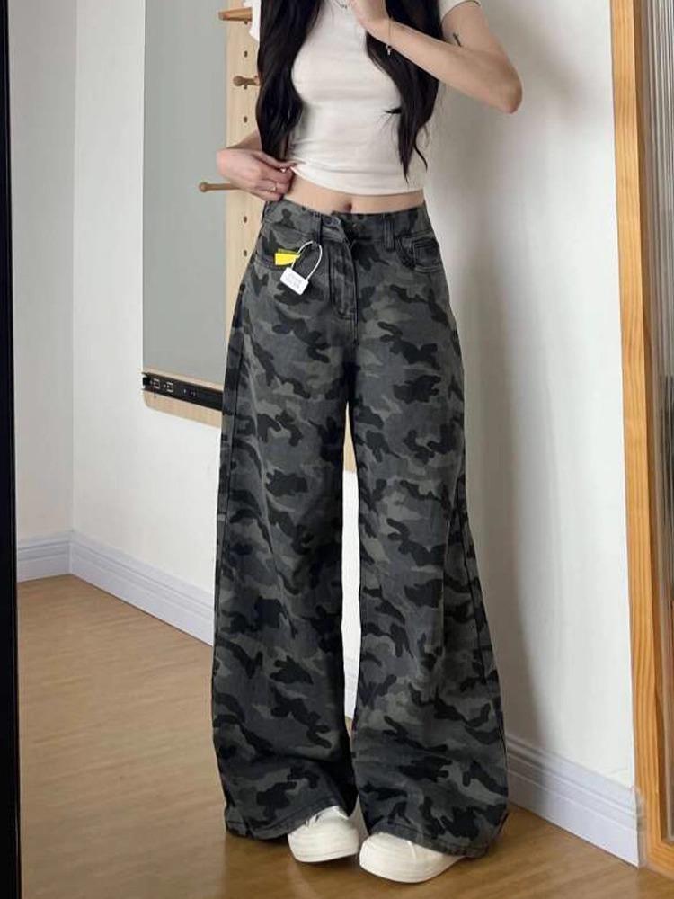 Jeans de Camuflaje Americano de Talla Grande para Mujer 2025 Otoño Sentido del Diseño MM Gorditas Cintura Alta Casual Sueltos Pierna Ancha