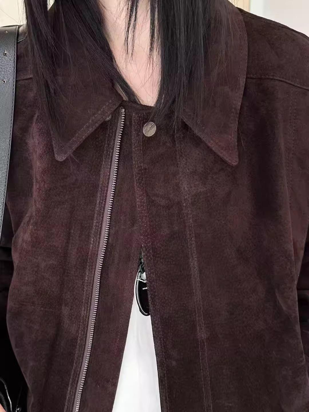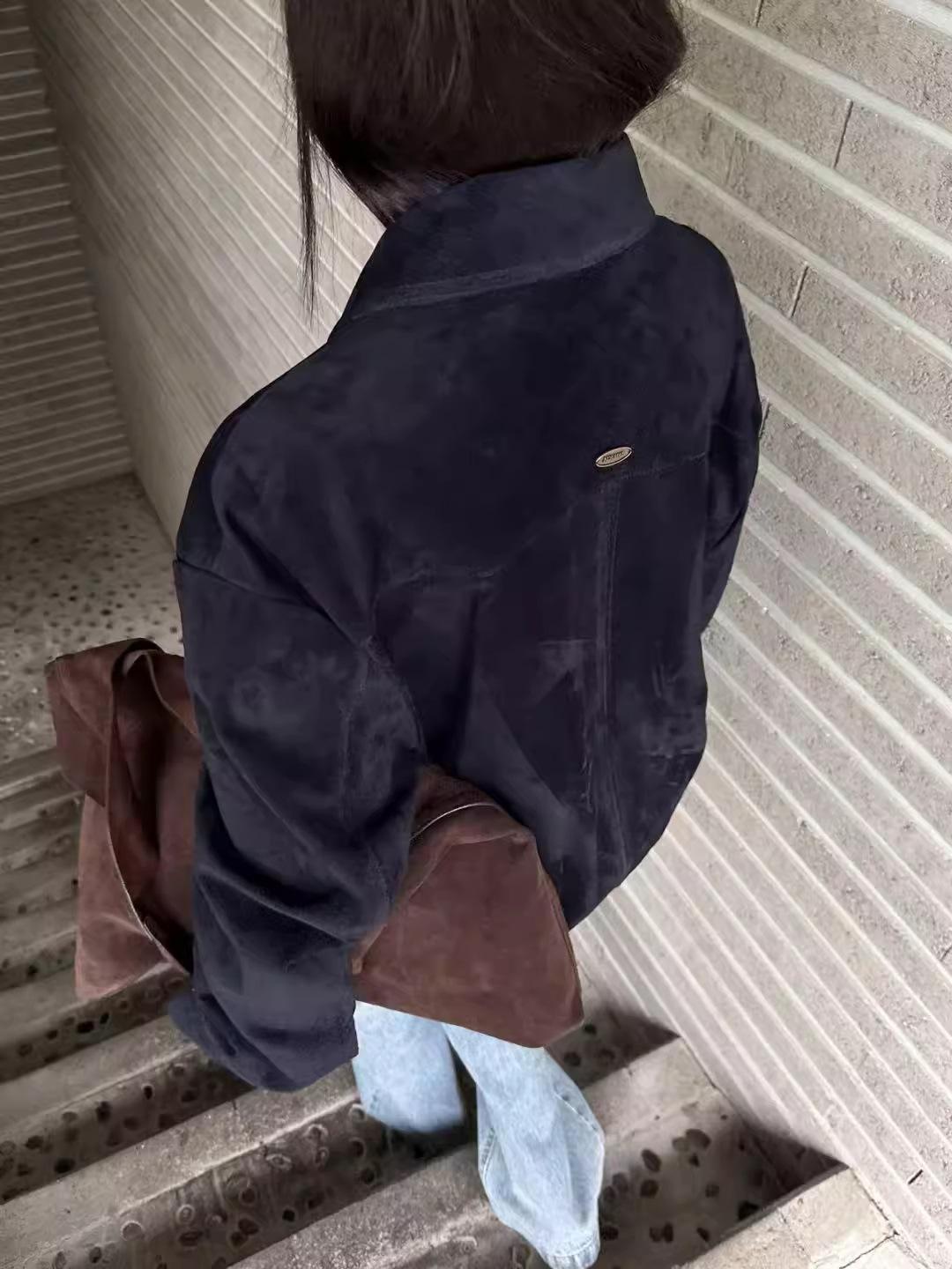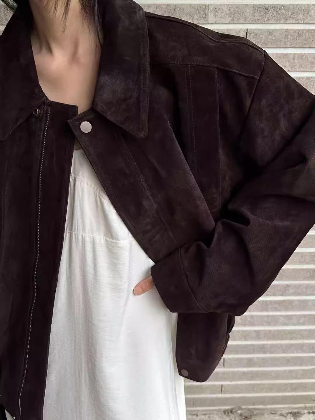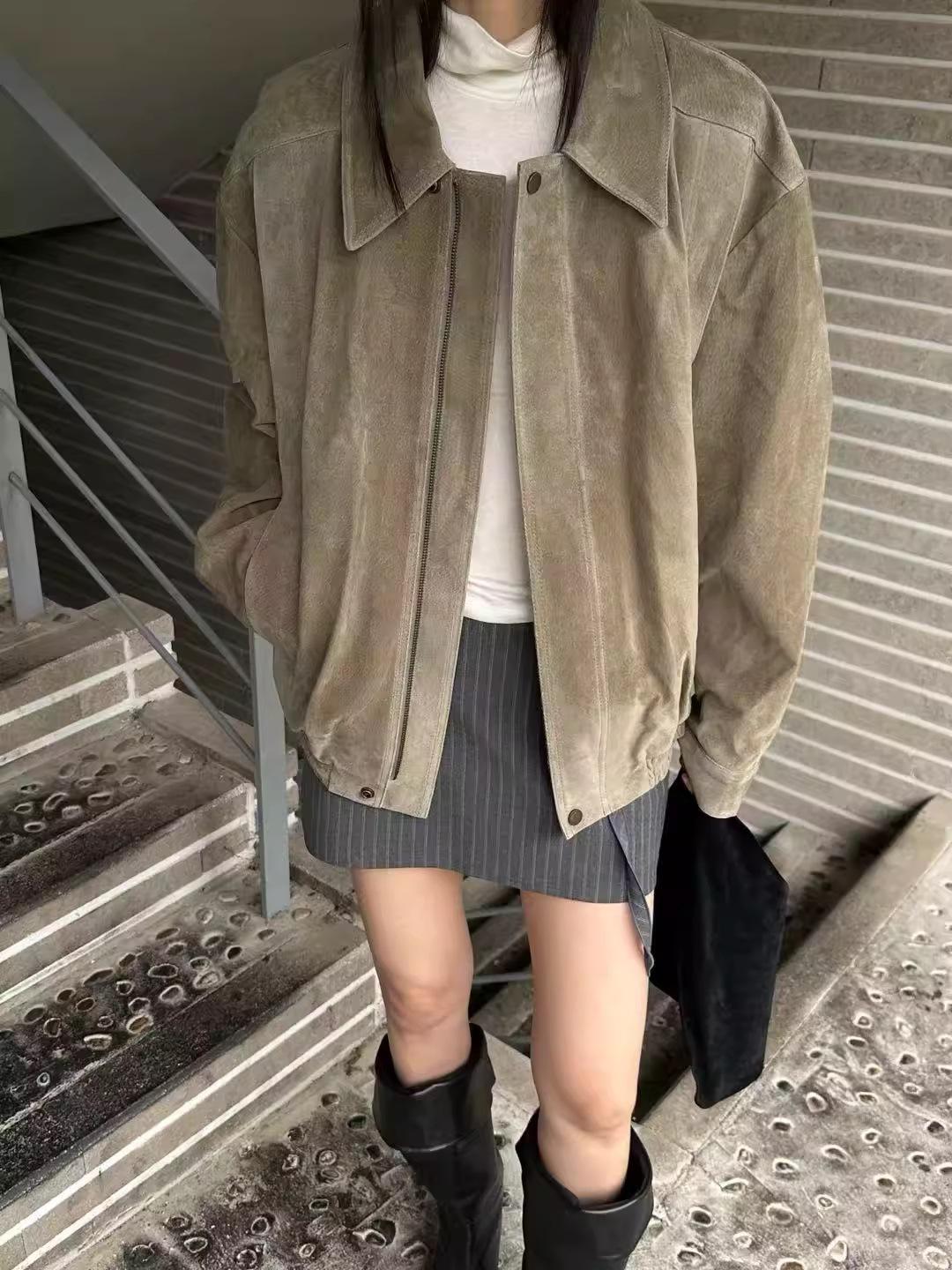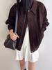 Chaqueta de Cuero Gamuza Raw C con Solapa y Cierre para Mujer 2025 Otoño Vintage Color Sólido Holgada Casual Top norm*l