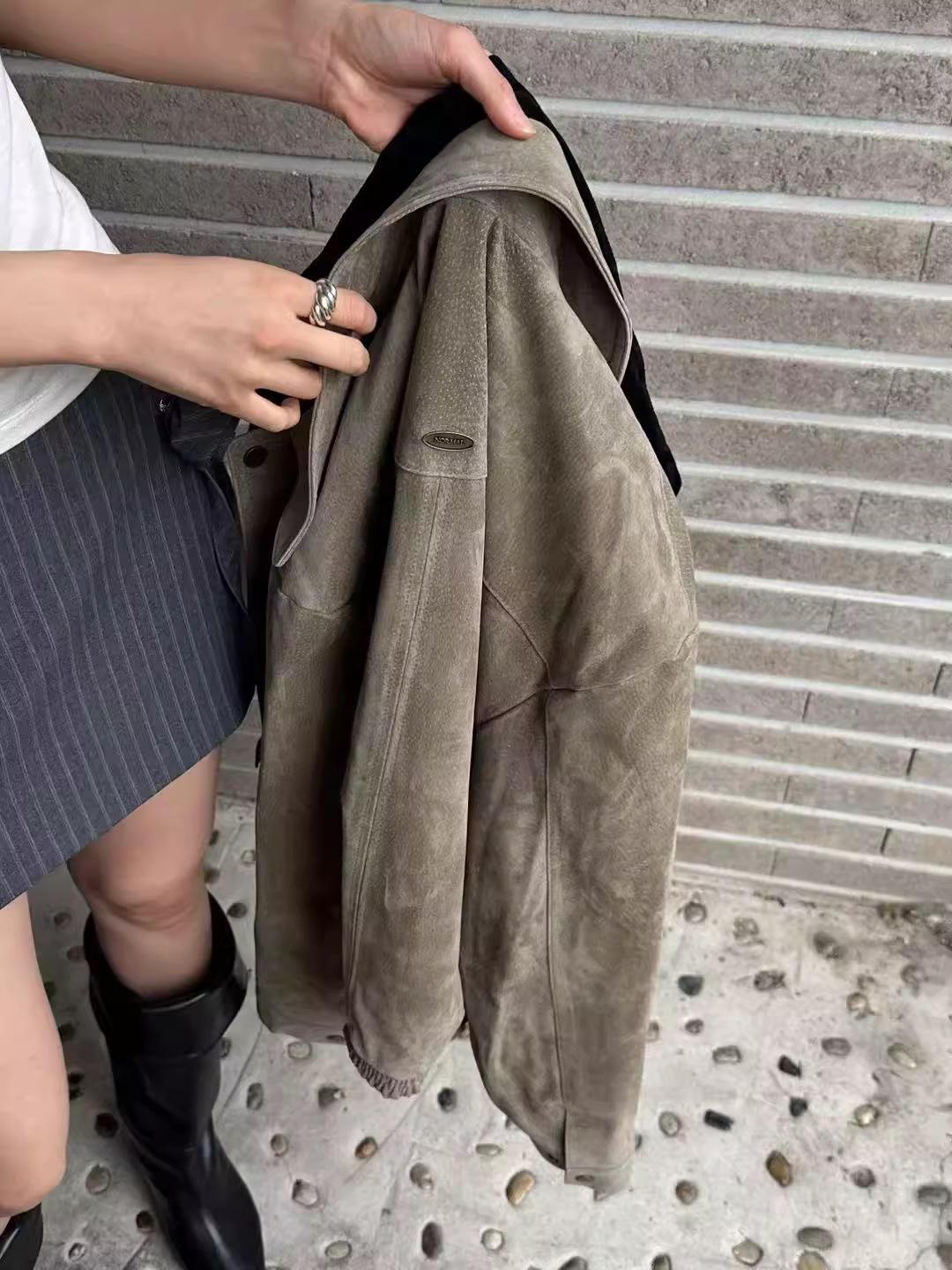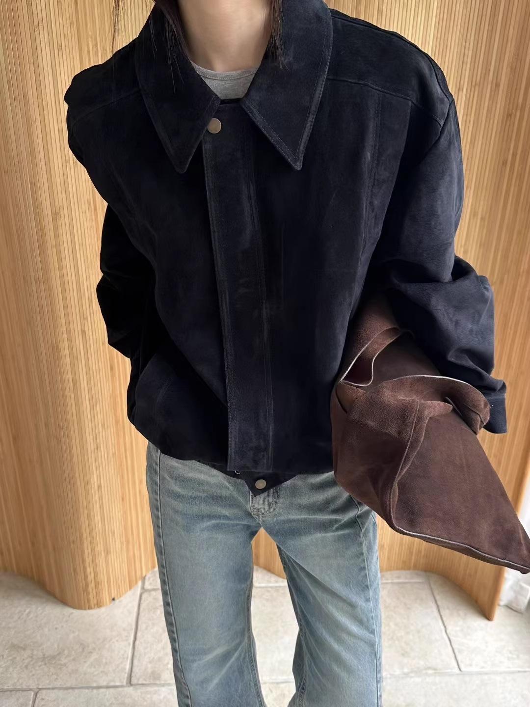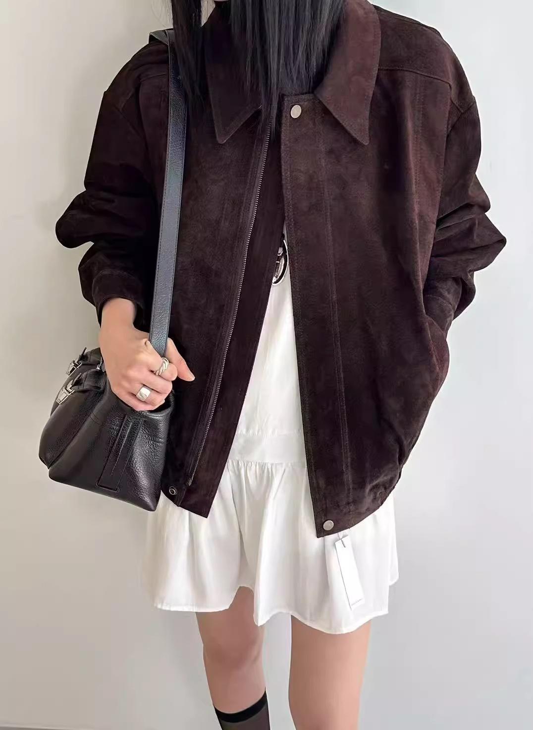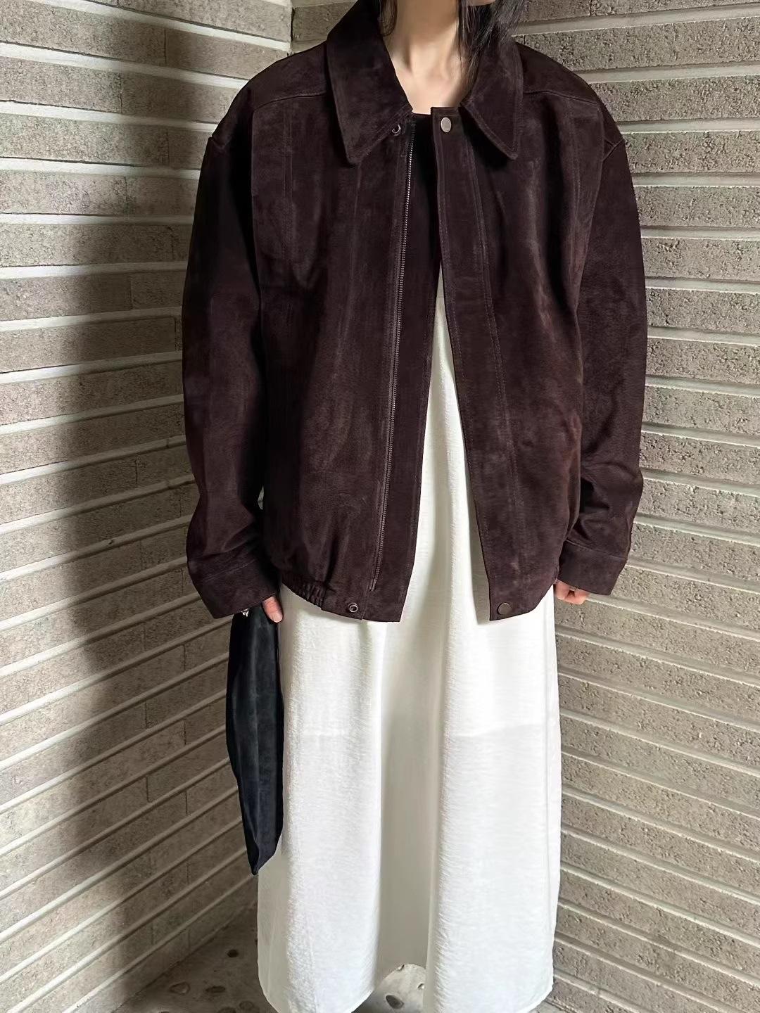 Chaqueta de Cuero Gamuza Raw C con Solapa y Cierre para Mujer 2025 Otoño Vintage Color Sólido Holgada Casual Top norm*l