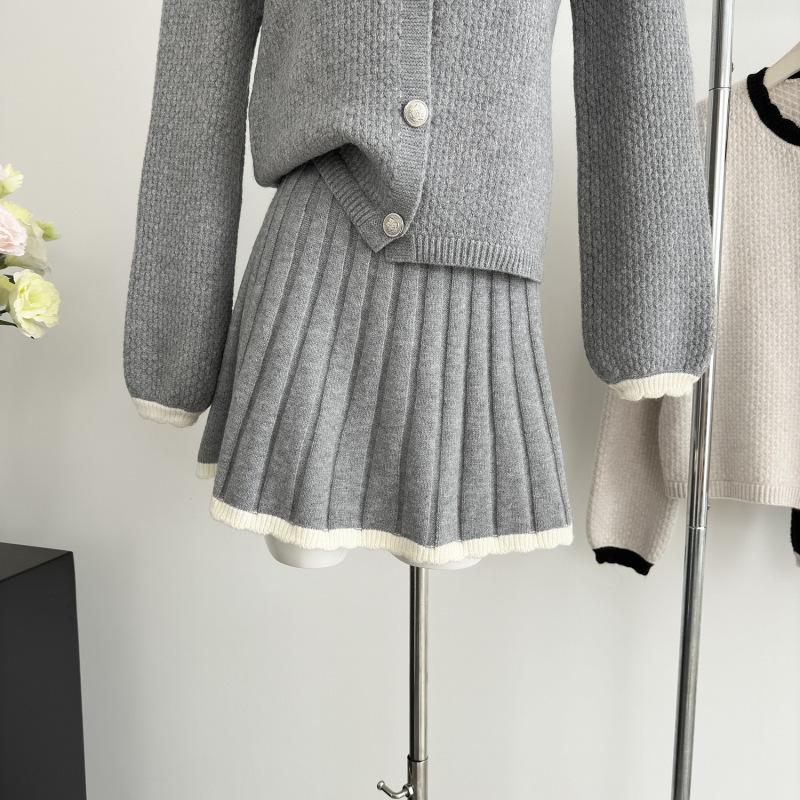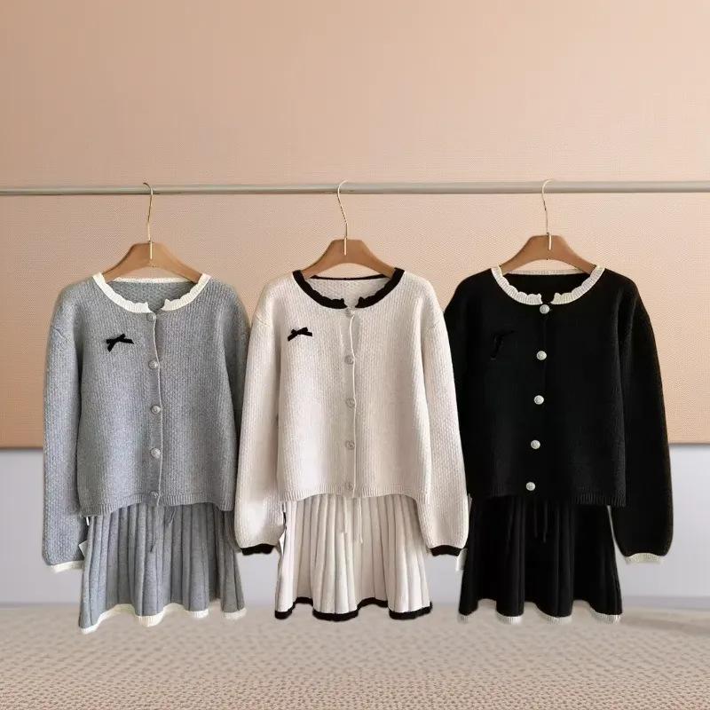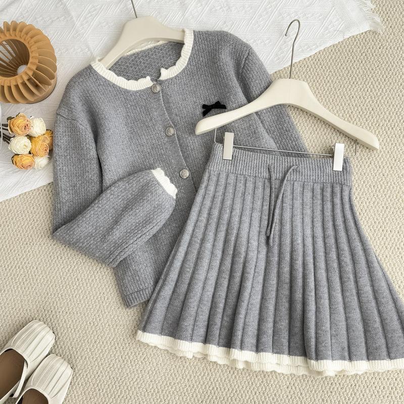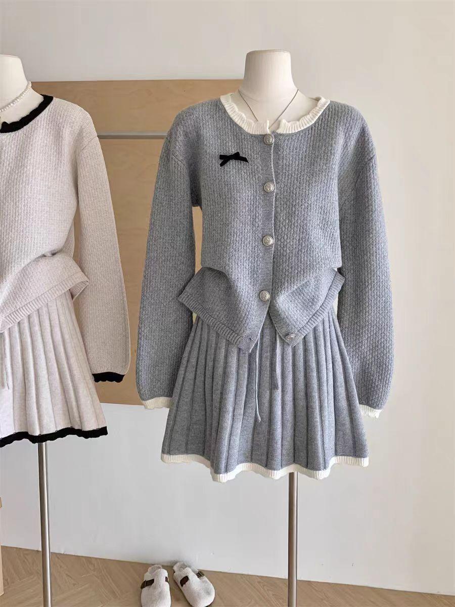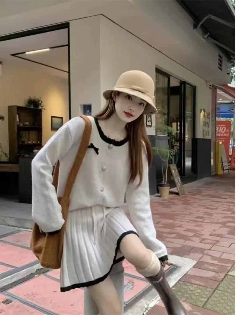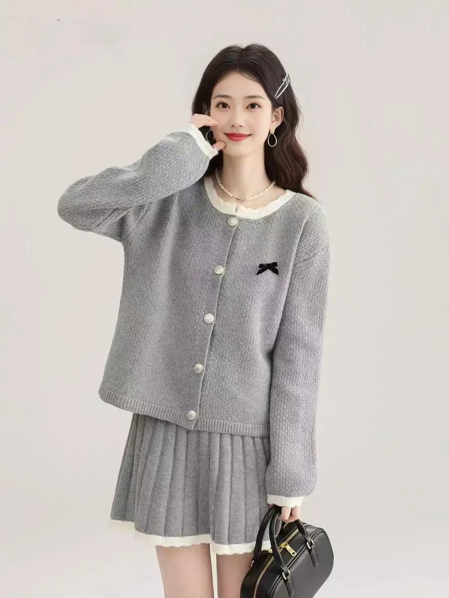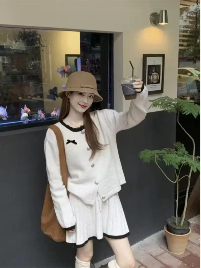 Conjunto de Cárdigan de Punto Fresco Francés para Mujer Otoño Nuevo Estilo Coreano Holgado ins Falda Corta Plisada Conjunto de Dos Piezas