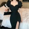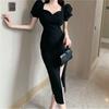 Vestido Dulce y Fresco Verano 2025 Nuevo Manga Abullonada Francesa Adelgazante Negro Falda Larga con Abertura Mujer