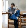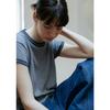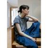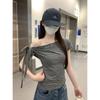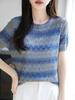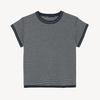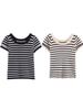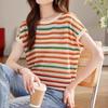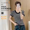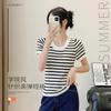 Camiseta de manga corta de punto mo*ndal para mujer estilo de verano y otoño rayas finas azul marino estilo coreano versátil hombro recto cuello redondo top