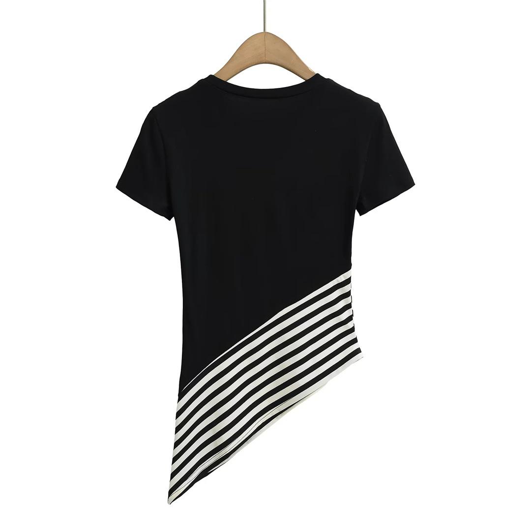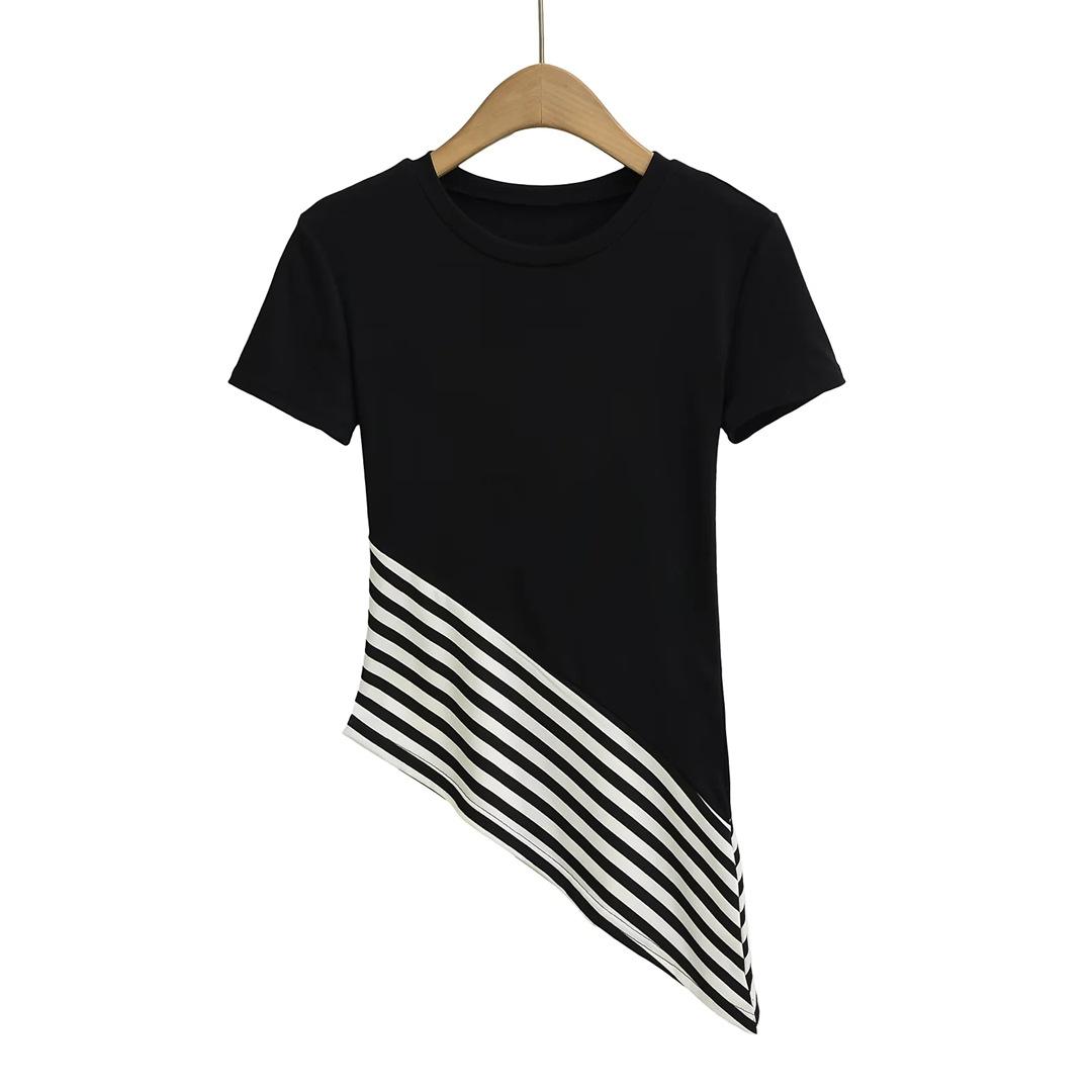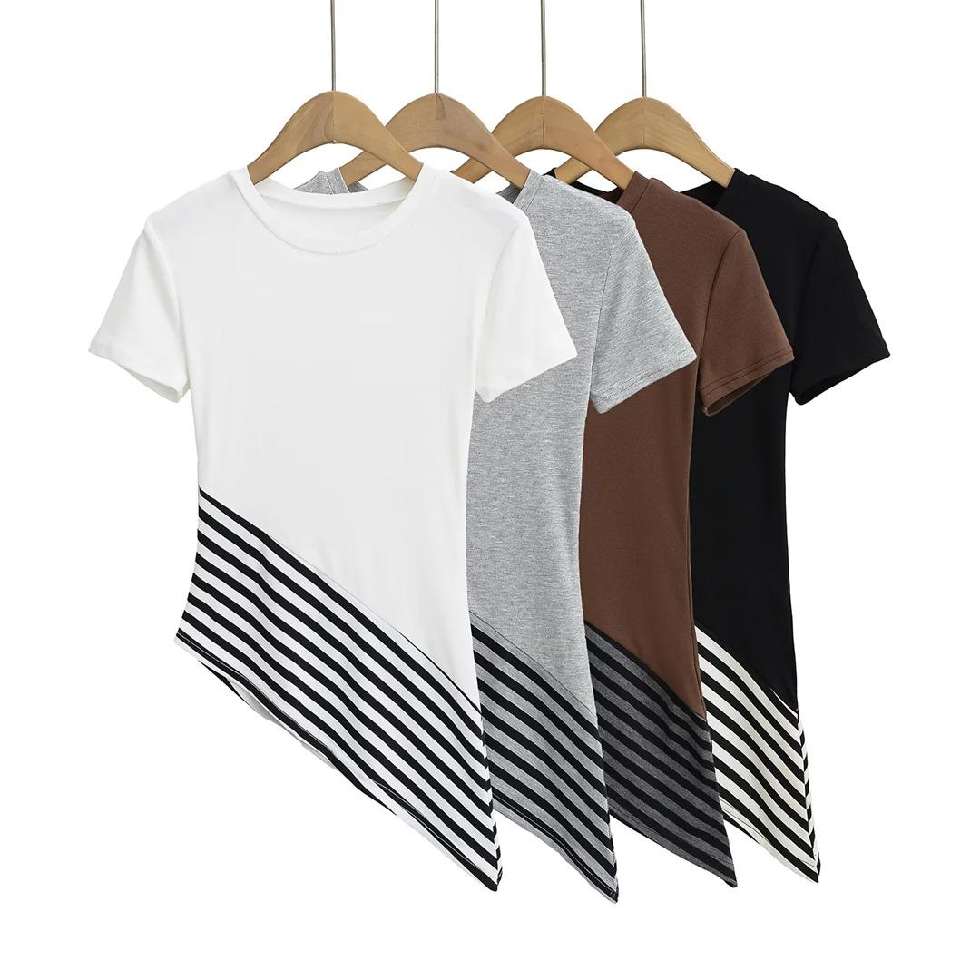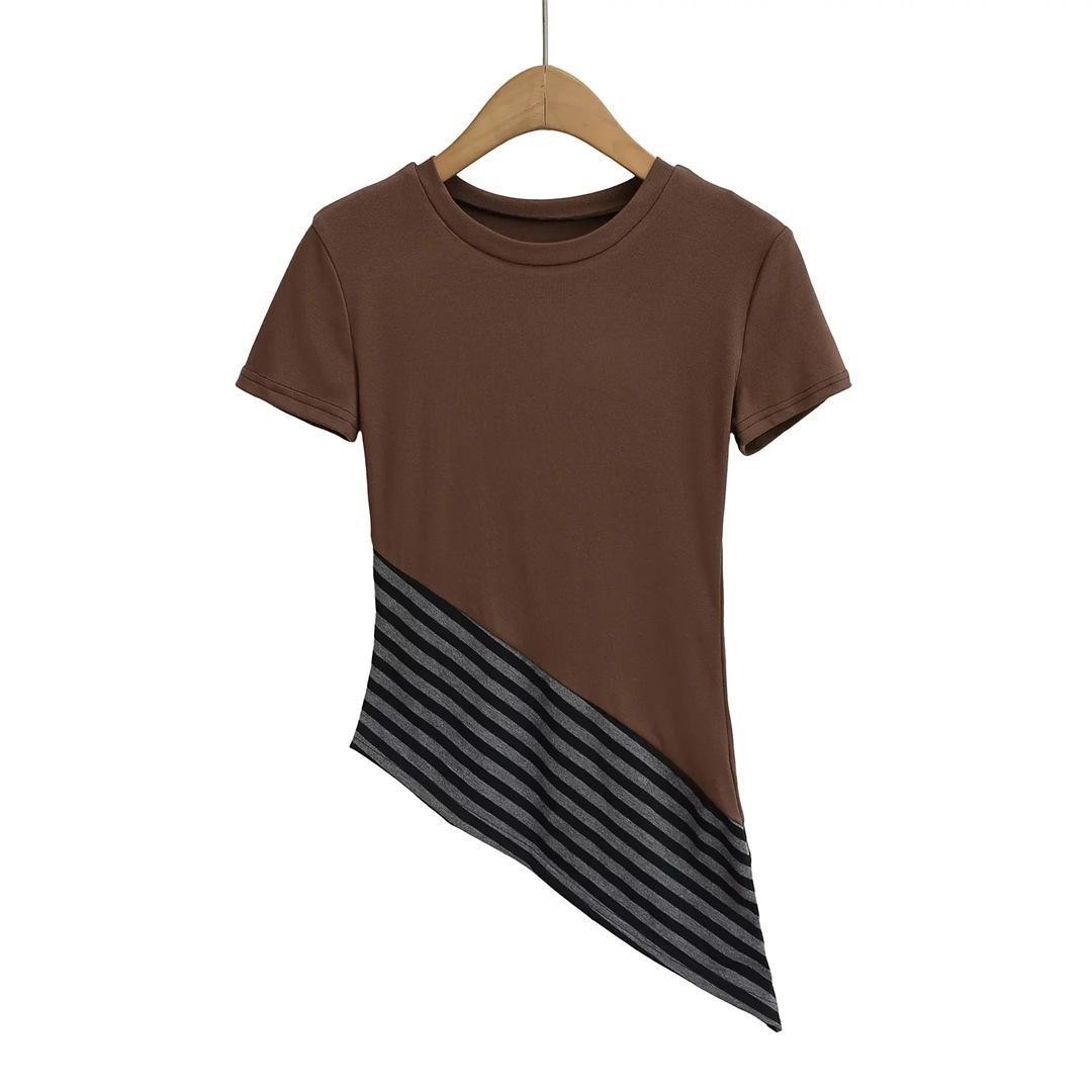 Playera de Manga Corta con Cuello Redondo y Color en Contraste para Mujer, Diseño Nicho Europeo y Americano, Combinación de Colores a Rayas Irregulares, Top Ajustado