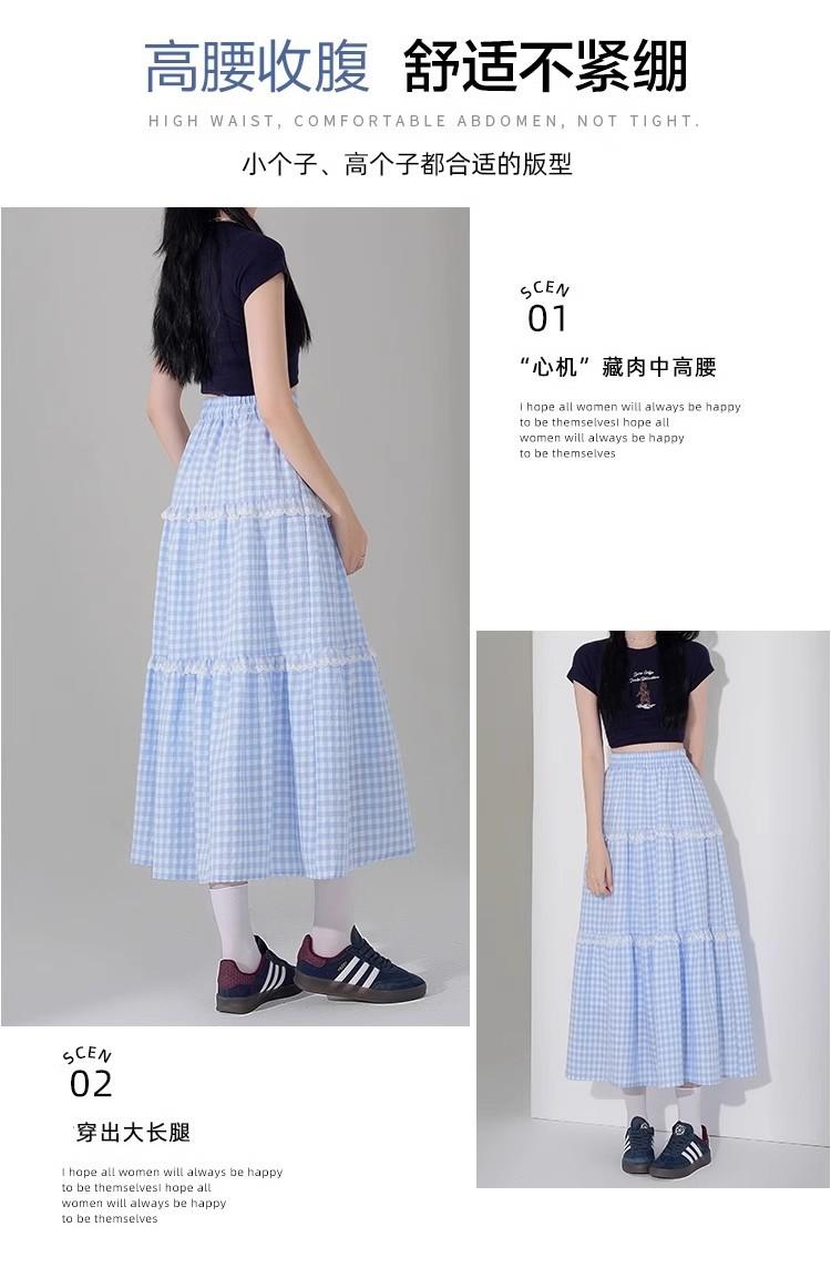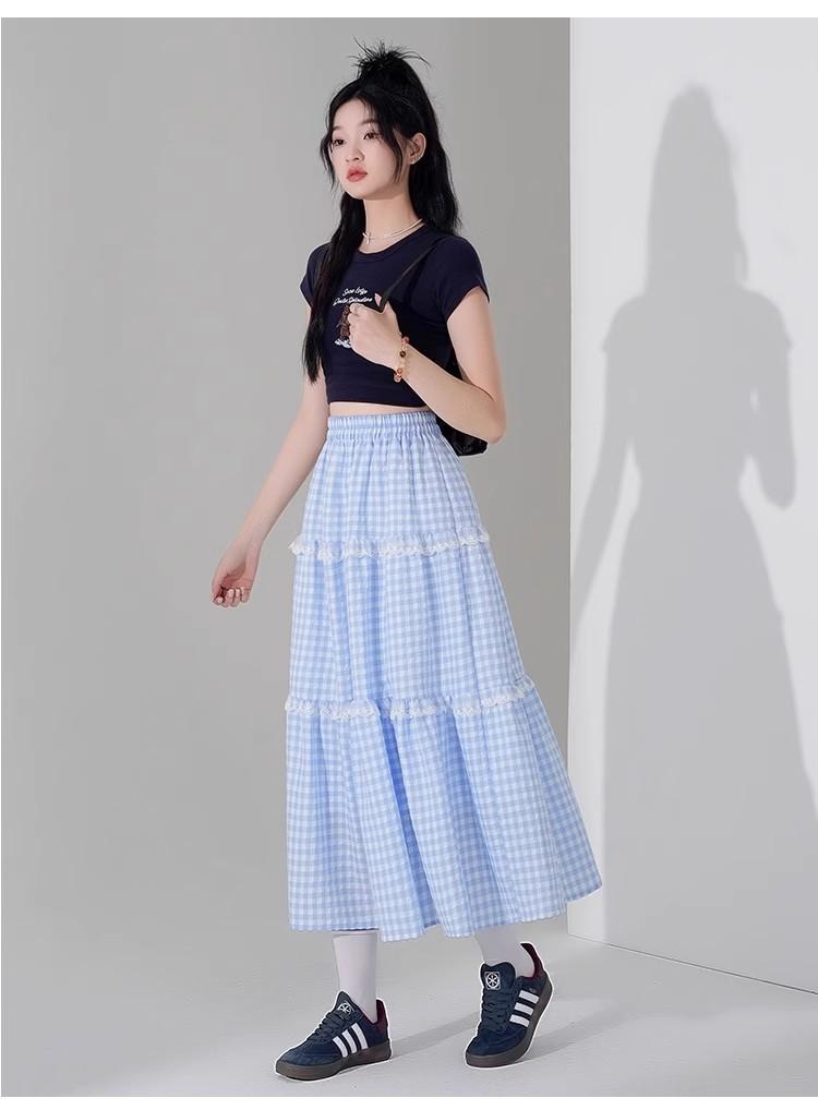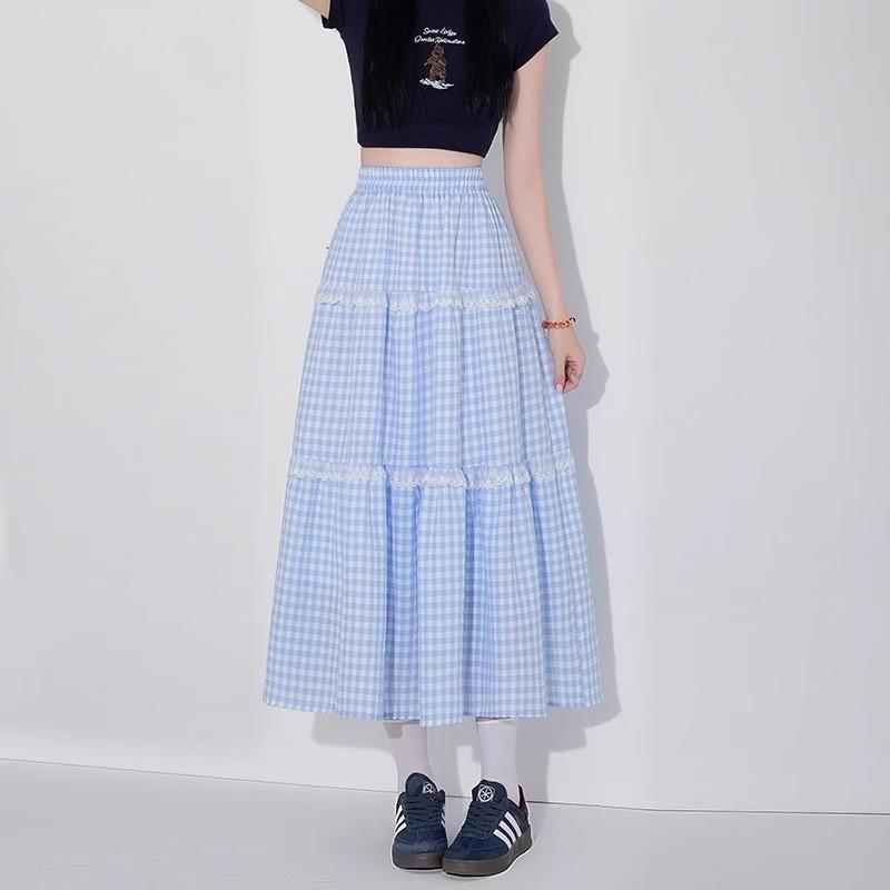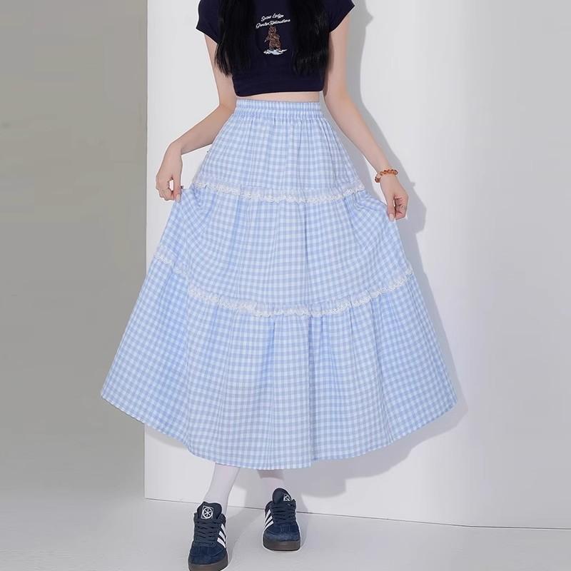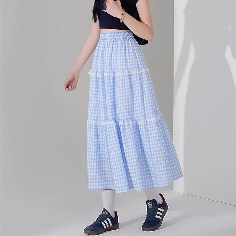 Casual Versátil Temperamento Gran Vuelo Cuadros Azules Media Falda para Mujer Verano Estilo Coreano Dulce Cintura Alta Línea A Pastel Falda Larga