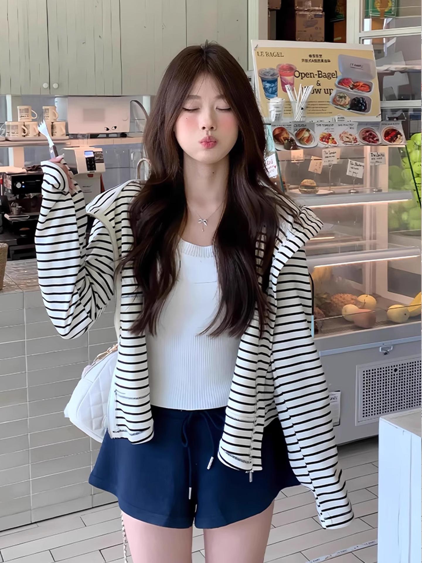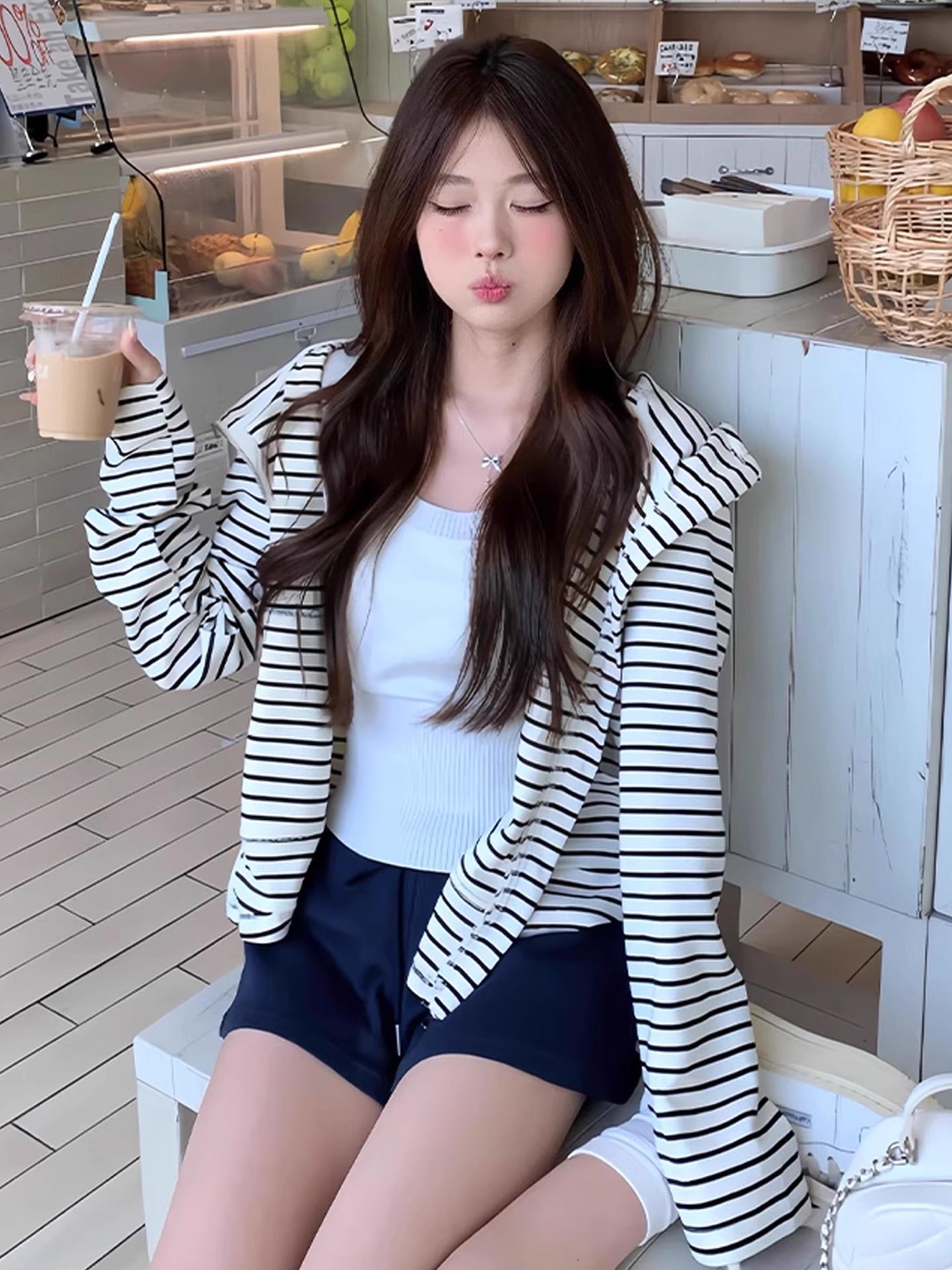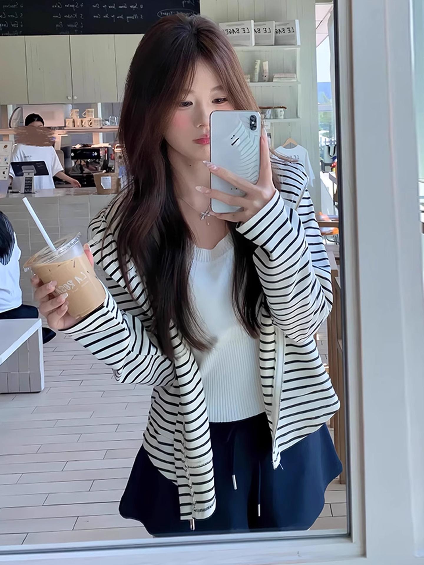 Abrigo Cárdigan Rayado con Capucha Estilo Coreano para Principios de Otoño e Invierno para Mujer Nuevo Casual Ajustado Bolsillo Cremallera Sudadera Top para Mujer