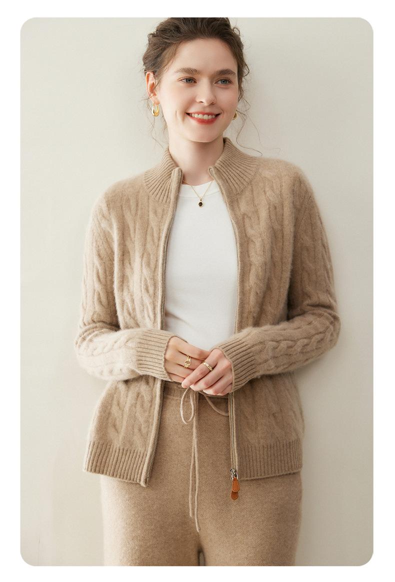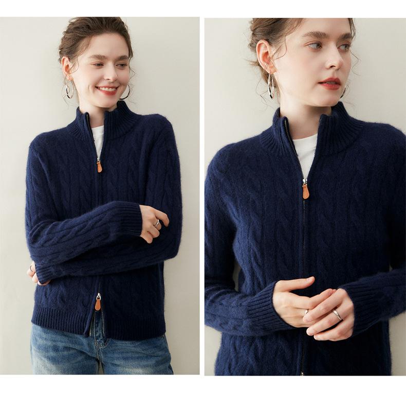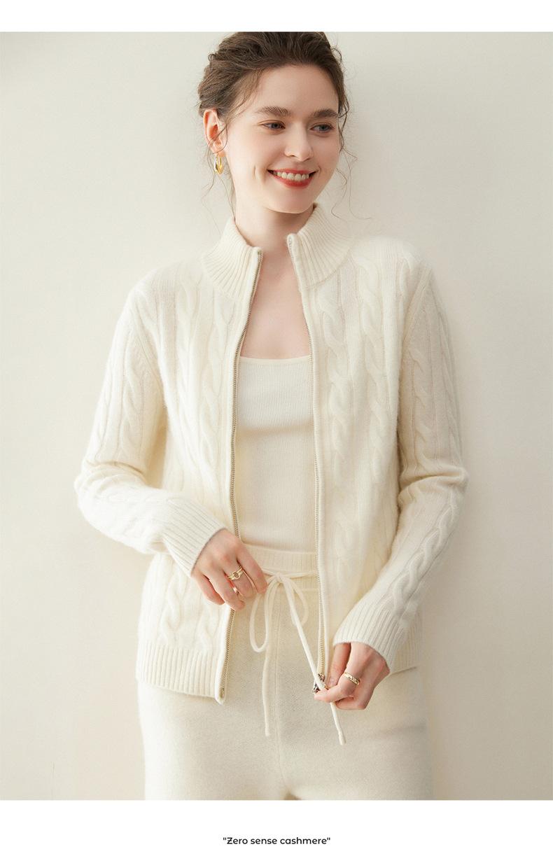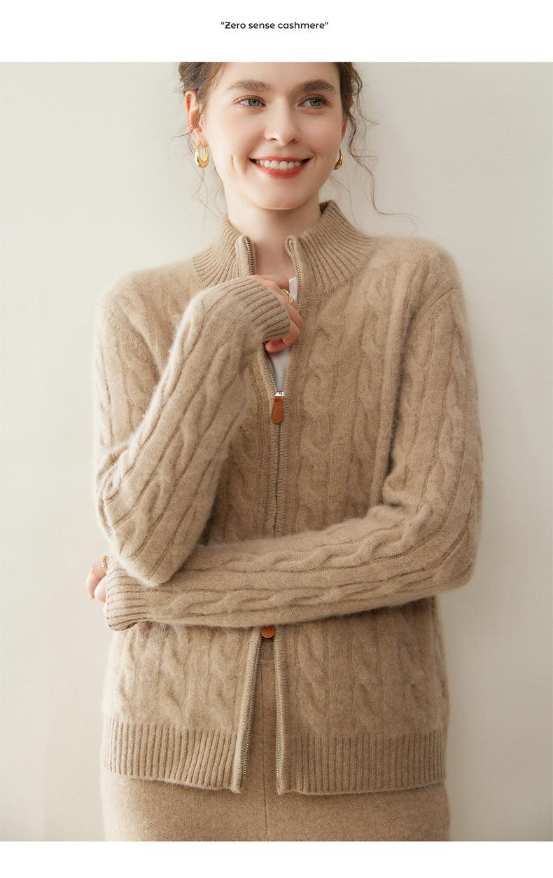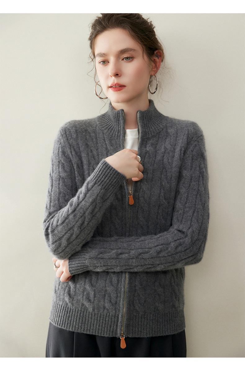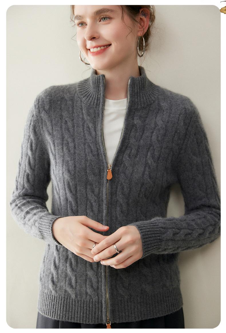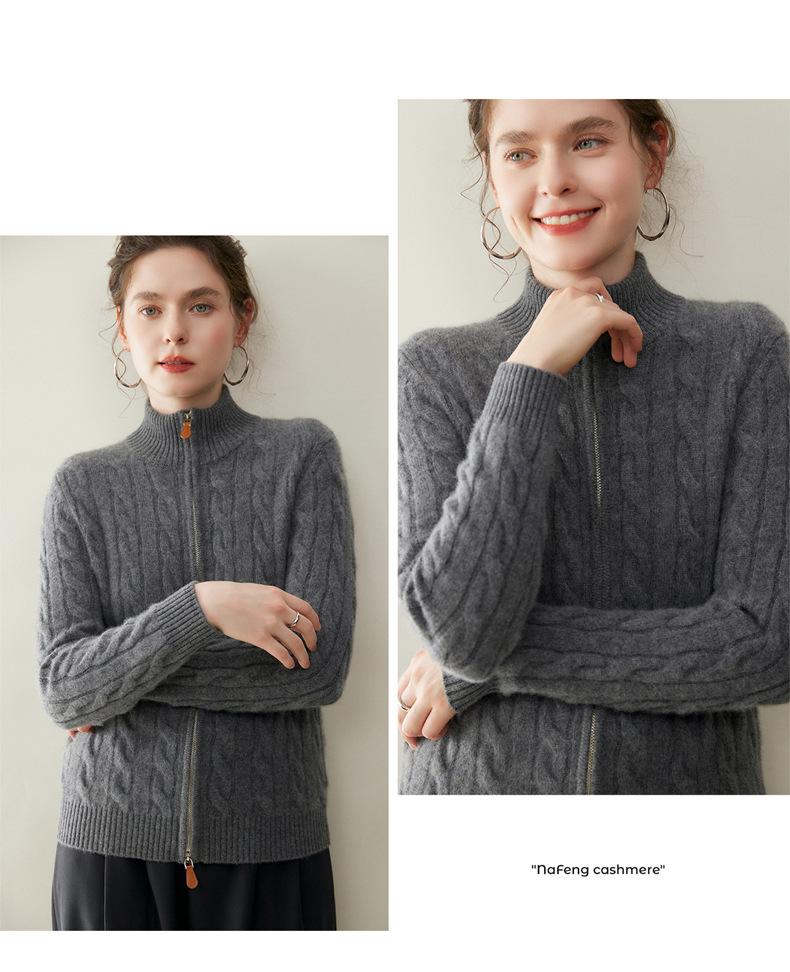Cárdigan de cachemira de punto de cable de alta gama para mujer, cuello alto, doble cremallera, suéter holgado adelgazante, abrigo grueso
