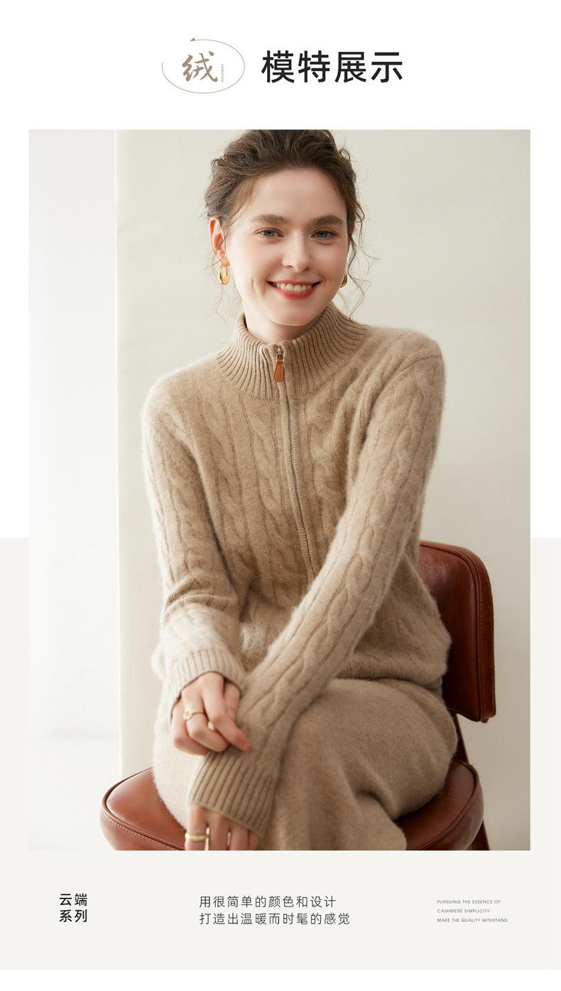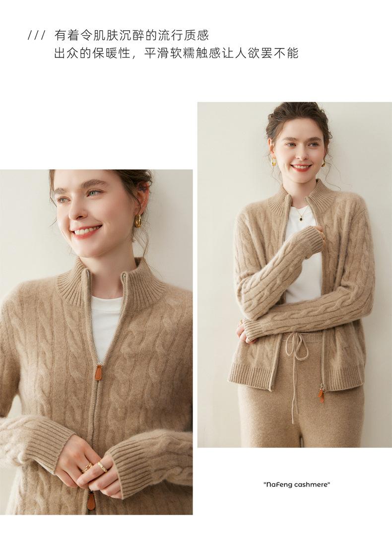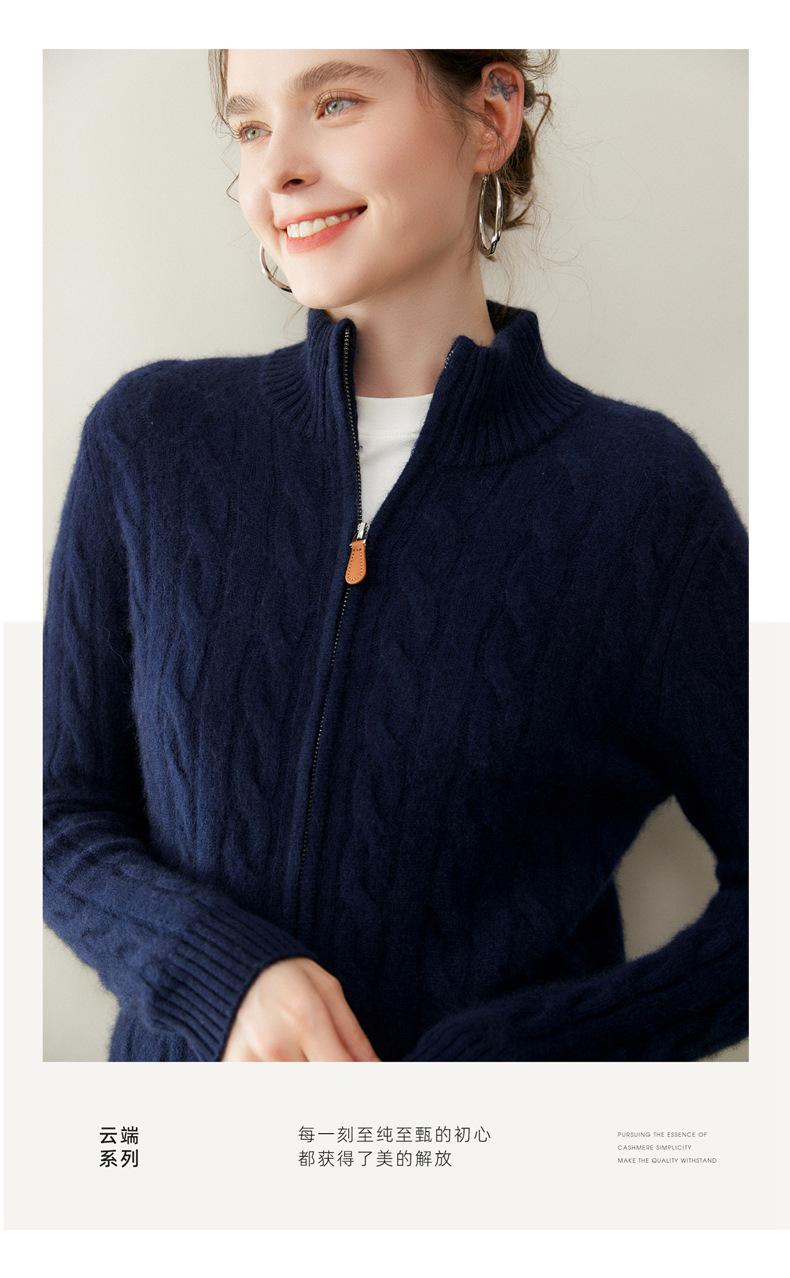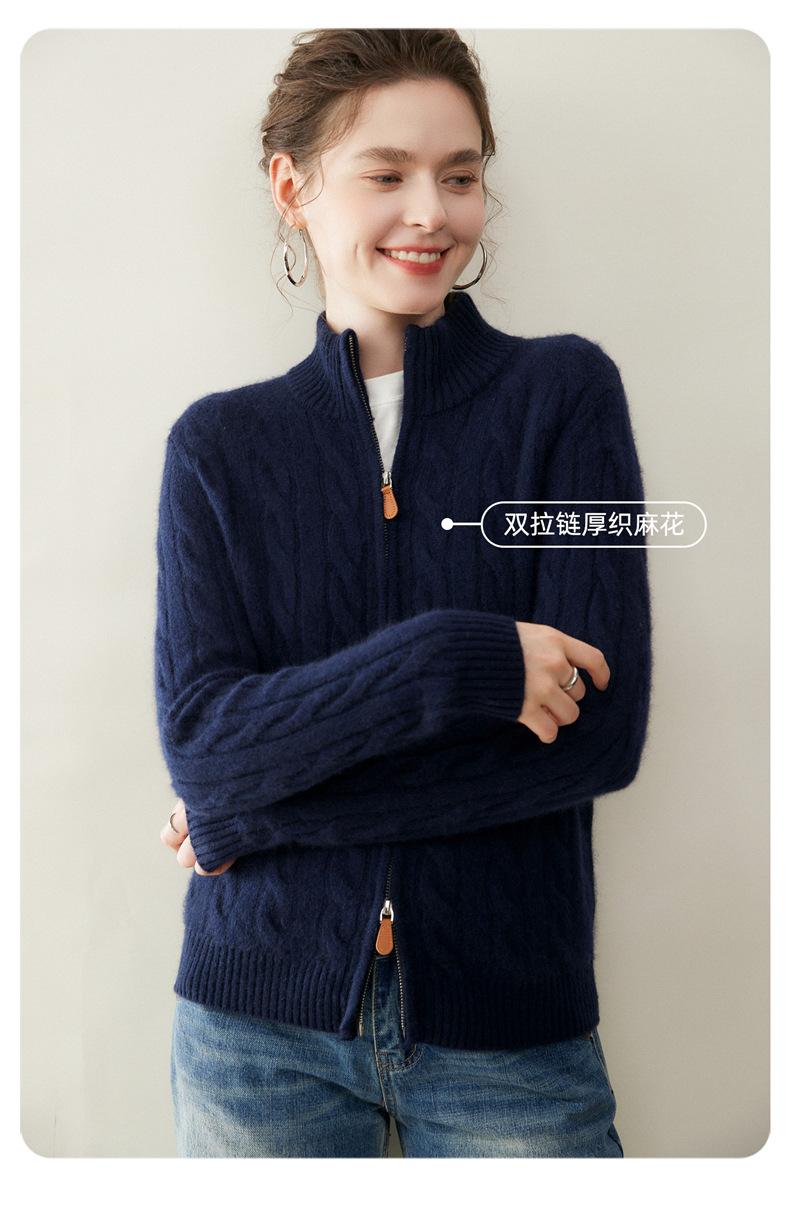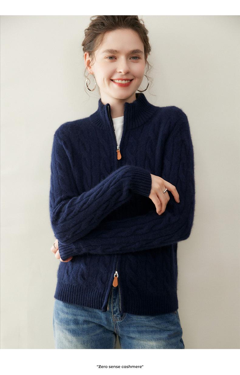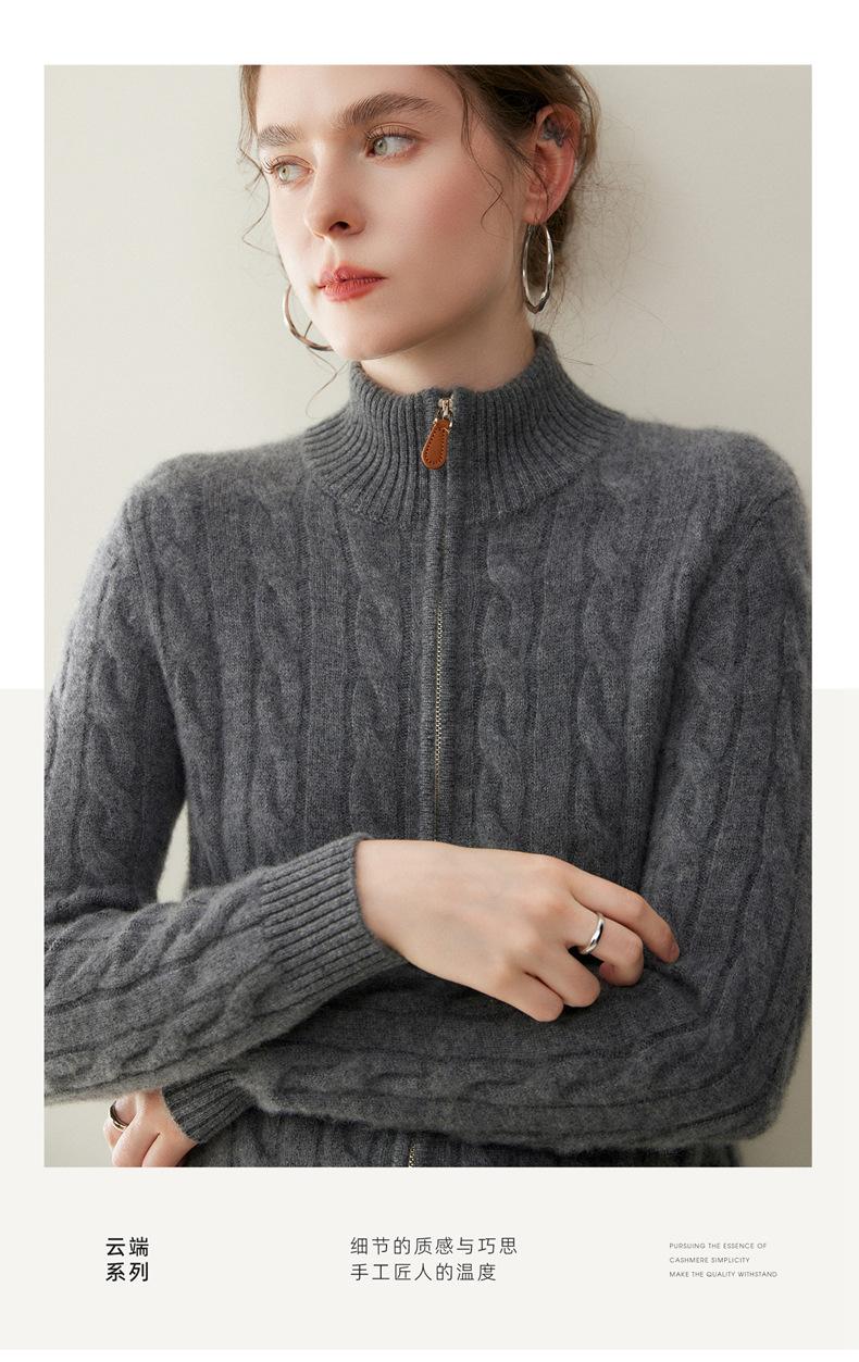 Cárdigan de cachemira de punto de cable de alta gama para mujer, cuello alto, doble cremallera, suéter holgado adelgazante, abrigo grueso