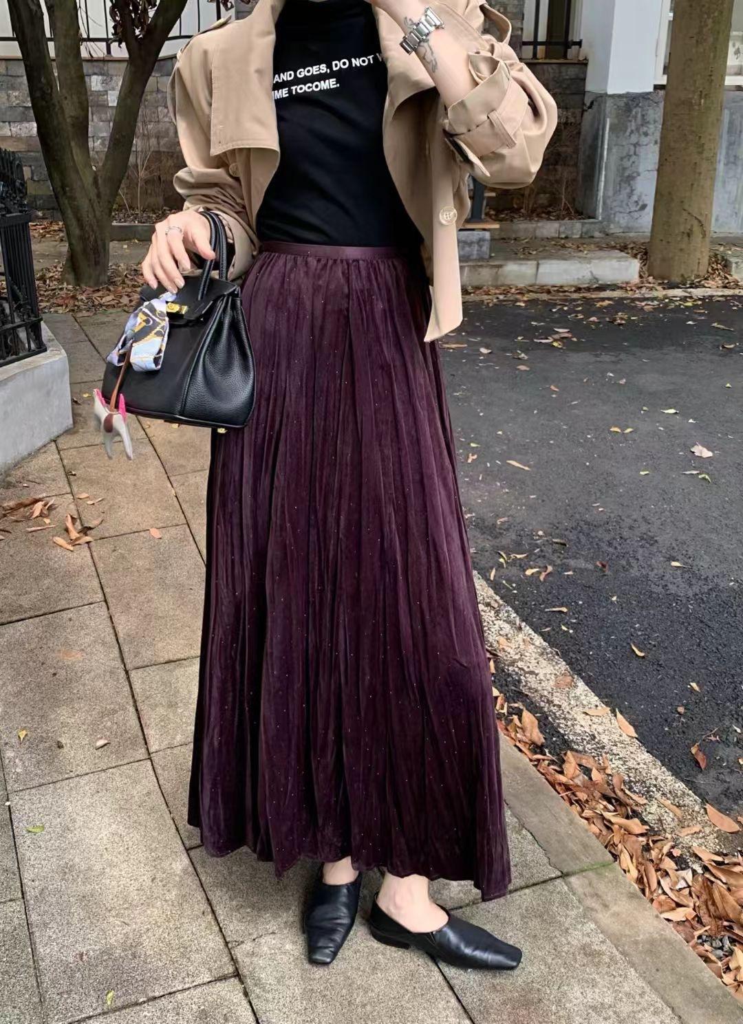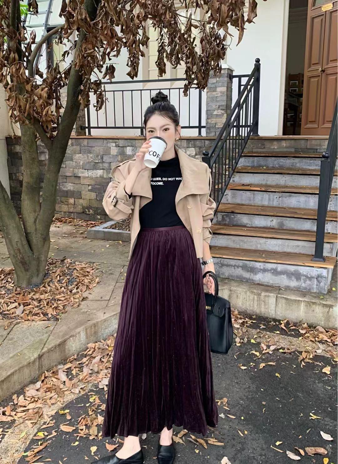 Falda de Terciopelo Plisada Mujer Otoño Invierno 2025 Nueva Cintura Alta Adelgazante Falda Línea A Petite Largo Medio Falda Plisada