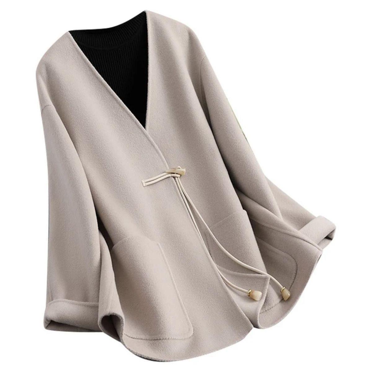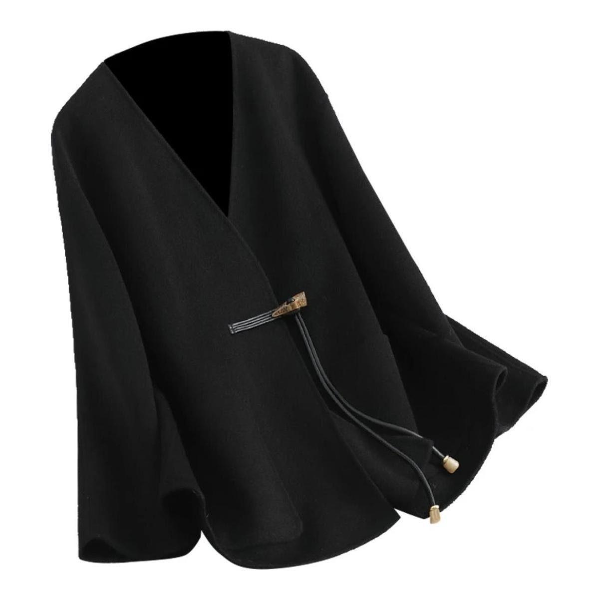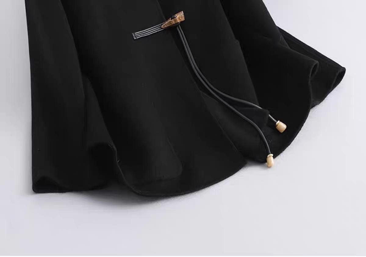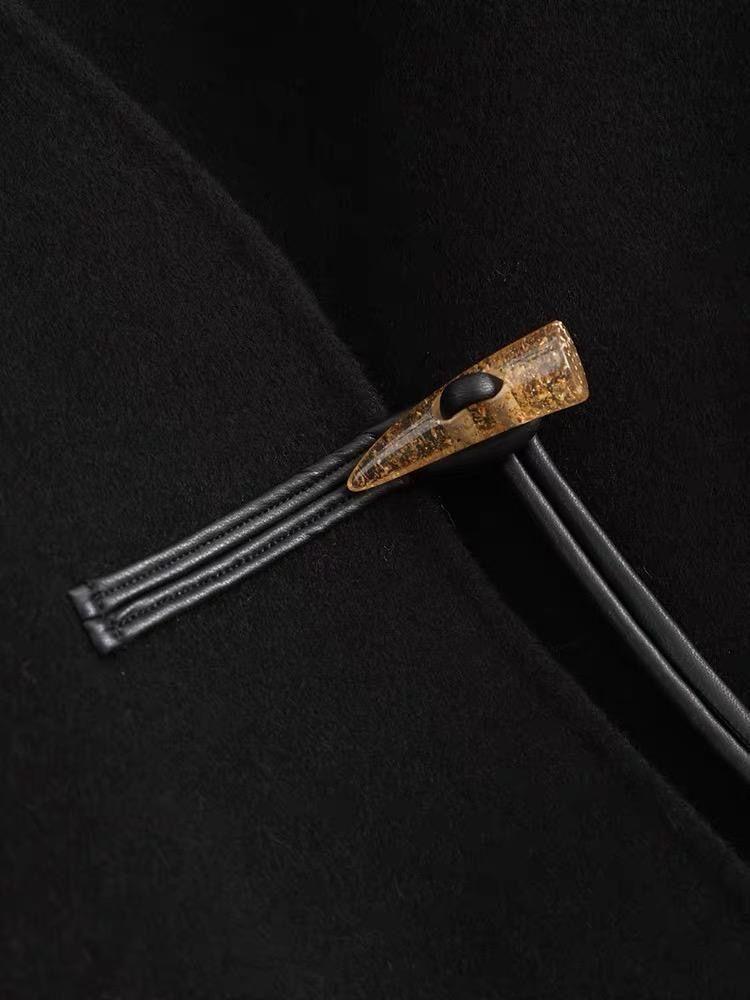 Abrigo de Lana Negro de Doble Vista Estilo Chino Nuevo para Mujer, Abrigo de Lana con Botones de Palanca de Alto Temperamento, Nuevo Top para Otoño e Invierno 2025