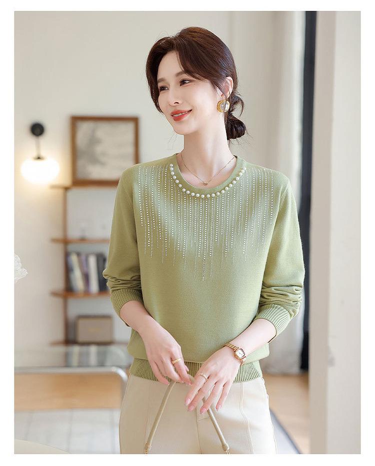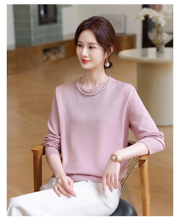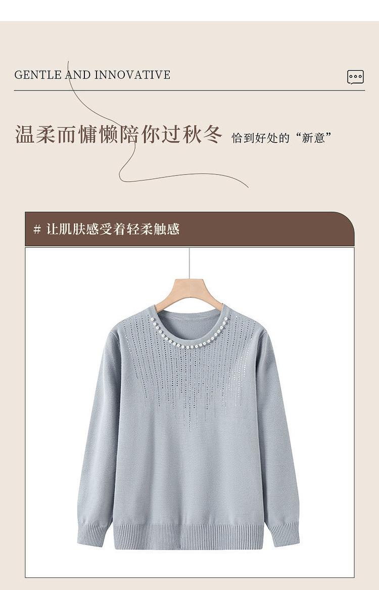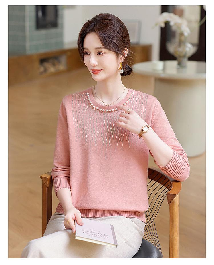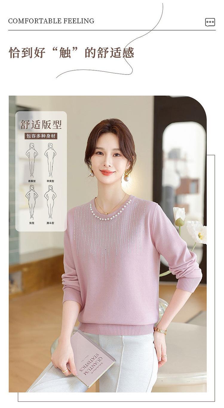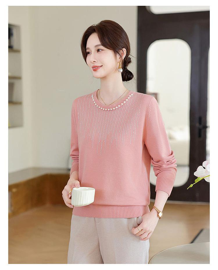 Suéter de Manga Larga con Cuentas y Cuello Redondo para Primavera y Otoño para Mamá Nueva Camiseta Pequeña Moda para Mujeres de Mediana Edad y Mayores Top de Punto