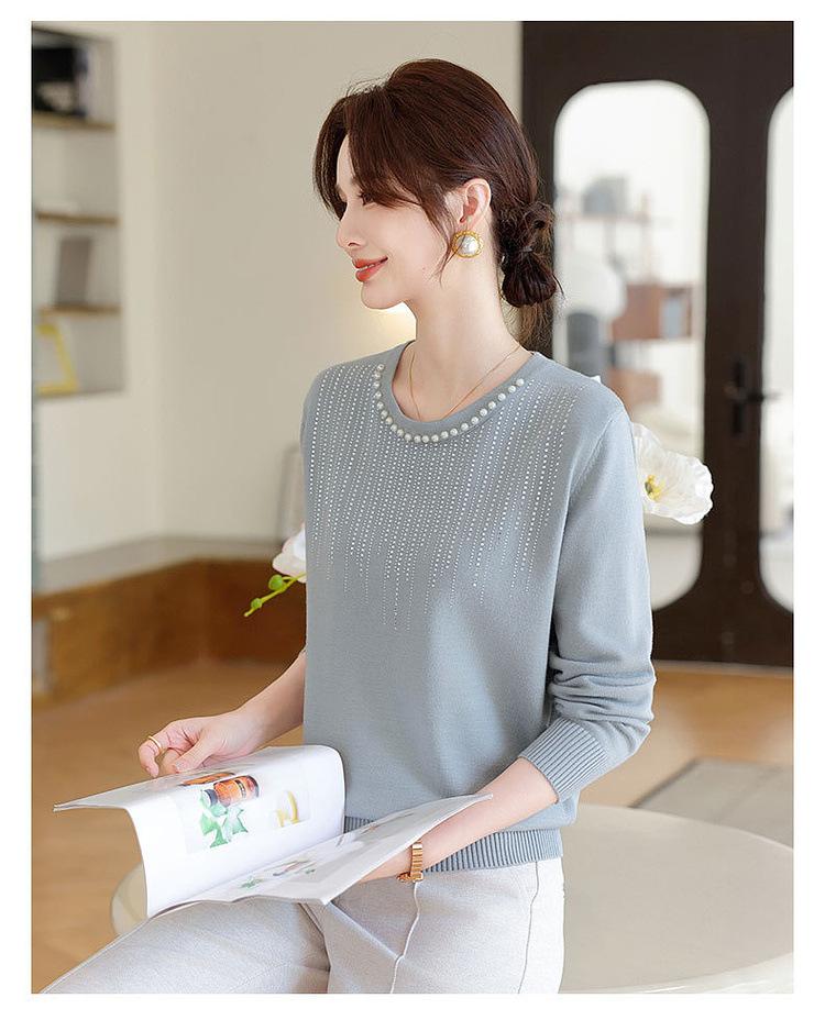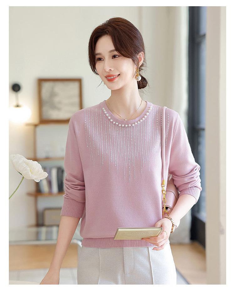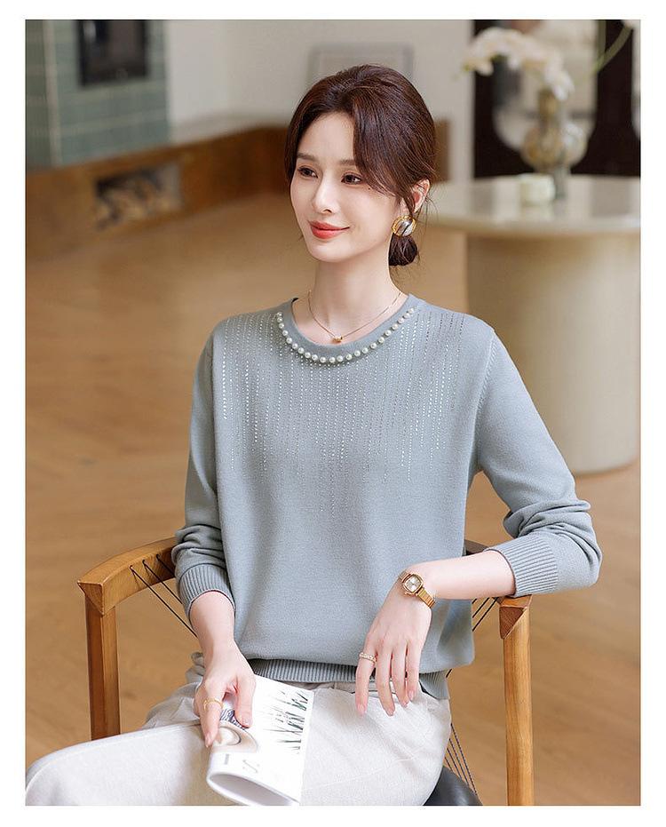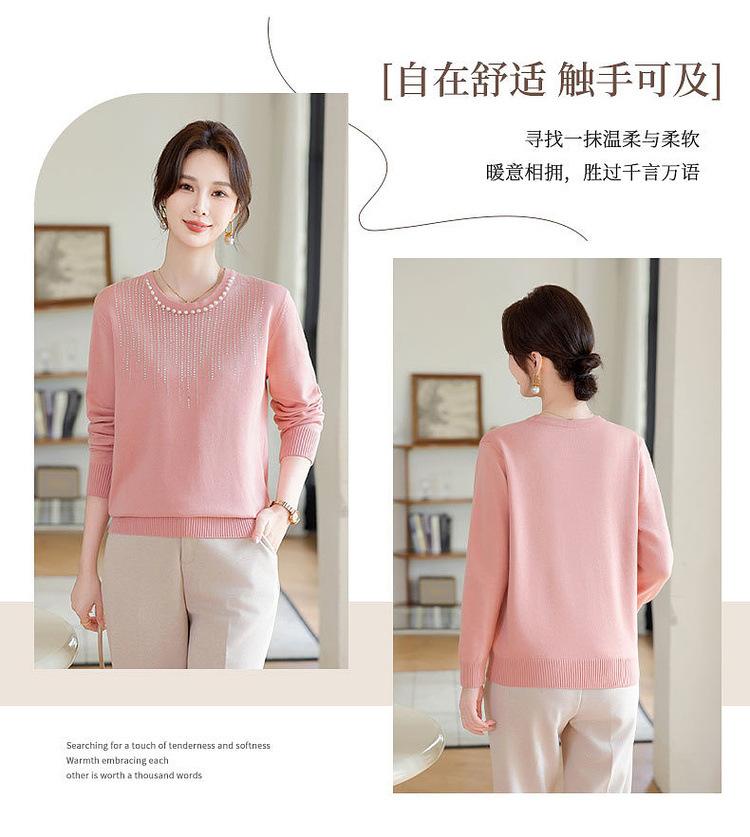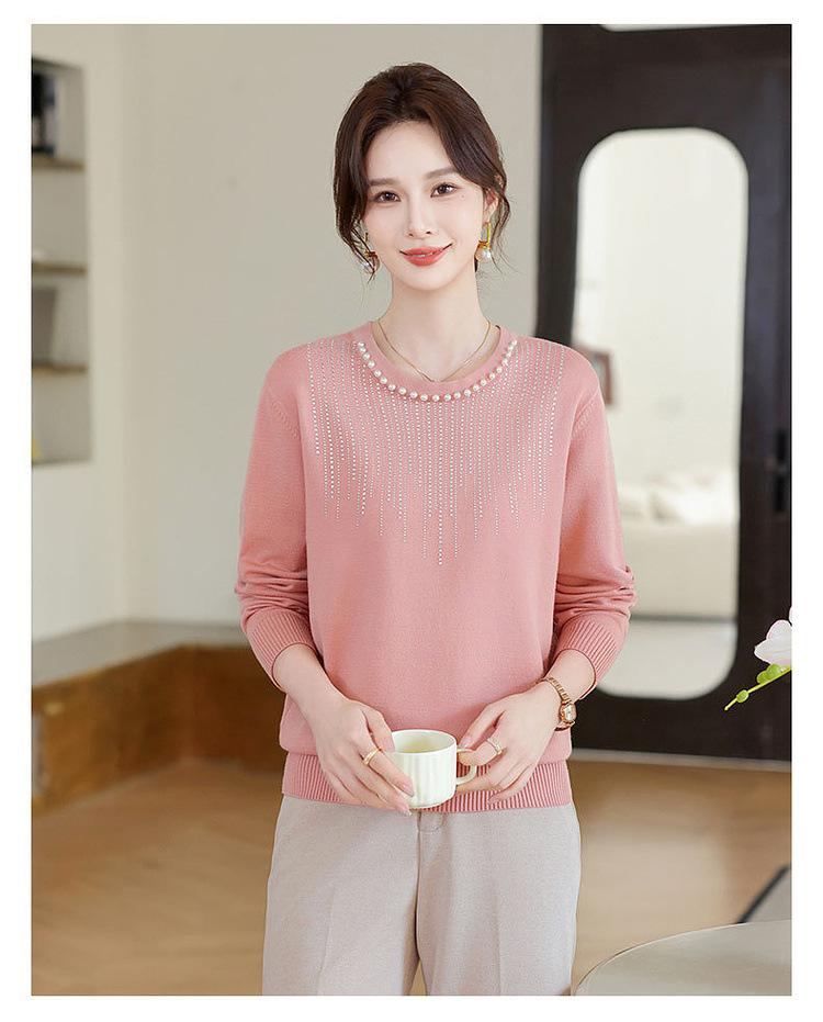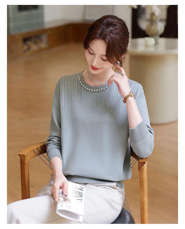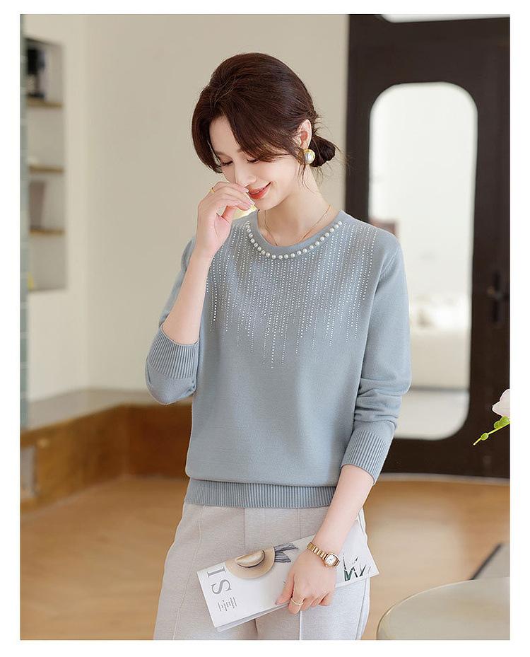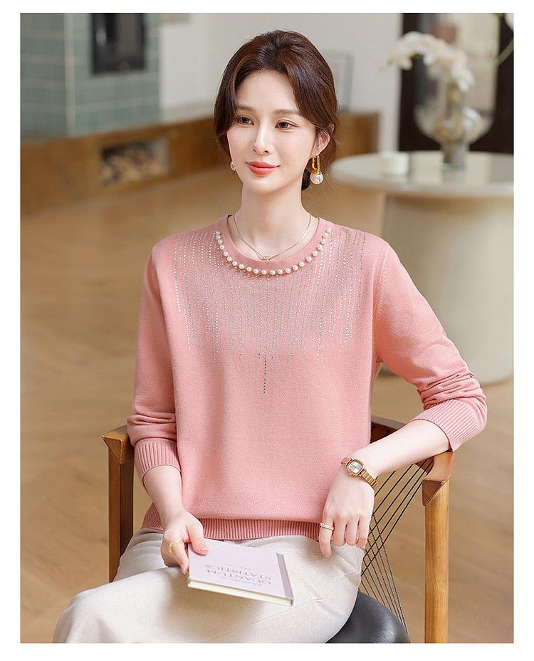 Suéter de Manga Larga con Cuentas y Cuello Redondo para Primavera y Otoño para Mamá Nueva Camiseta Pequeña Moda para Mujeres de Mediana Edad y Mayores Top de Punto