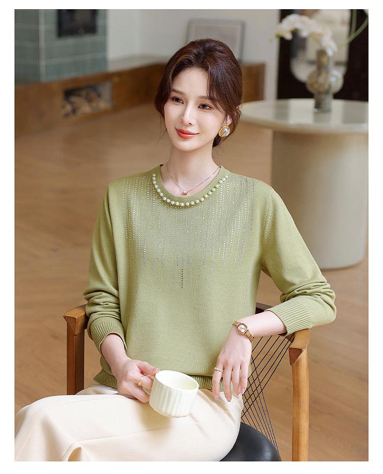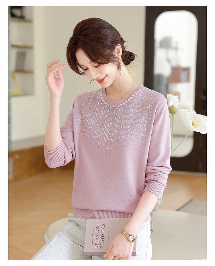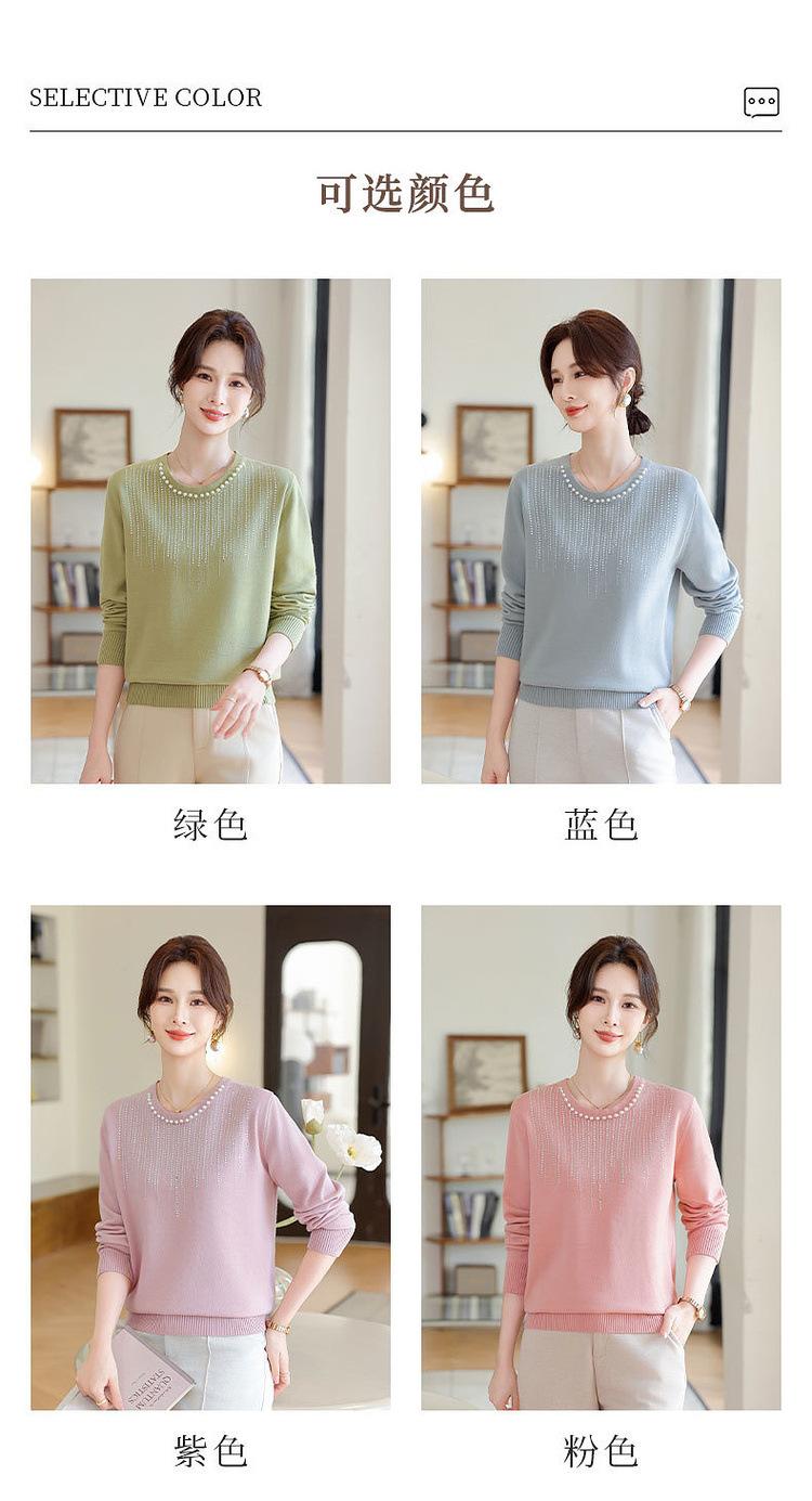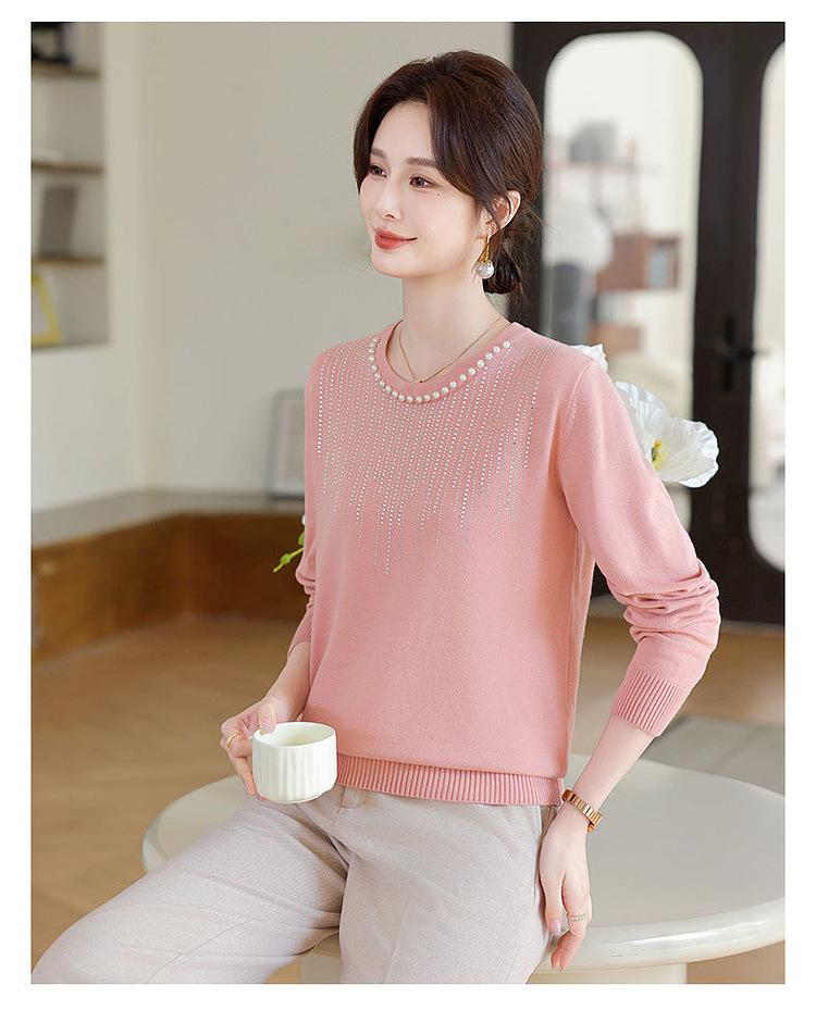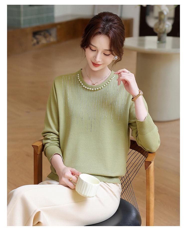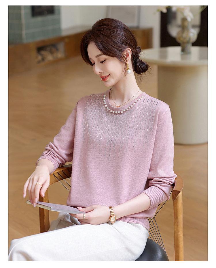 Suéter de Manga Larga con Cuentas y Cuello Redondo para Primavera y Otoño para Mamá Nueva Camiseta Pequeña Moda para Mujeres de Mediana Edad y Mayores Top de Punto
