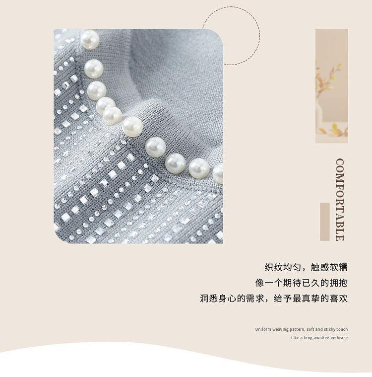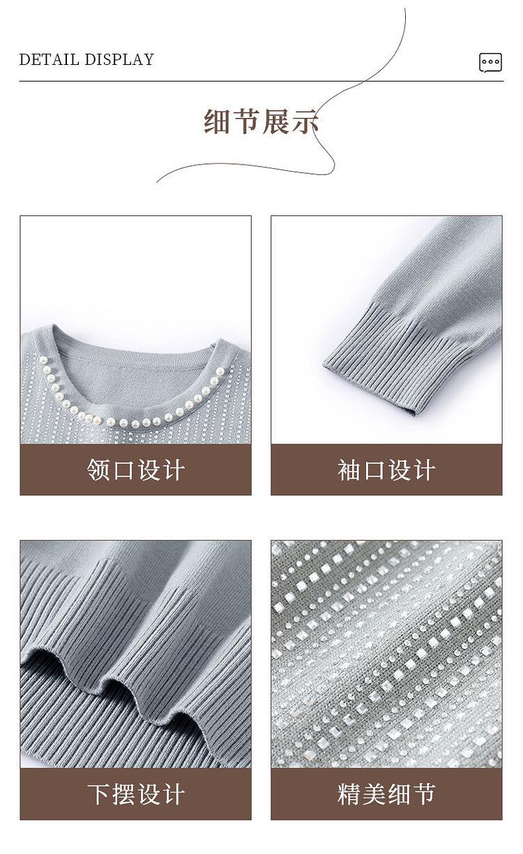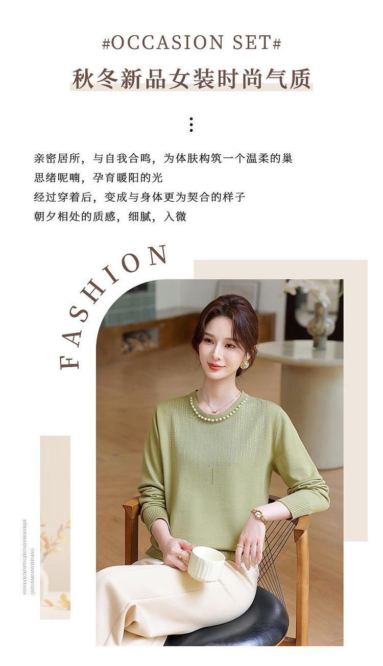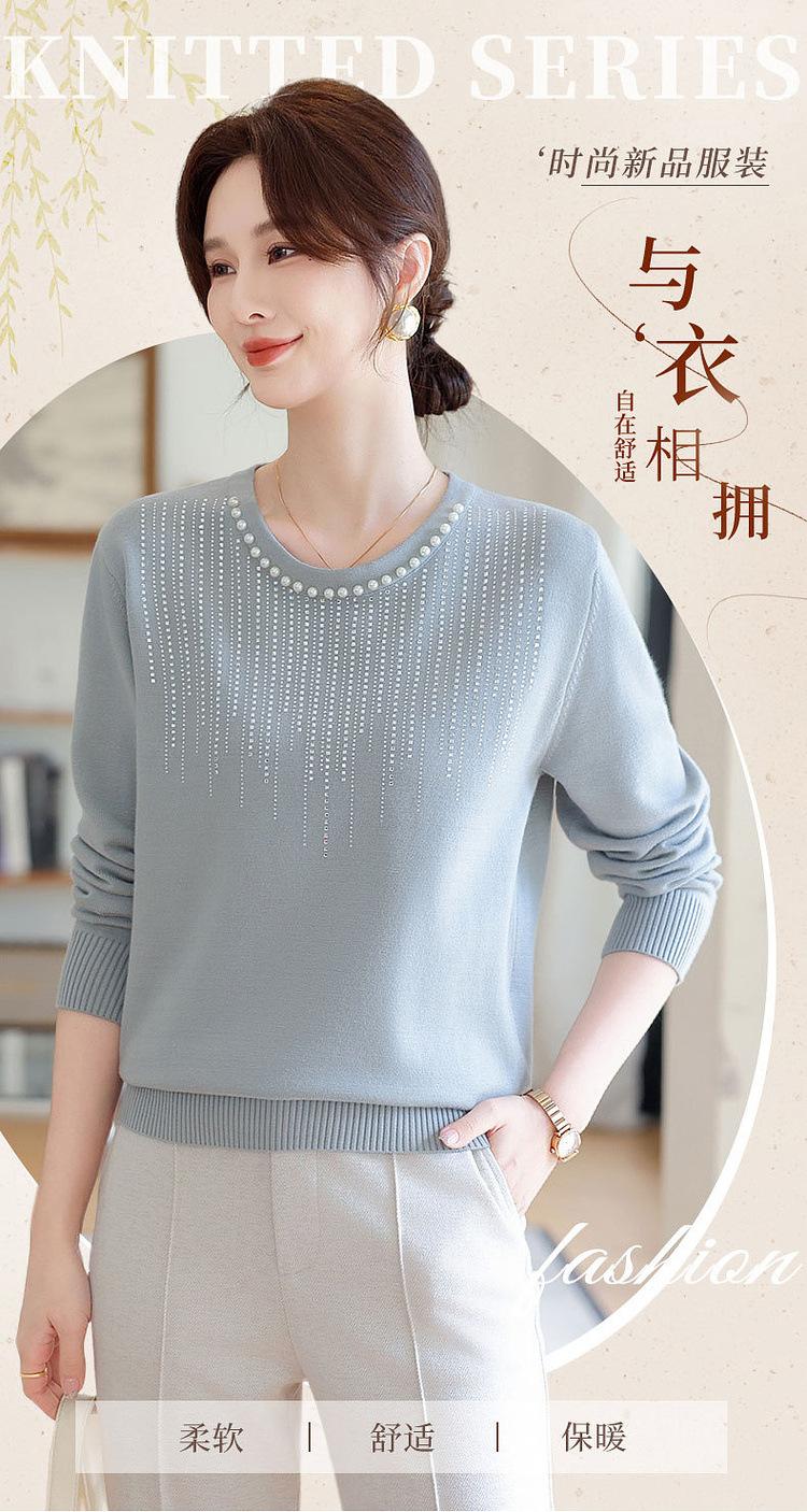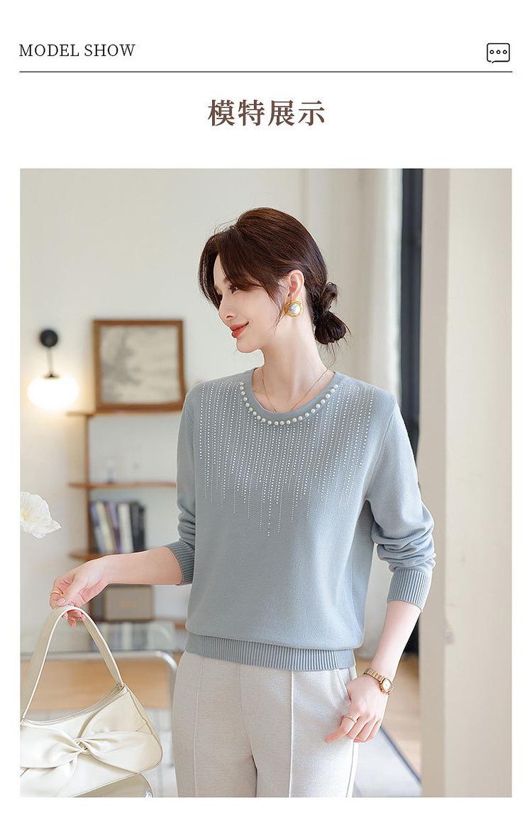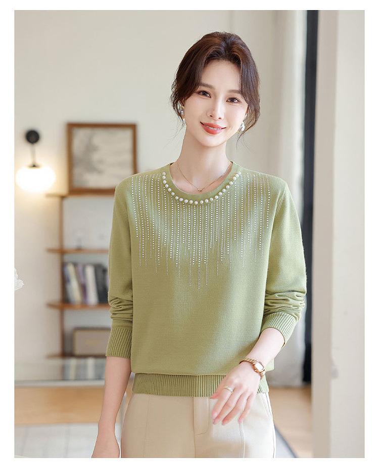 Suéter de Manga Larga con Cuentas y Cuello Redondo para Primavera y Otoño para Mamá Nueva Camiseta Pequeña Moda para Mujeres de Mediana Edad y Mayores Top de Punto