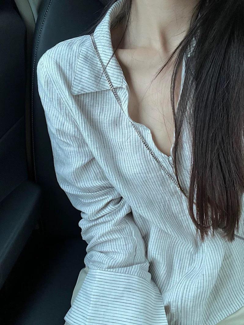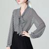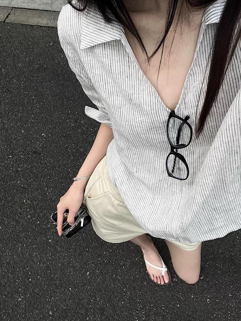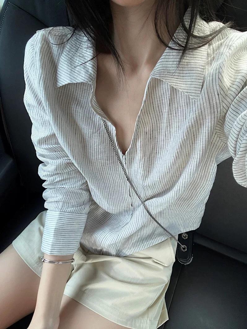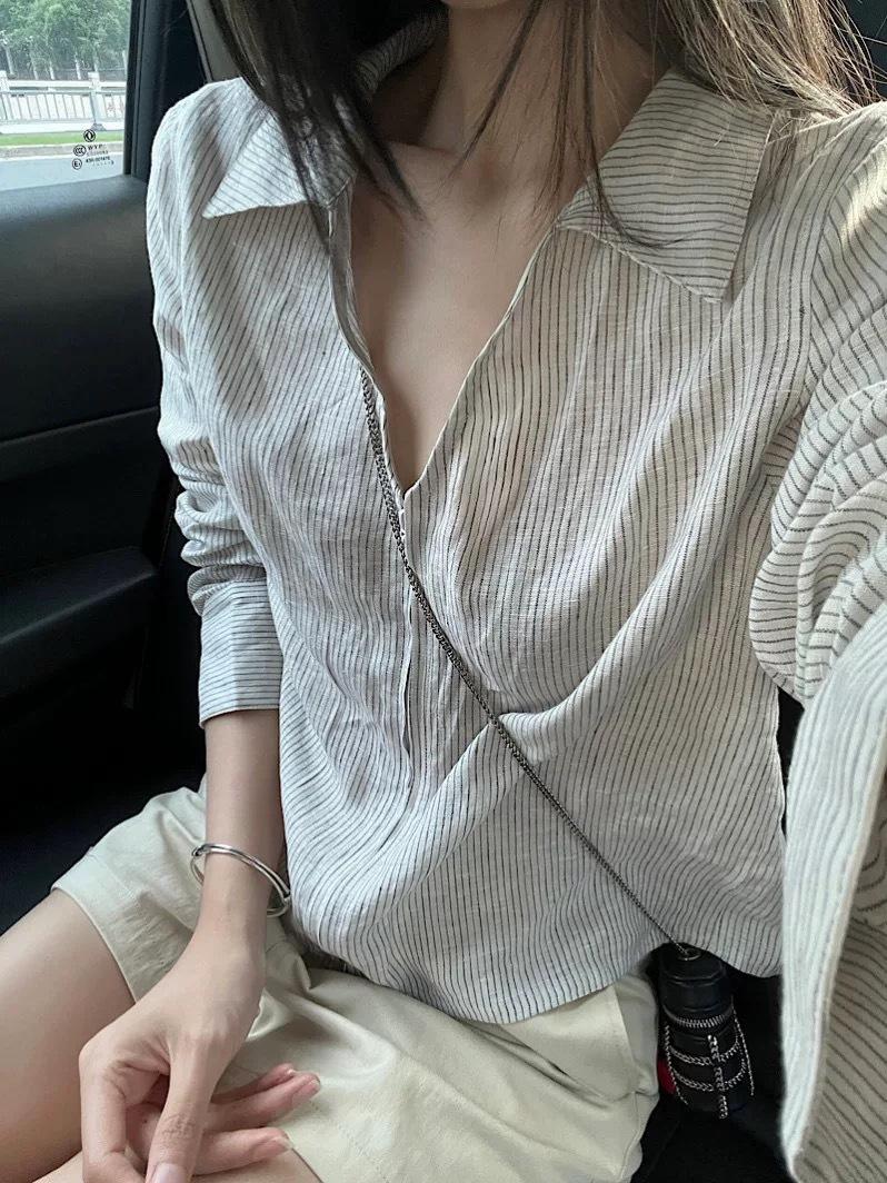 Camisa a Rayas con Cuello en V para Mujer Verano 2025 Ligera y Transpirable Holgada Relajada Camisa de Protección Solar Top de Manga Larga de Alta Gama