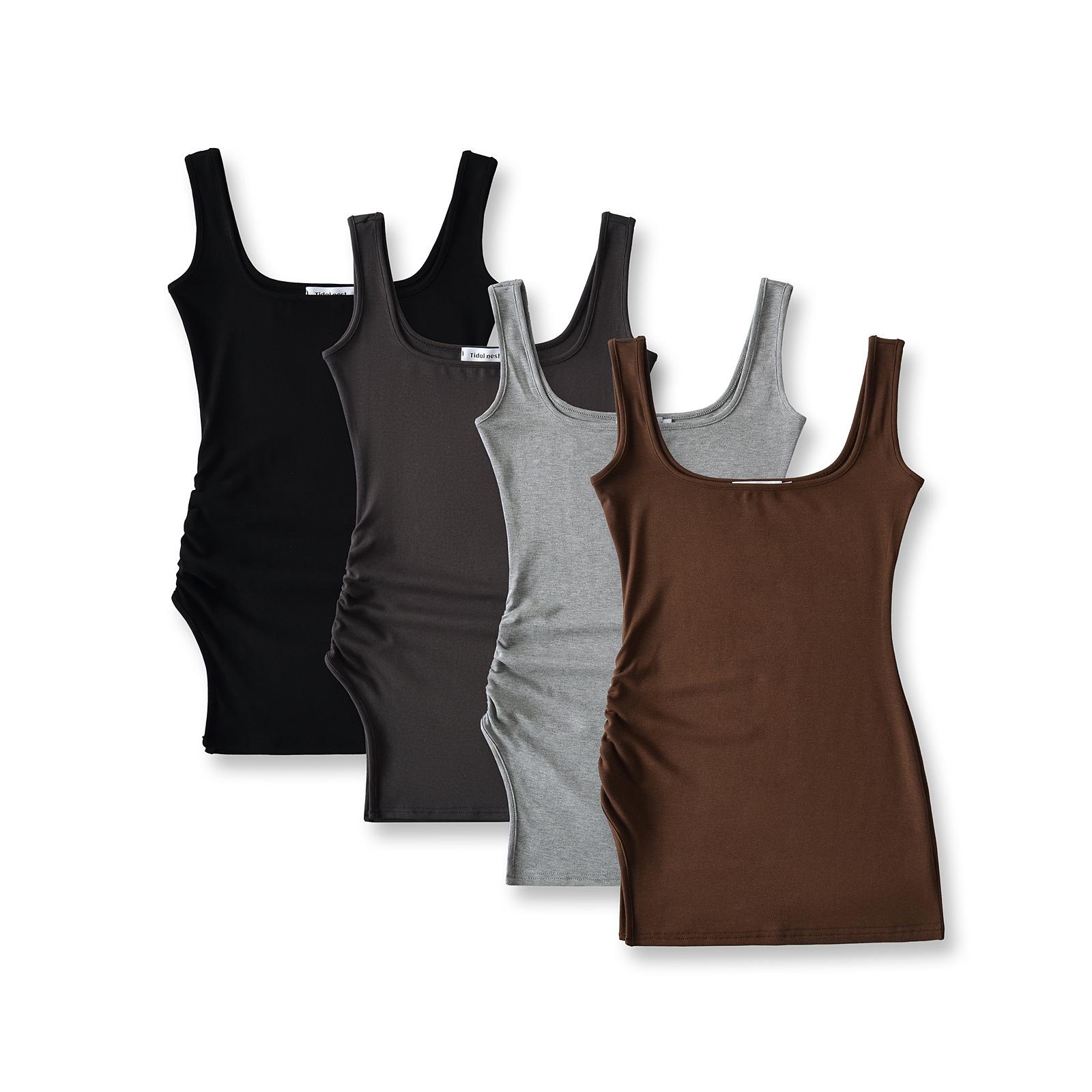 black top, Light grey top, Dark grey top, Light brown top, black pants, Light grey pants, Dark grey pants, Light brown pants