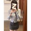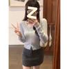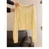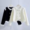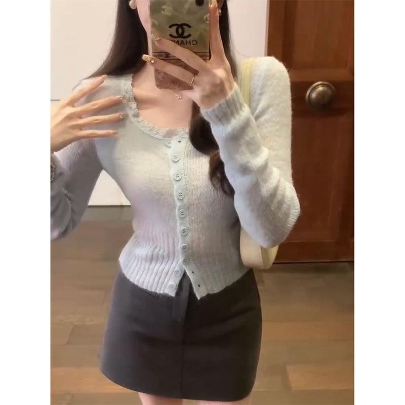 Cárdigan de punto de encaje azul suave francés para mujer, primavera, temperamento delgado, de un solo pecho, corto, top exquisito