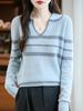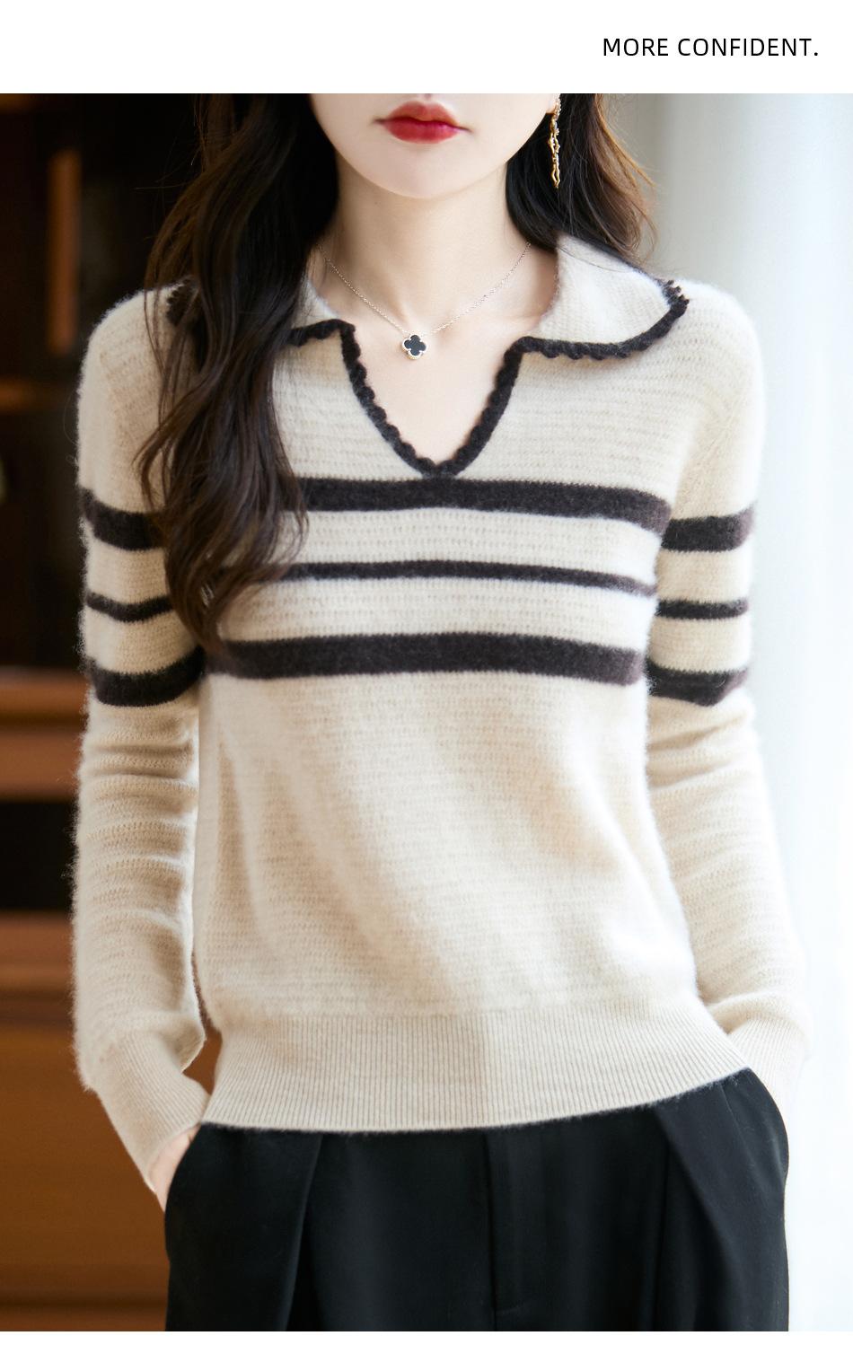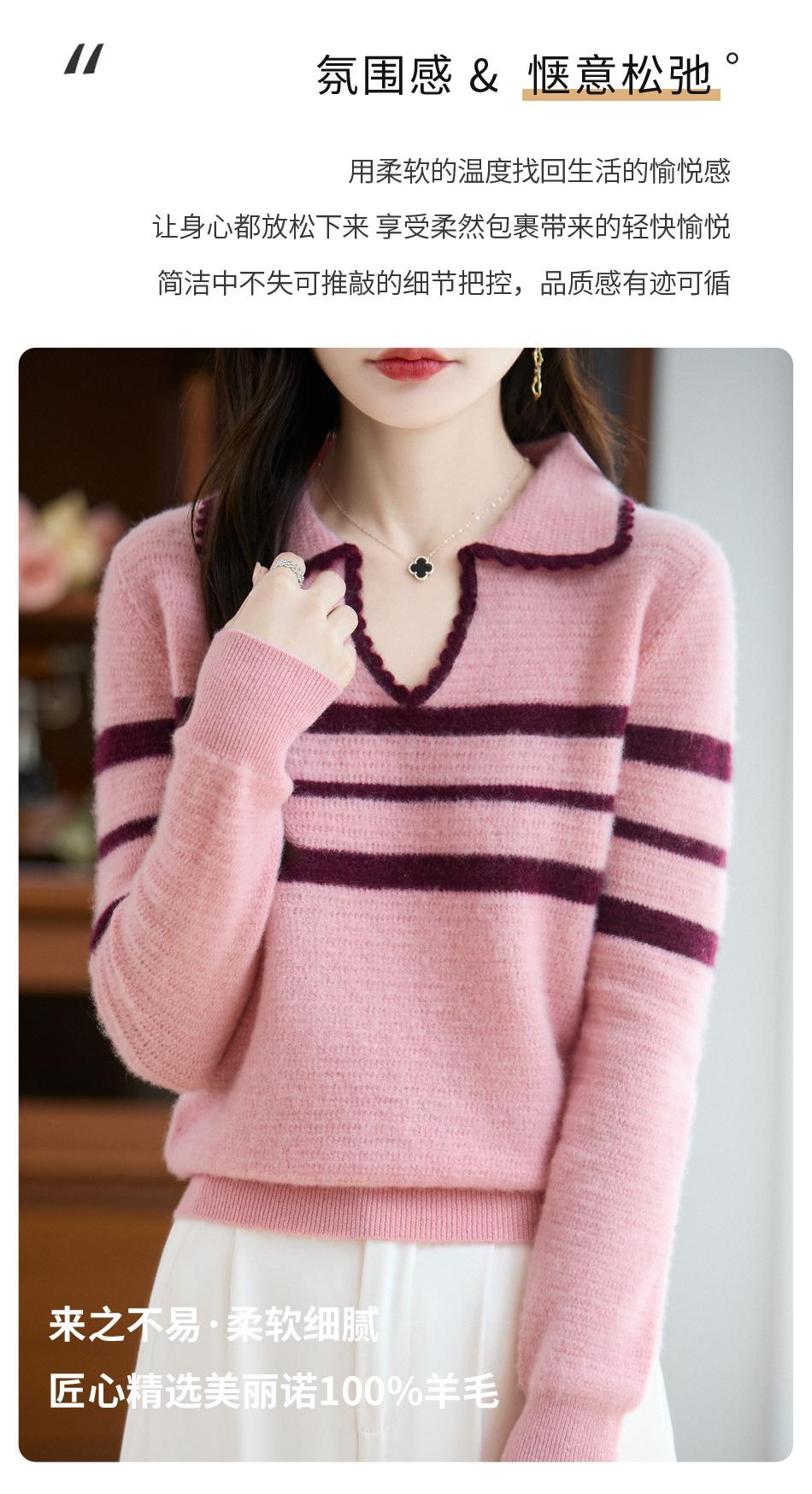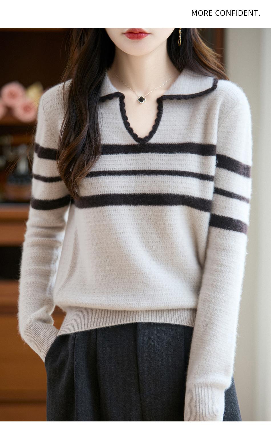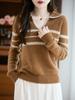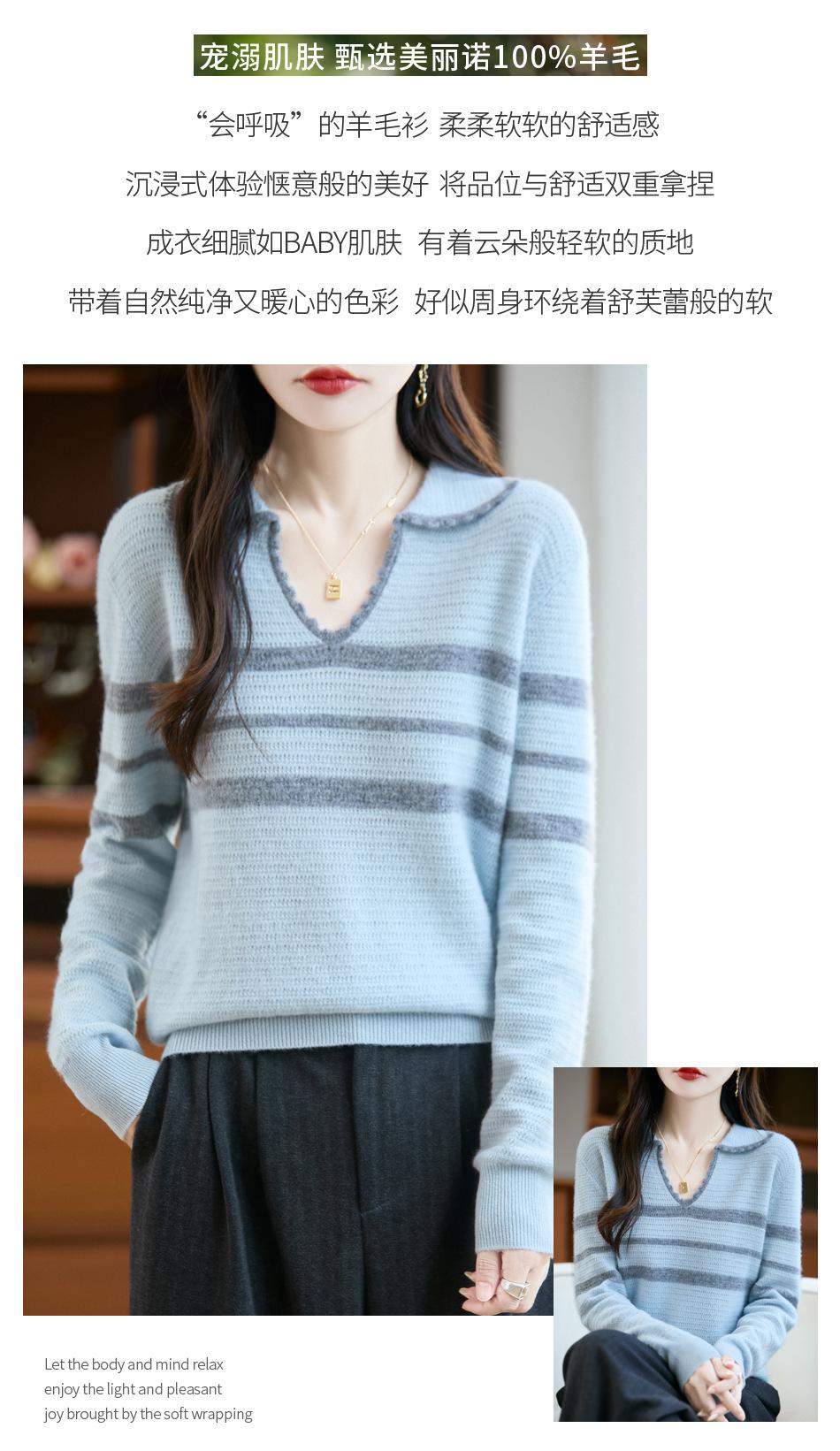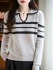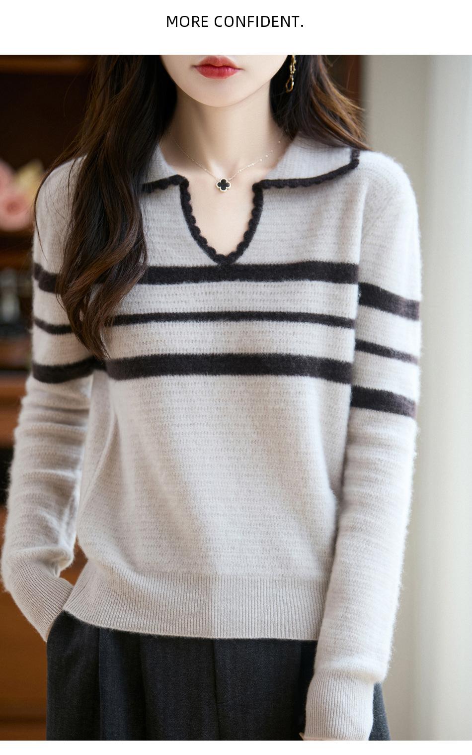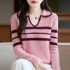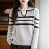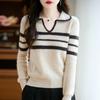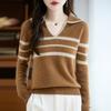 2025 Otoño/Invierno Nuevo Suéter de Punto de Pura Lana con Cuello Dobladillo Manga Larga para Mujer Bloque de Color Rayado Cálido Top de Capa Base