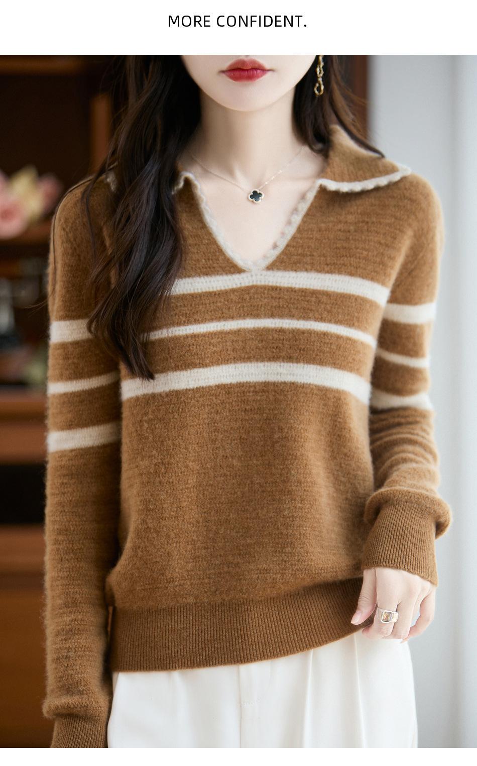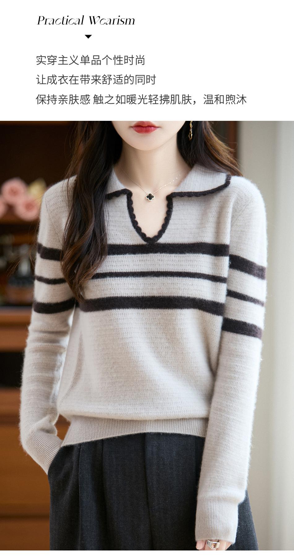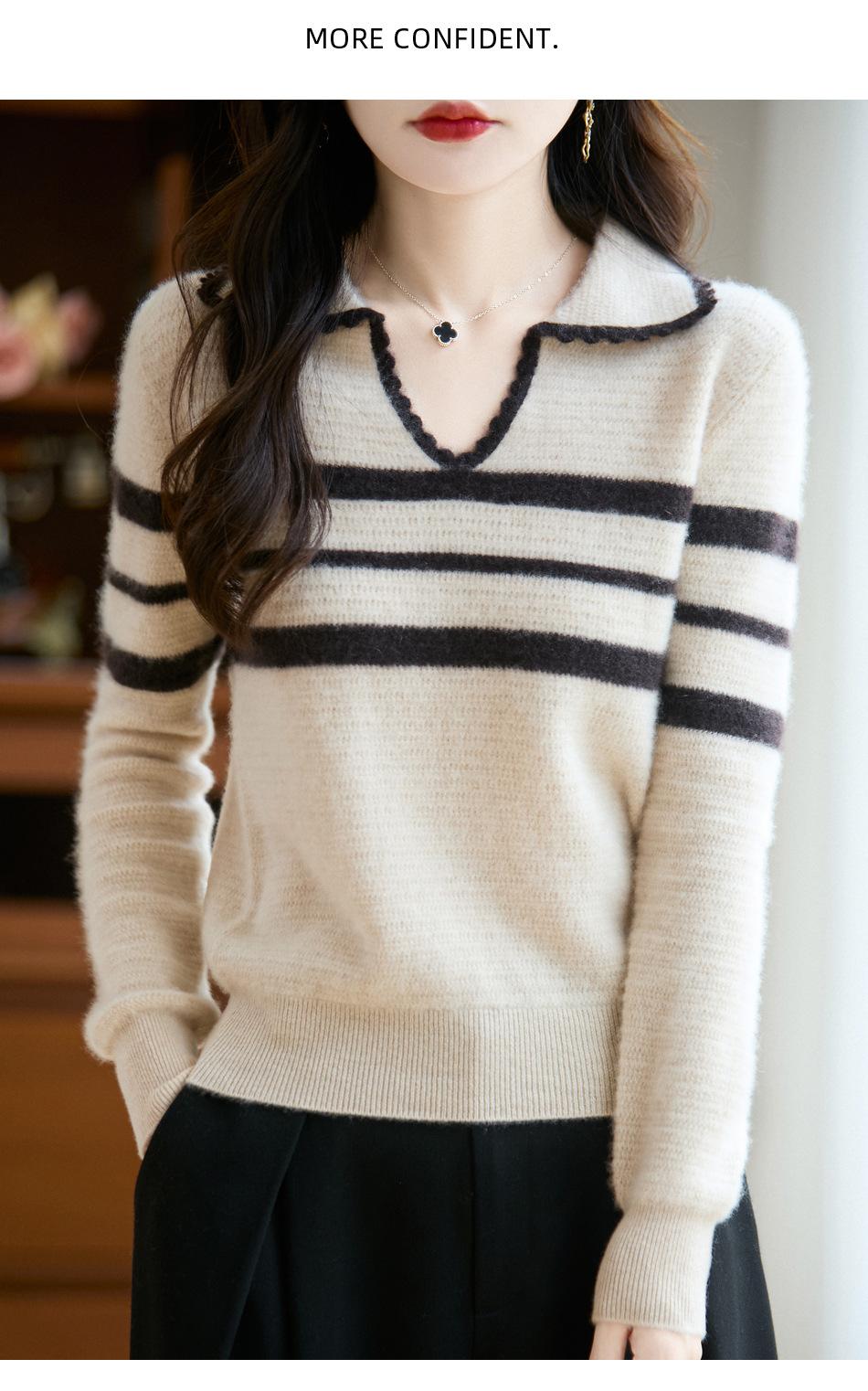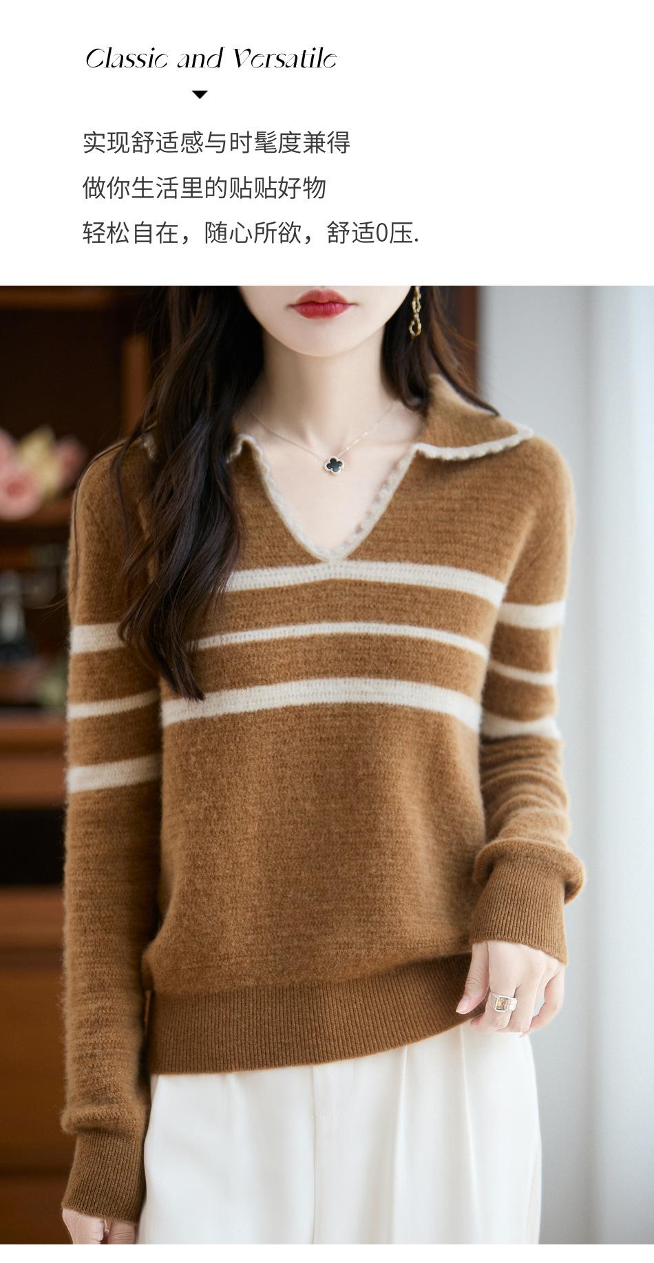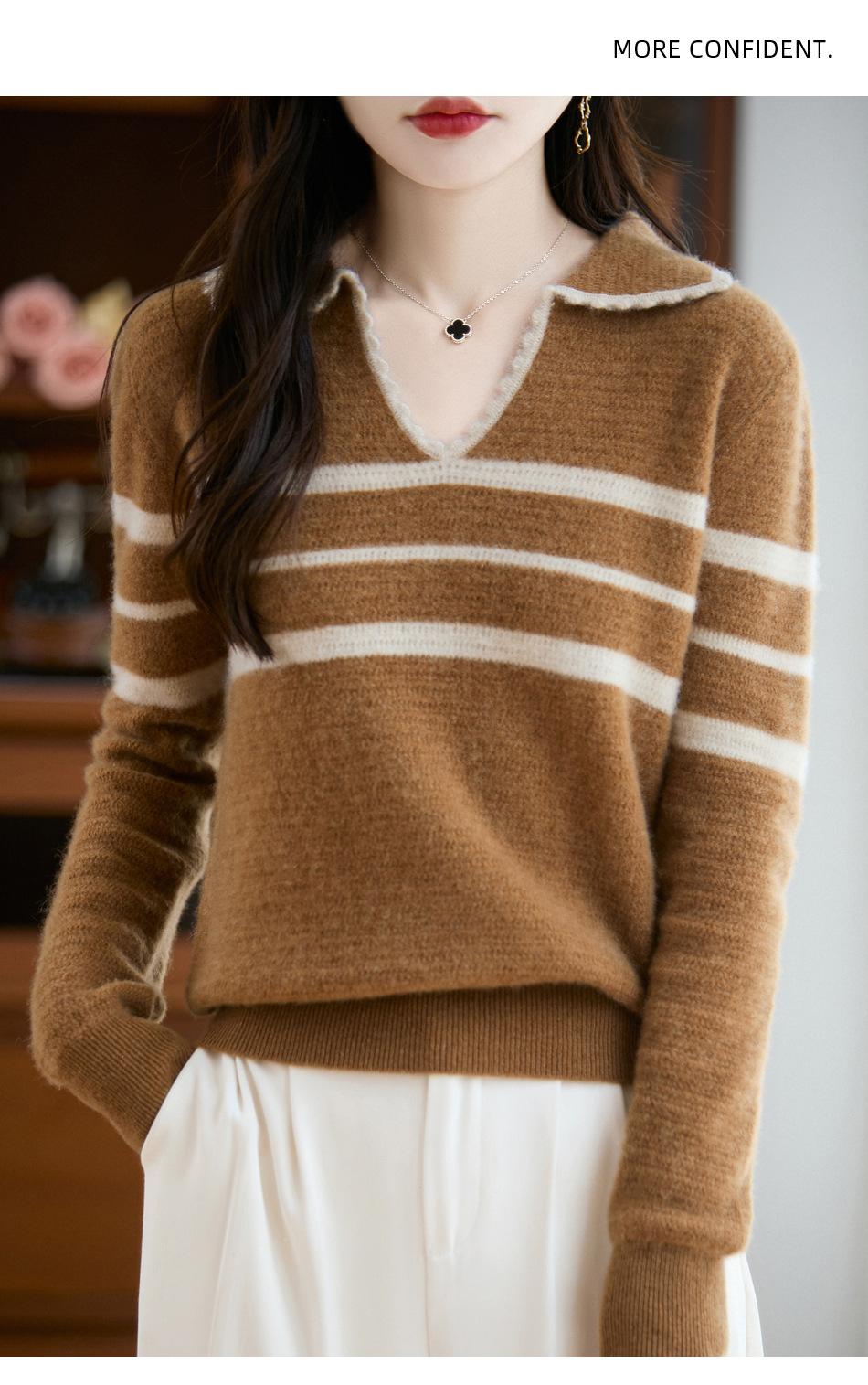 2025 Otoño/Invierno Nuevo Suéter de Punto de Pura Lana con Cuello Dobladillo Manga Larga para Mujer Bloque de Color Rayado Cálido Top de Capa Base
