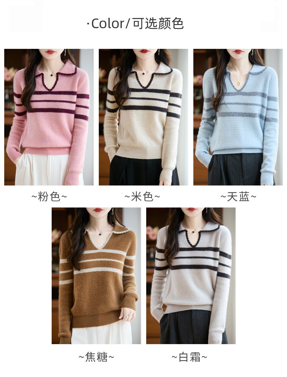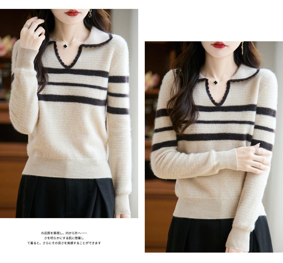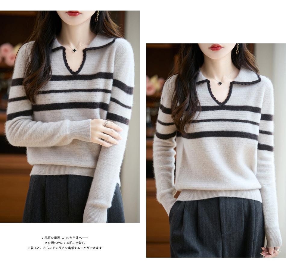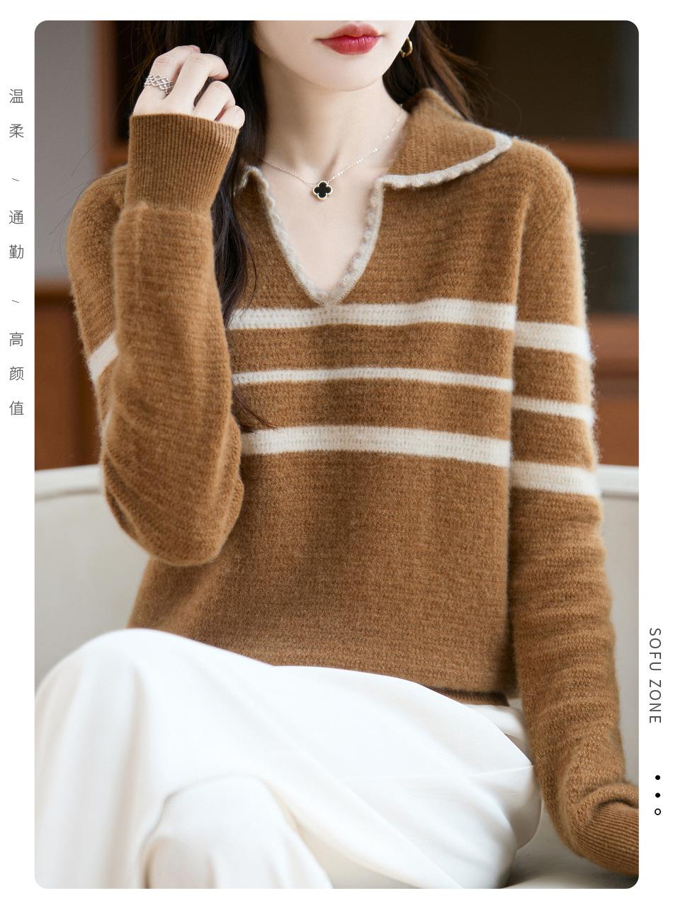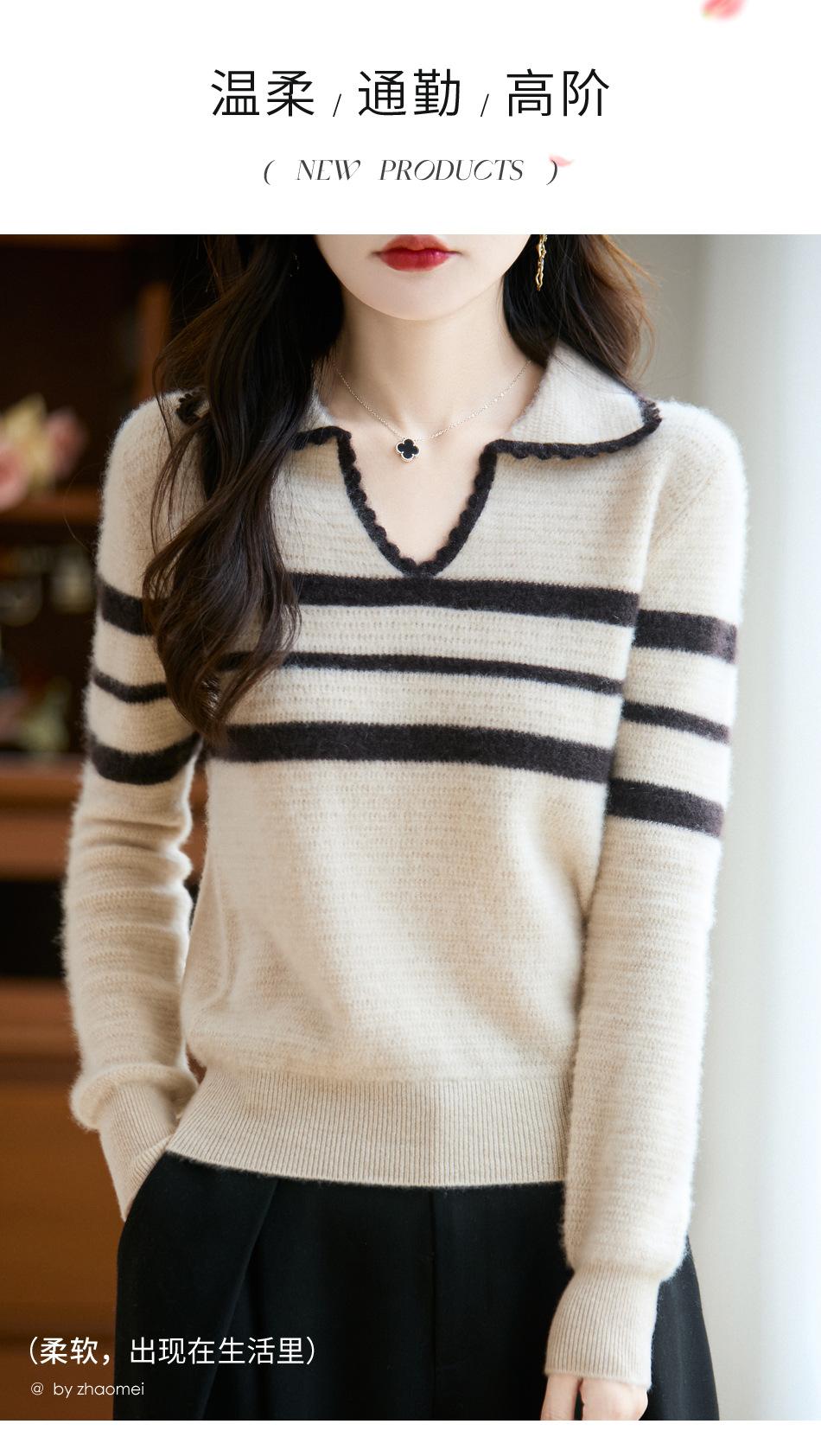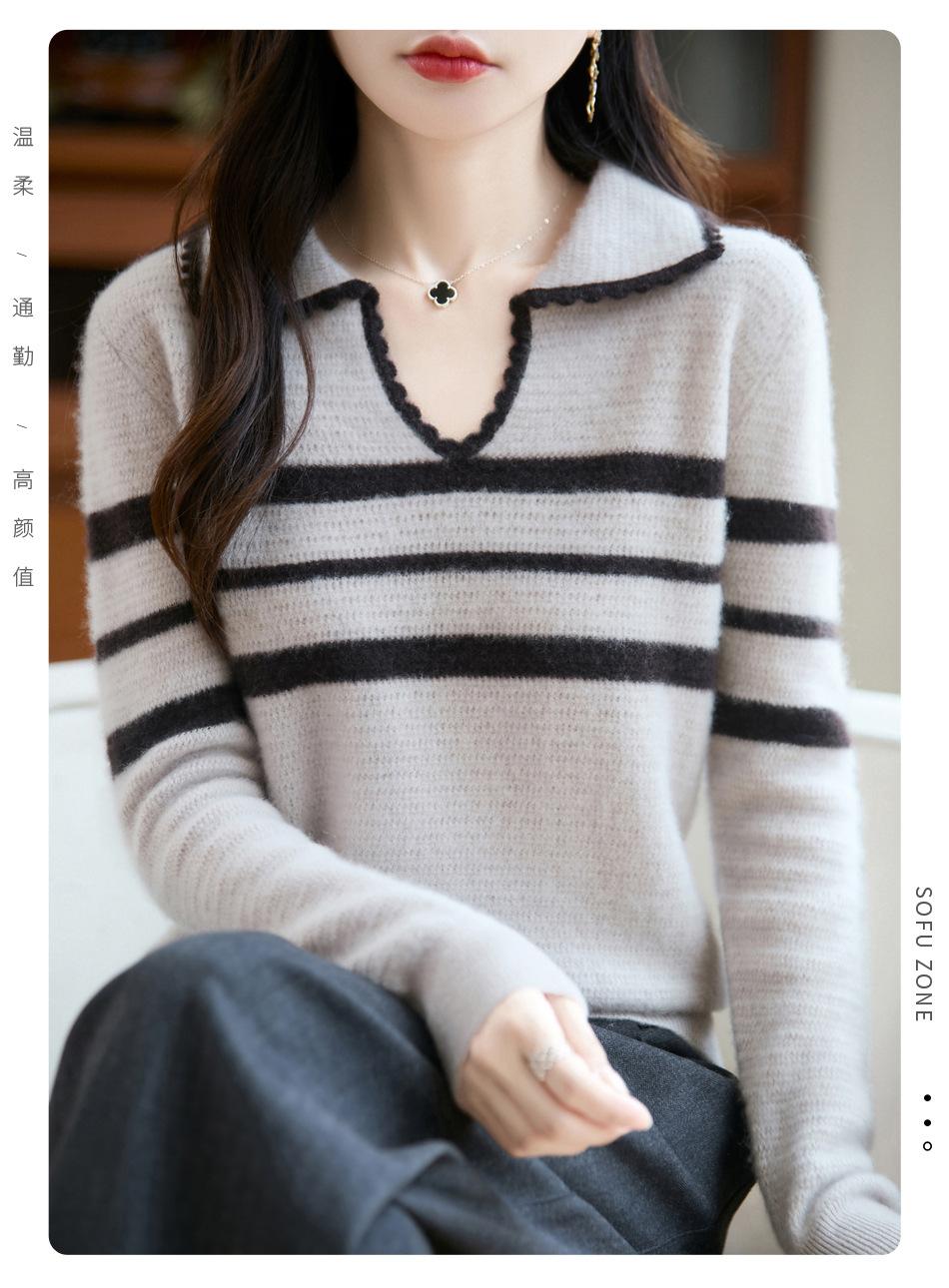2025 Otoño/Invierno Nuevo Suéter de Punto de Pura Lana con Cuello Dobladillo Manga Larga para Mujer Bloque de Color Rayado Cálido Top de Capa Base