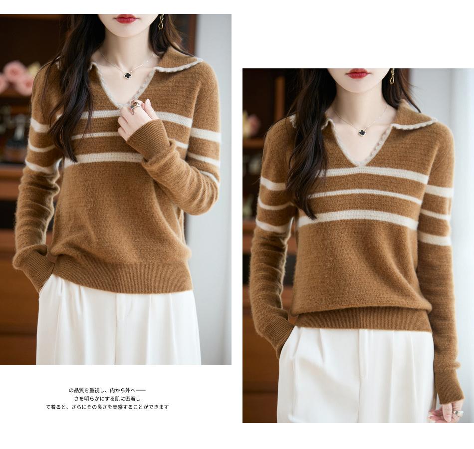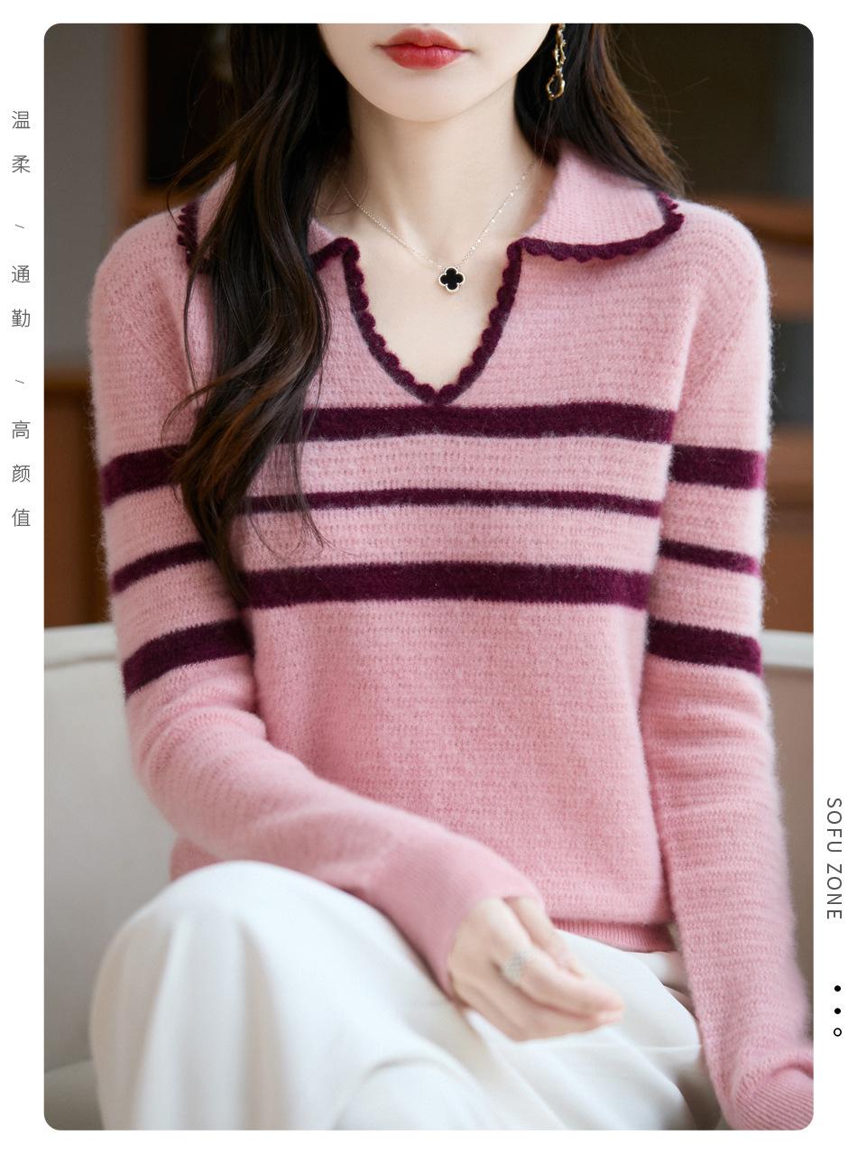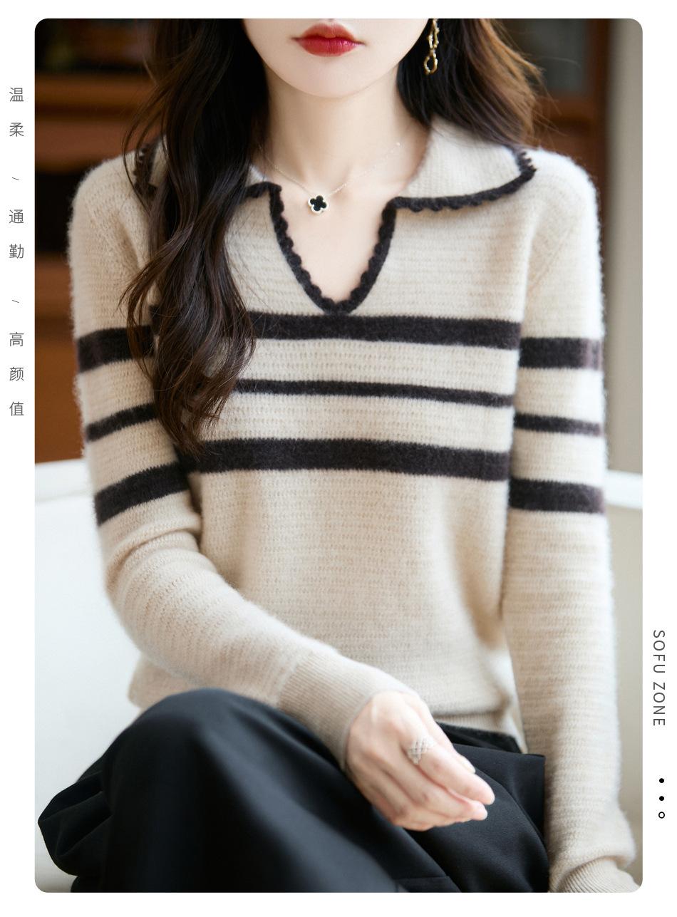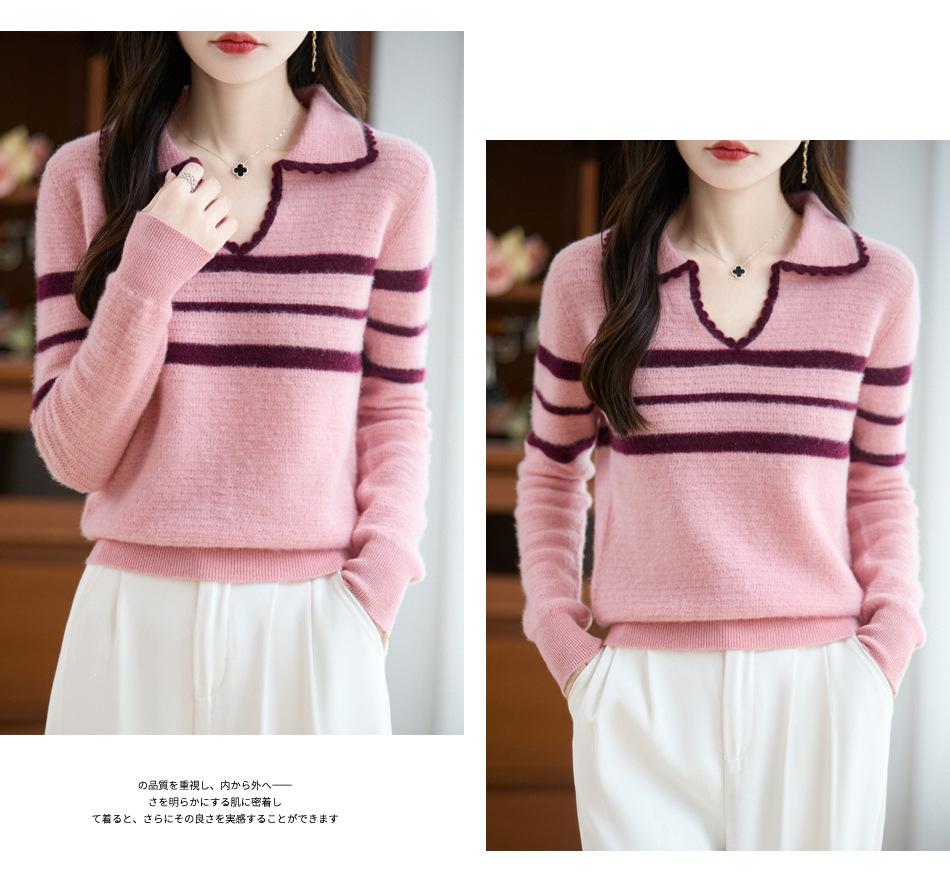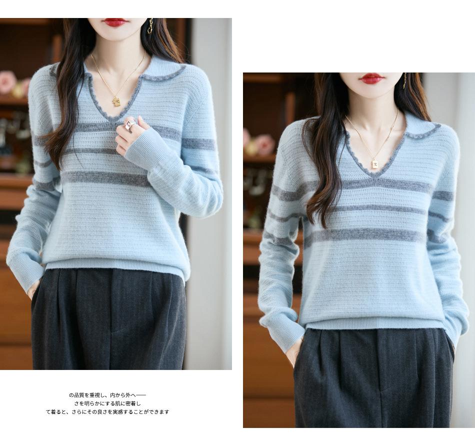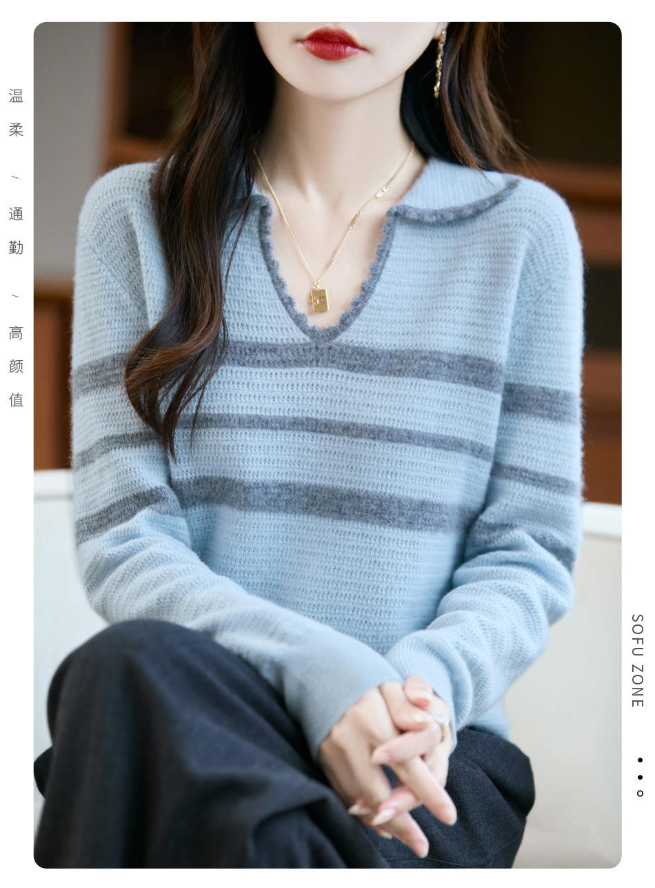 2025 Otoño/Invierno Nuevo Suéter de Punto de Pura Lana con Cuello Dobladillo Manga Larga para Mujer Bloque de Color Rayado Cálido Top de Capa Base