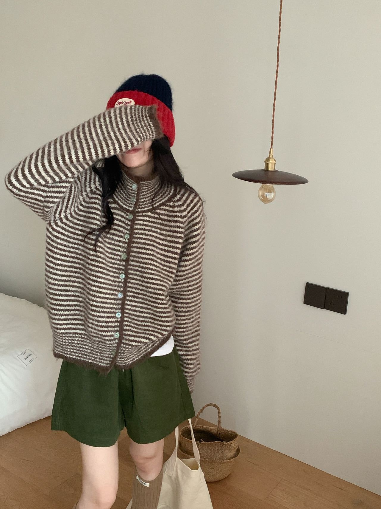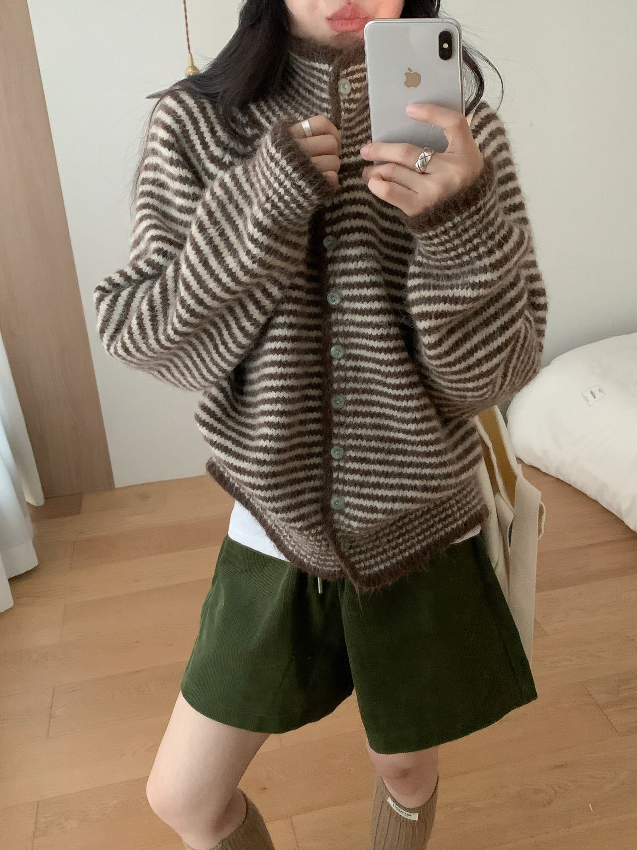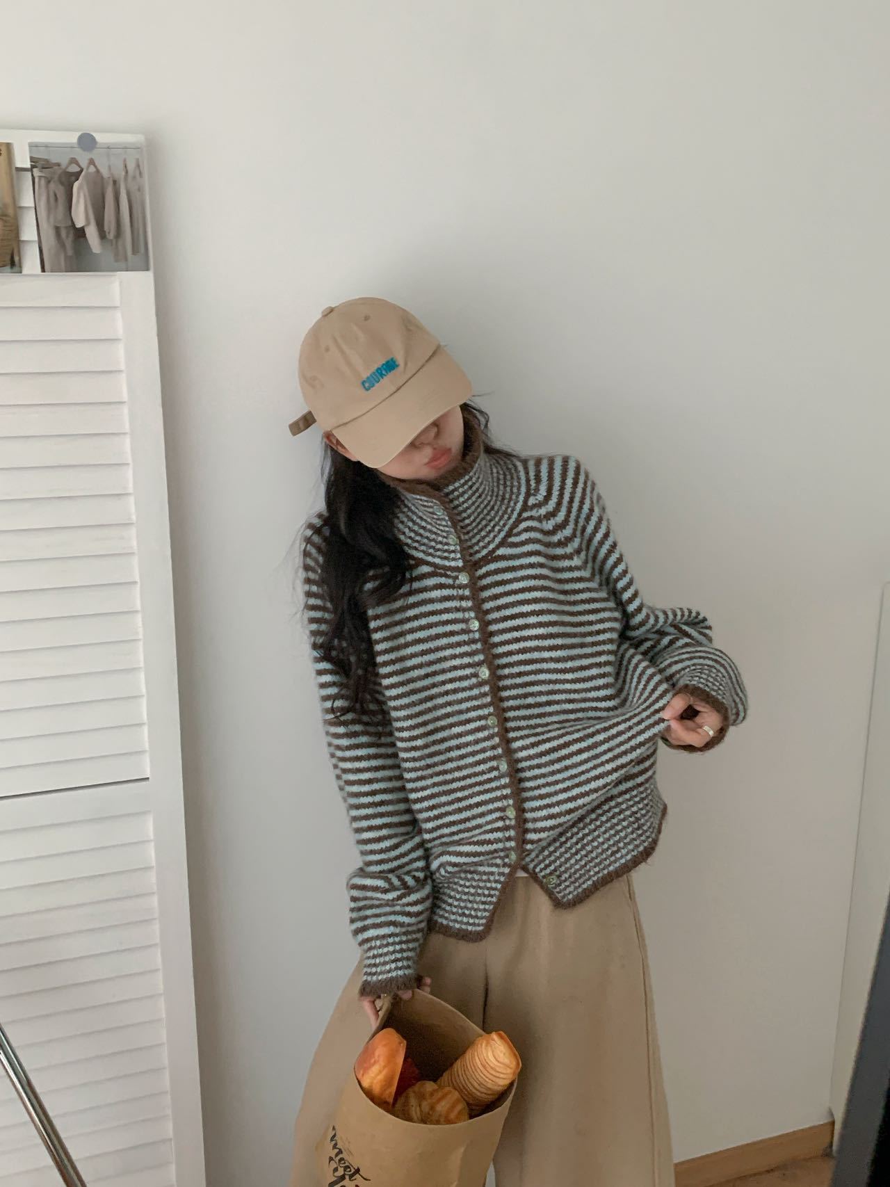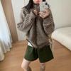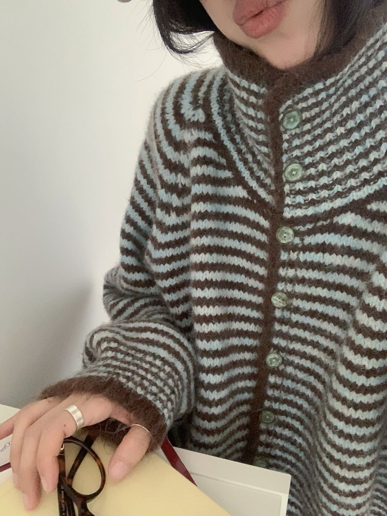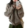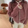 Cárdigan de Punto Minimalista a Rayas con Bloque de Color y Cuello Vuelto Estilo Coreano para Mujer Otoño/Invierno 2025 Adelgazante Suéter Holgado Abrigo