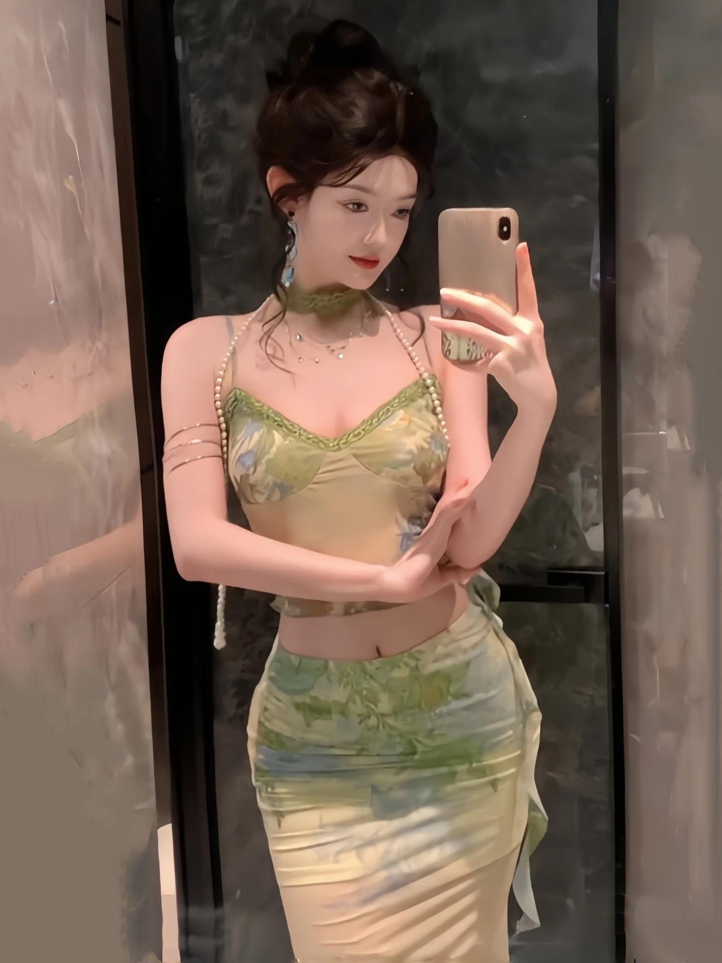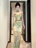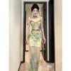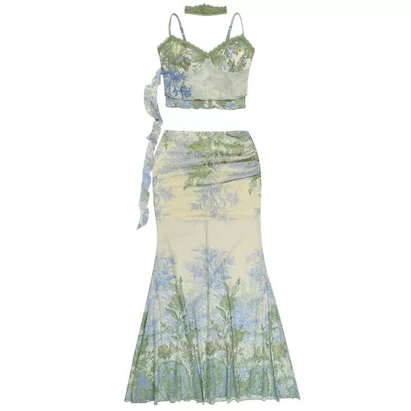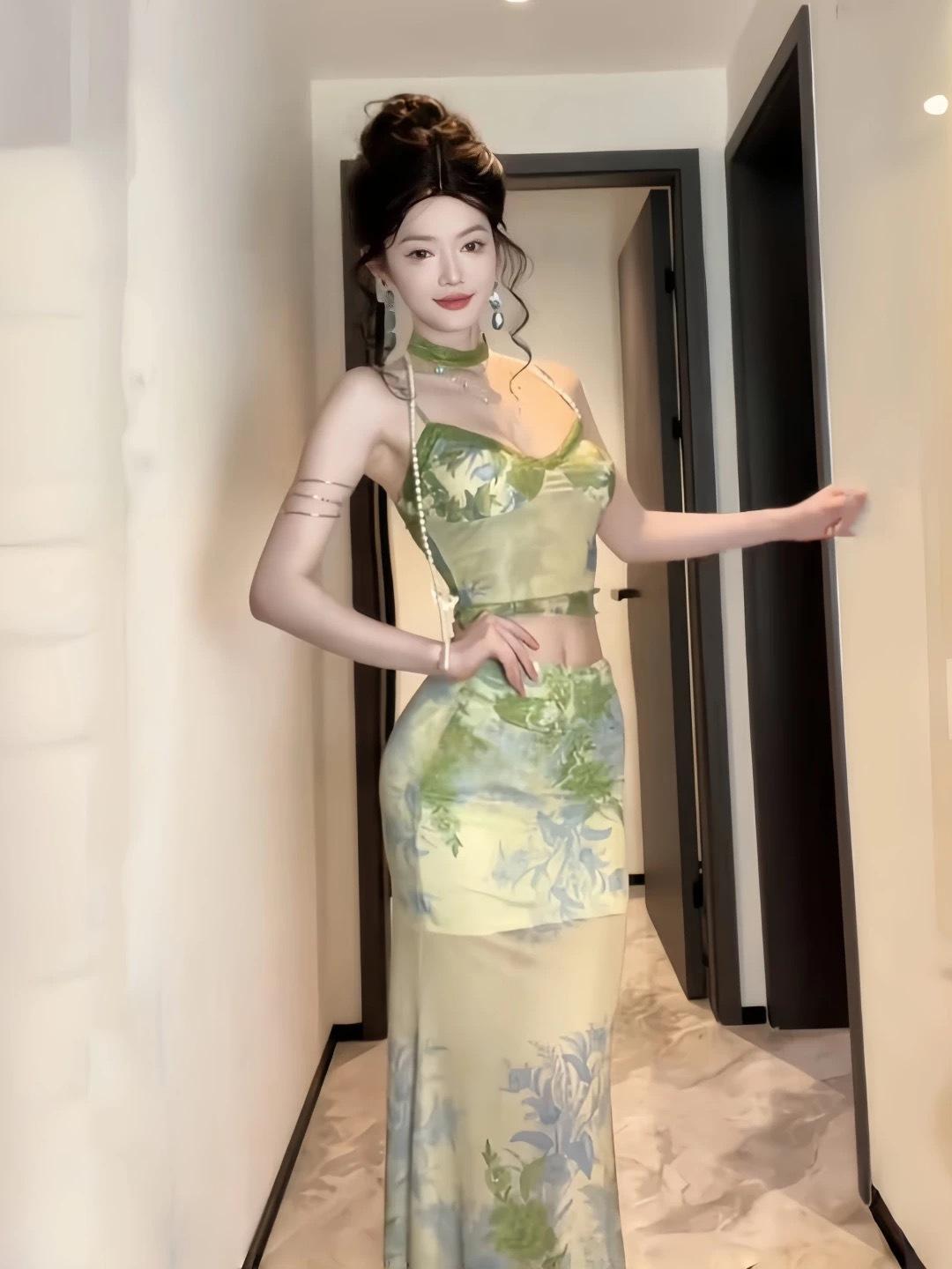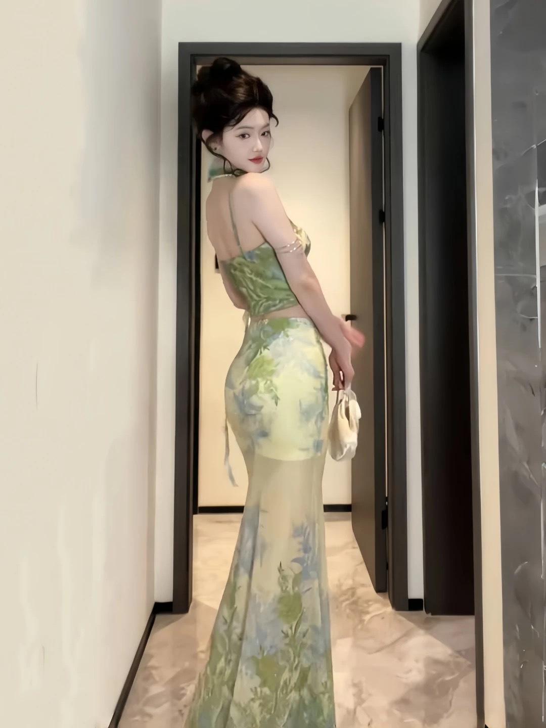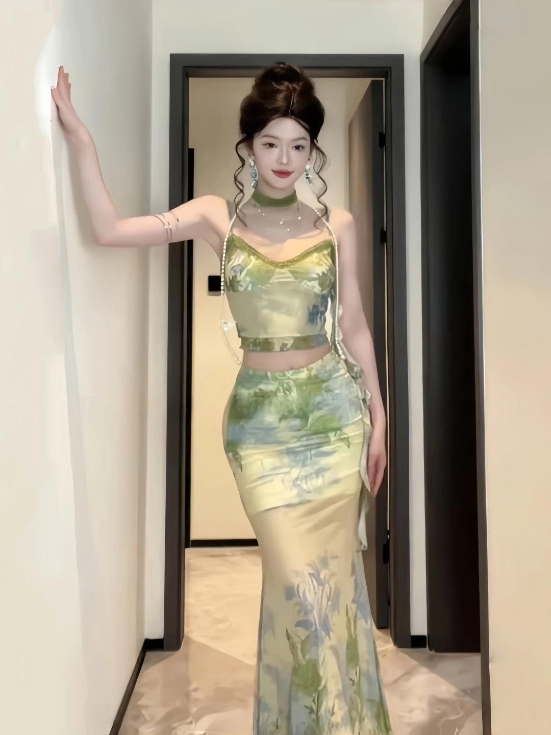 Conjunto de Top y Falda Larga Estilo Chino Retro Estampado Tirantes Espagueti Temperamento Falda Midi Adelgazante ins Conjunto de Dos Piezas