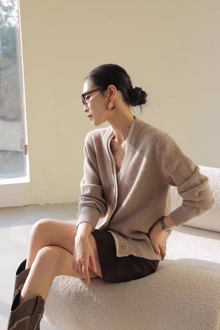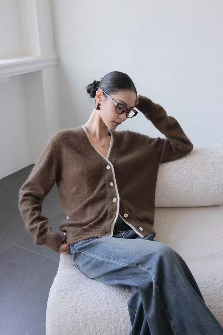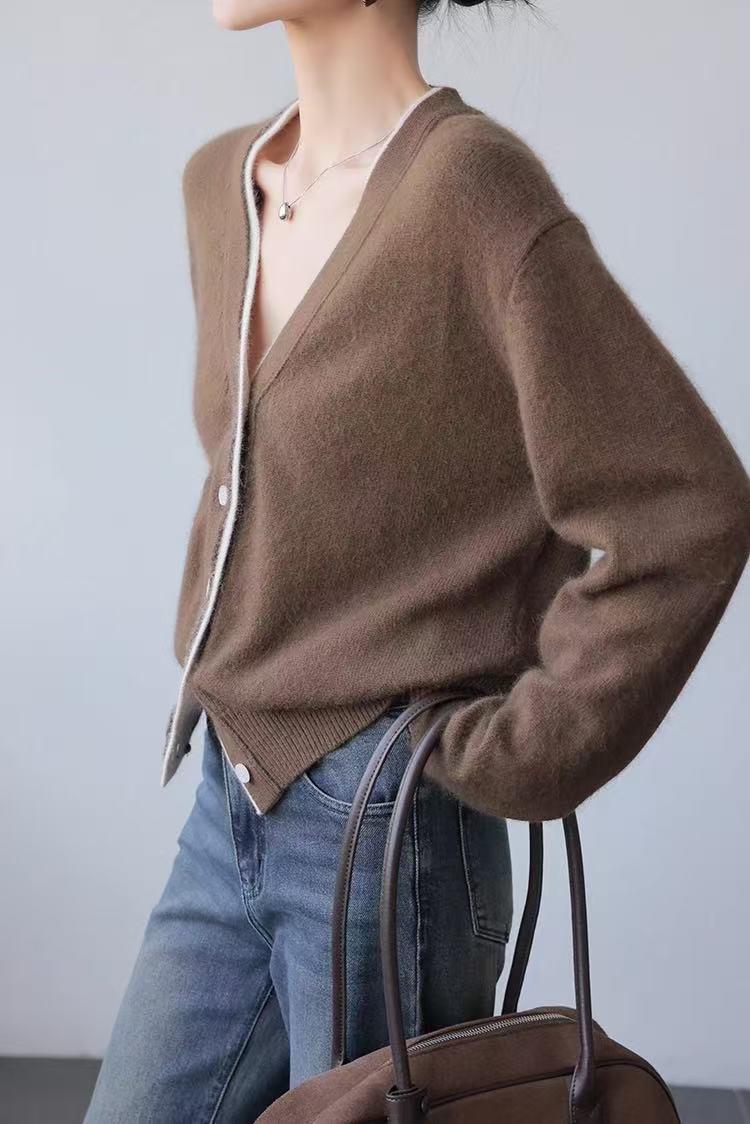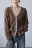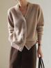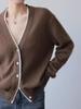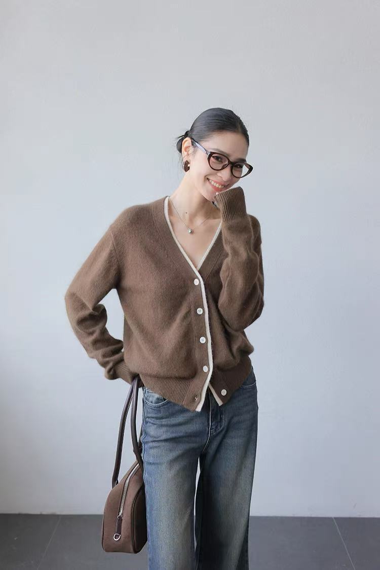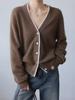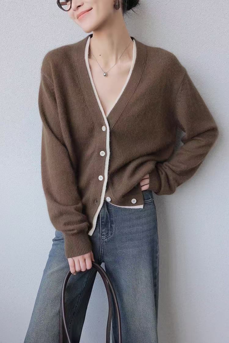 Cárdigan de Punto de Lana Pura Estilo Coreano Nuevo 2025 para Mujer Cuello en V Bloque de Color Suelto Temperamento Casual Versátil Botonadura Exterior