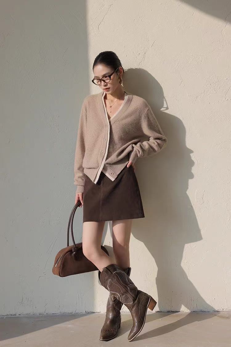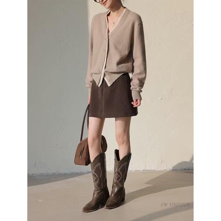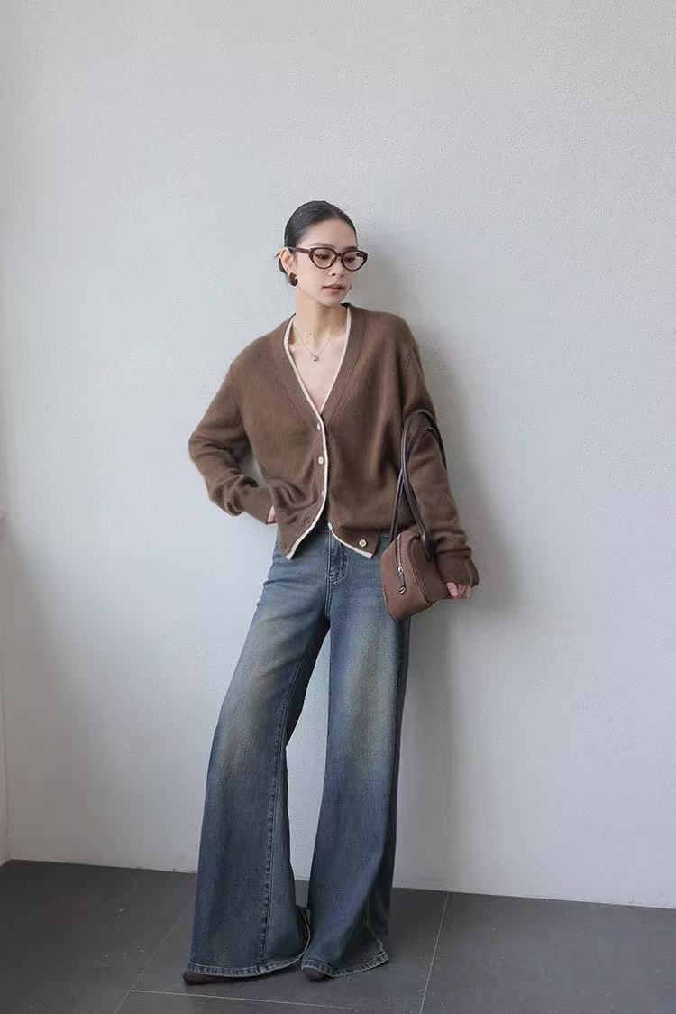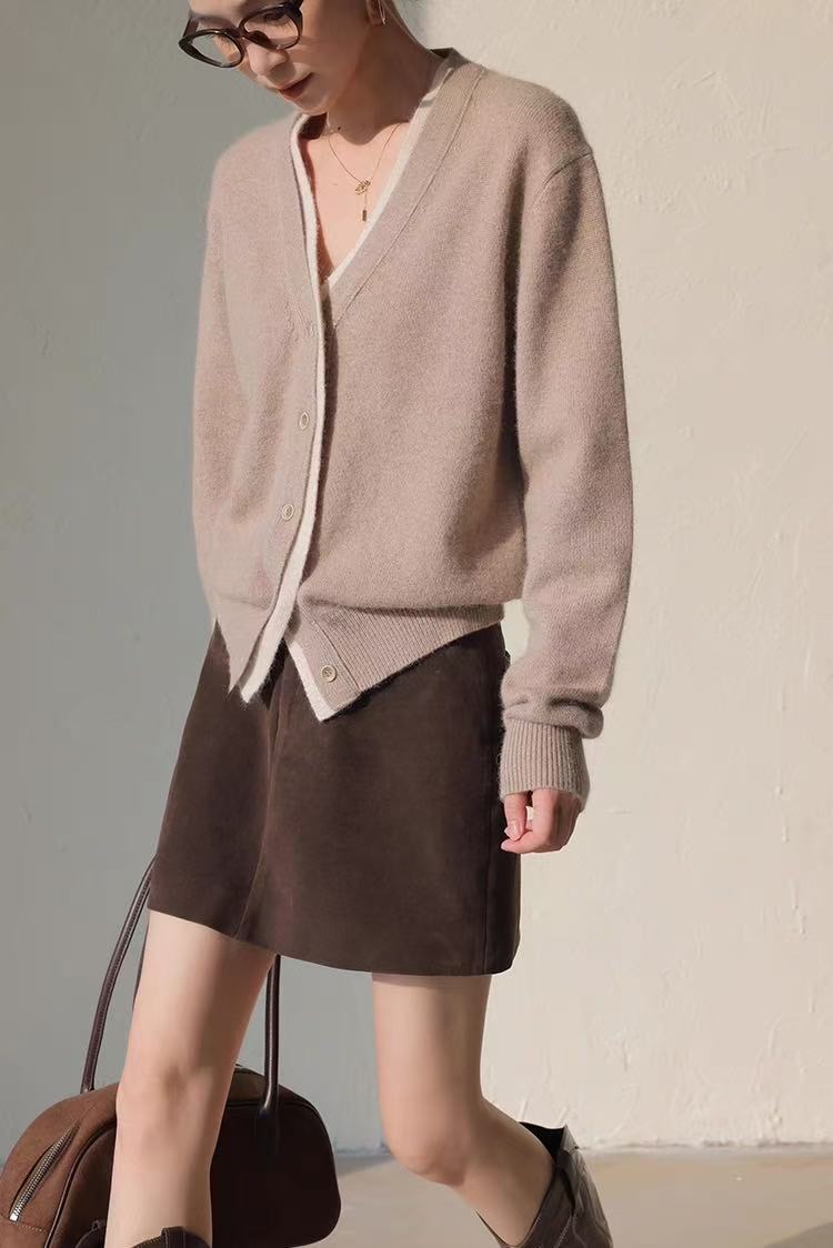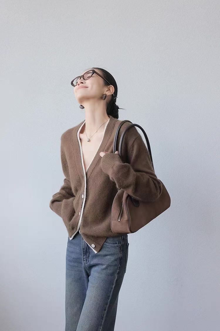 Cárdigan de Punto de Lana Pura Estilo Coreano Nuevo 2025 para Mujer Cuello en V Bloque de Color Suelto Temperamento Casual Versátil Botonadura Exterior