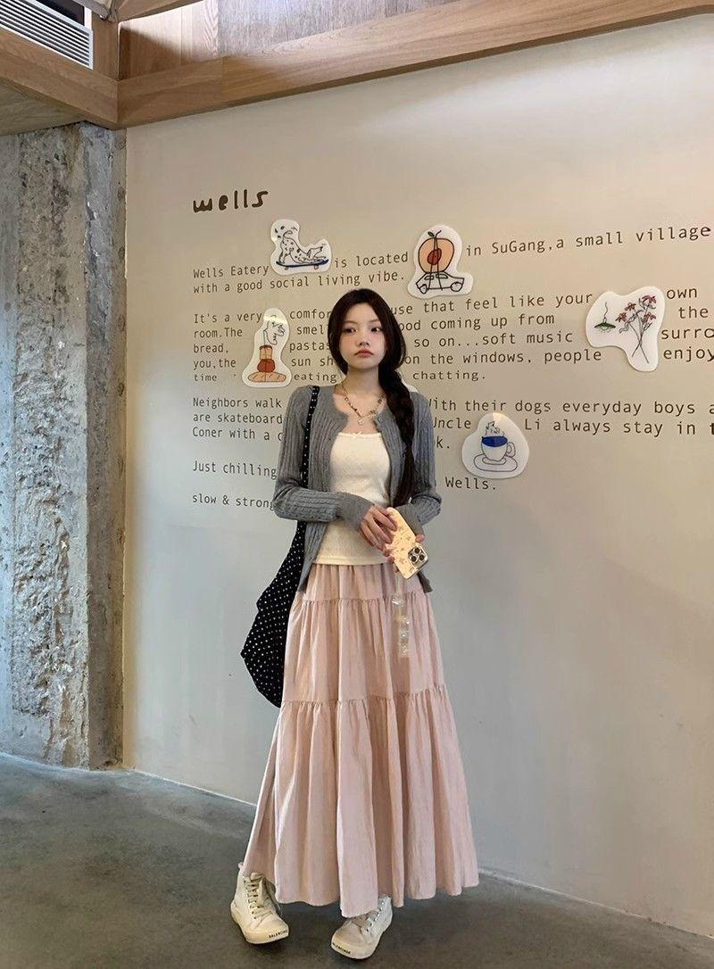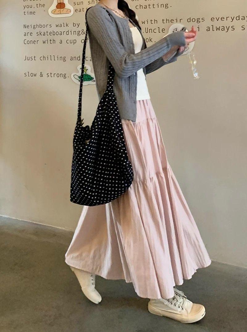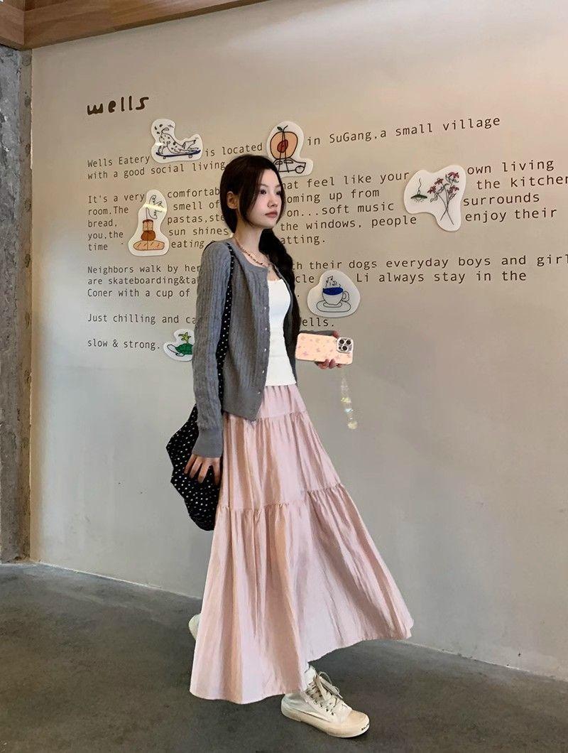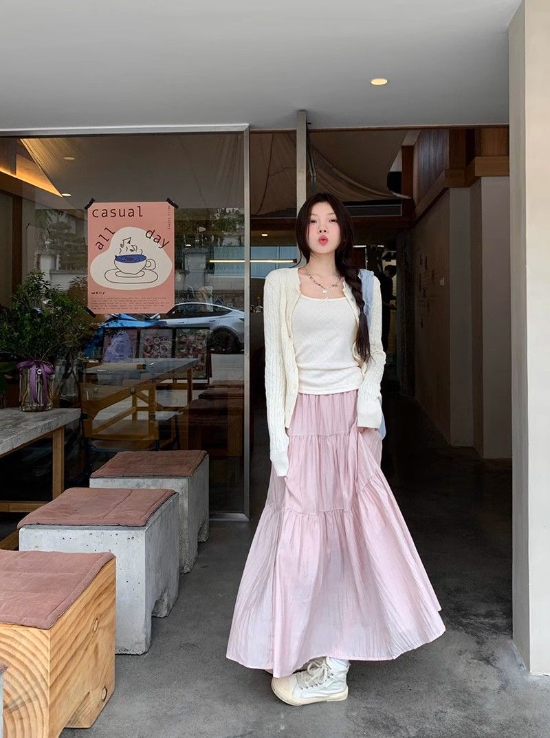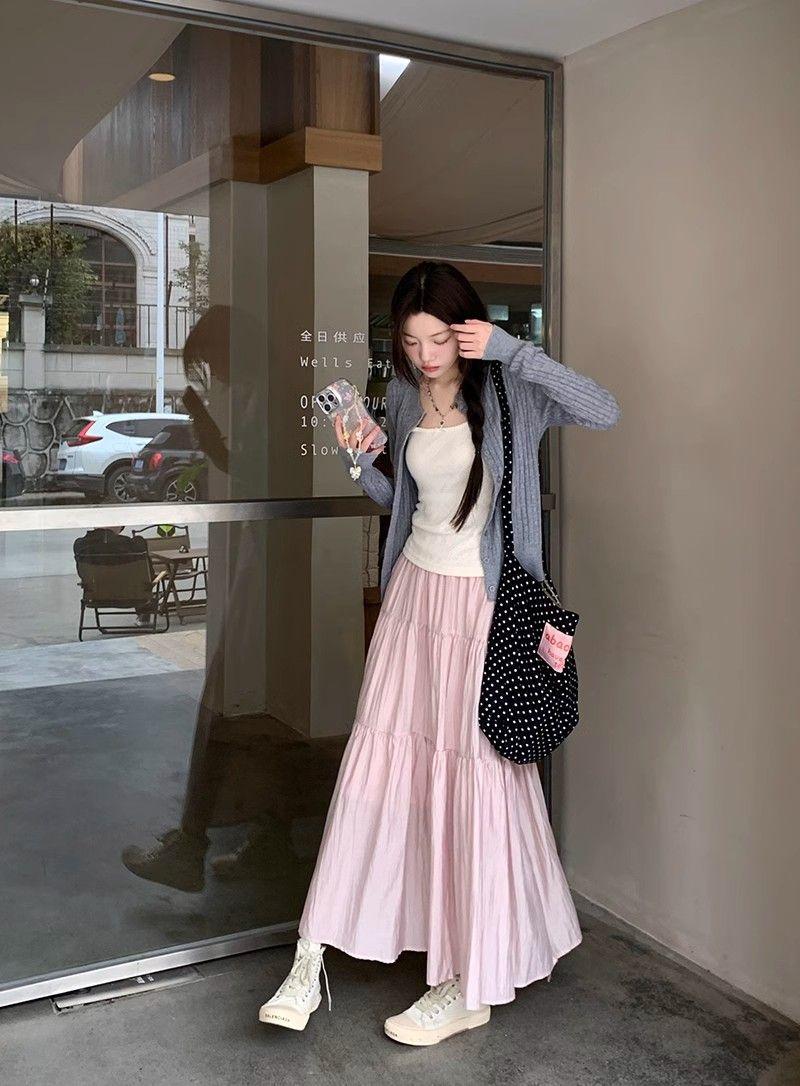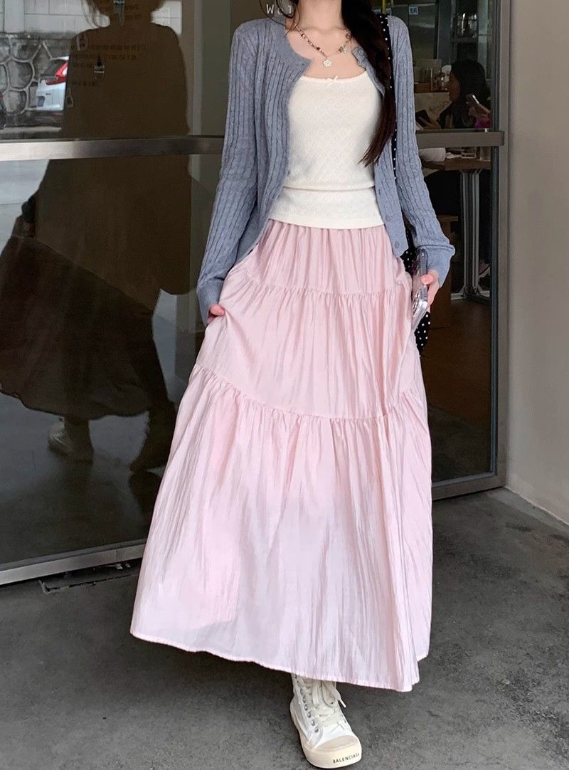 Falda Midi Primavera y Verano para Mujer Nueva Blanca Combinable Color Sólido Falda de Pastel Cintura Alta Adelgazante Falda Grande de Vuelo Línea A Falda Casual