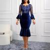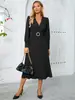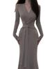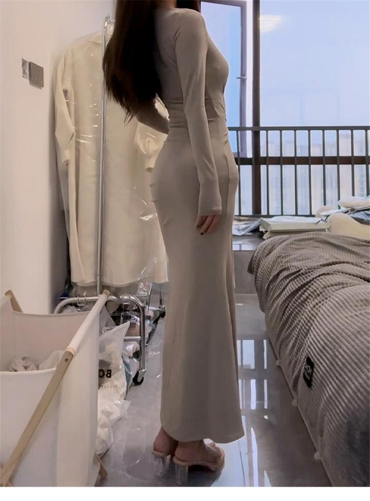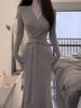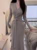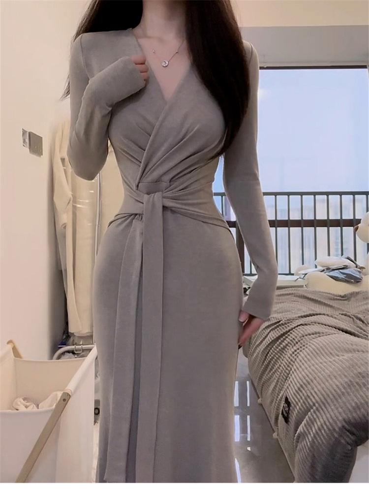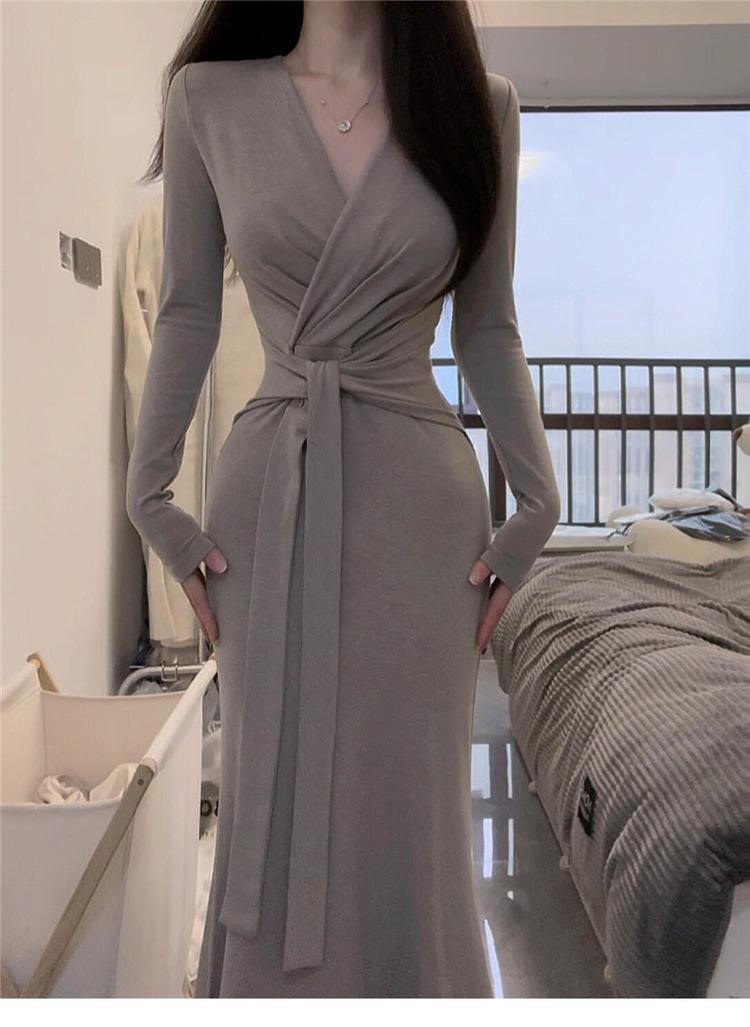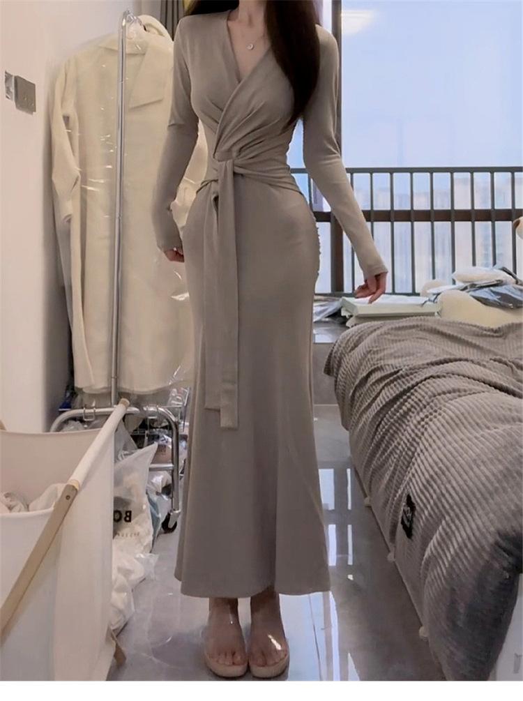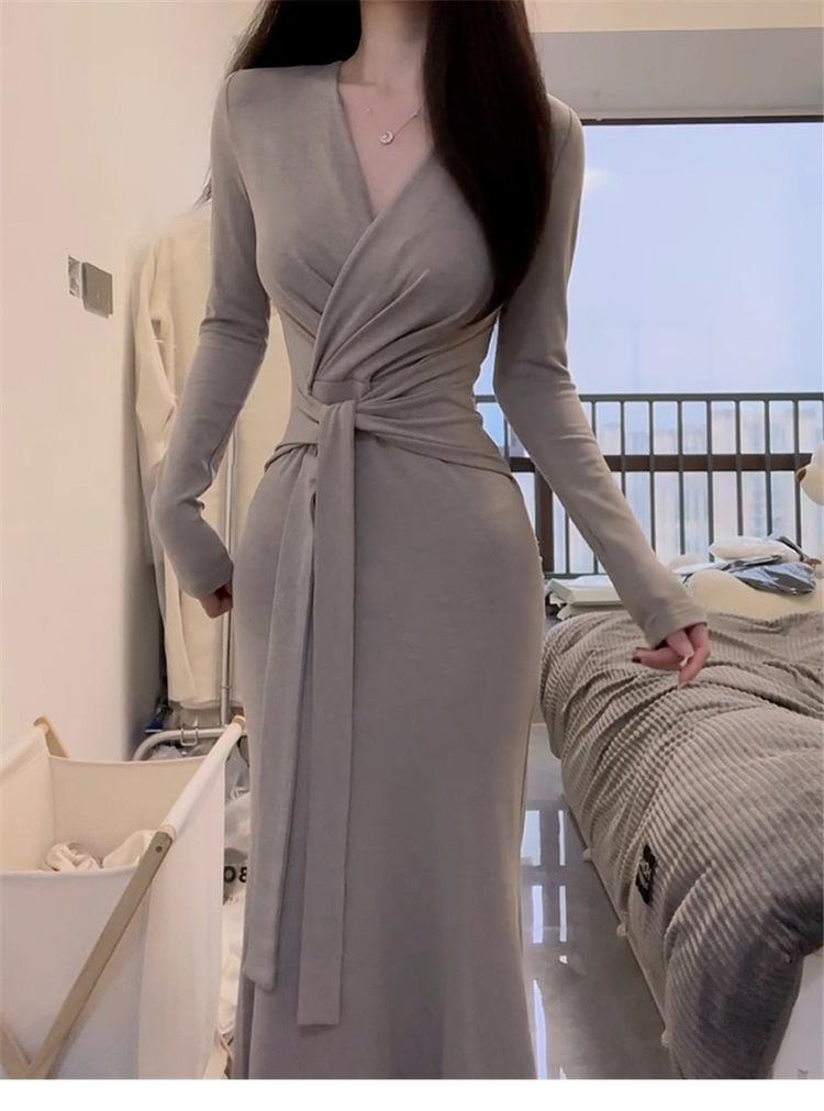Comercio Exterior Deseo Puro Nuevo Vestido de Manga Larga con Lazo en V para Mujer Otoño Adelgazante Temperamento Vestido Largo Vestido Bodycon
