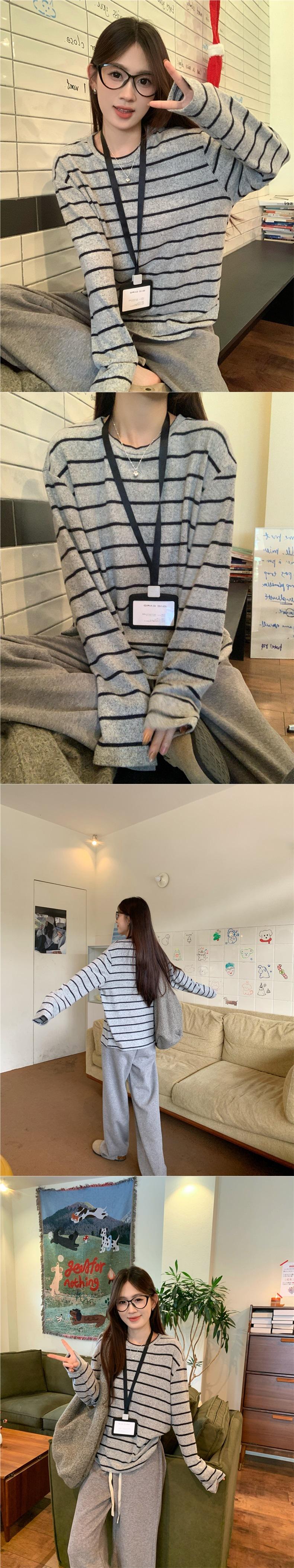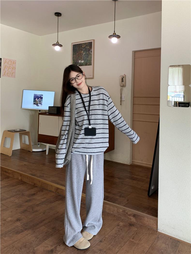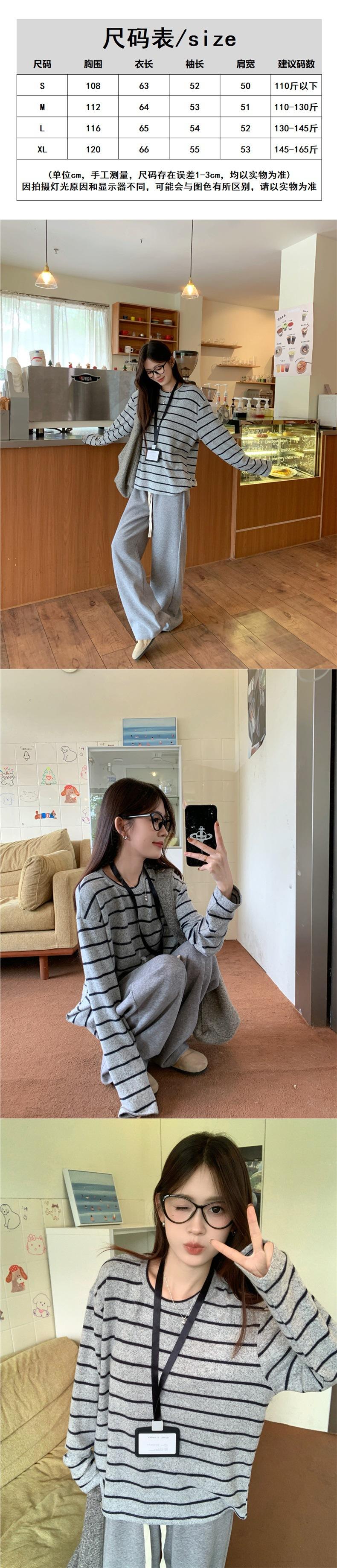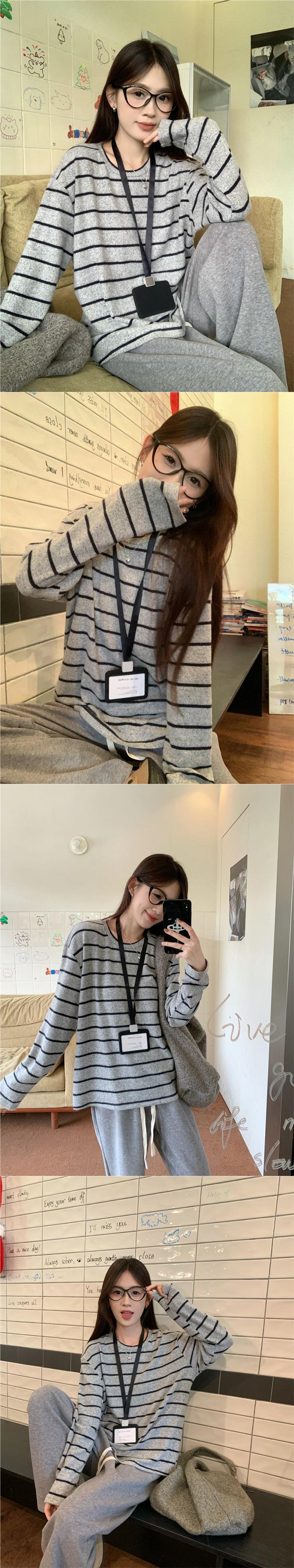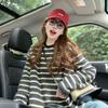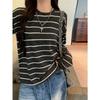 Playera de Manga Larga Cepillada a Rayas con Bloque de Color de Cuello Redondo para Mujer Otoño/Invierno Casual Estilo Coreano Perezoso Holgada Top de Tendencia para Capa Interior