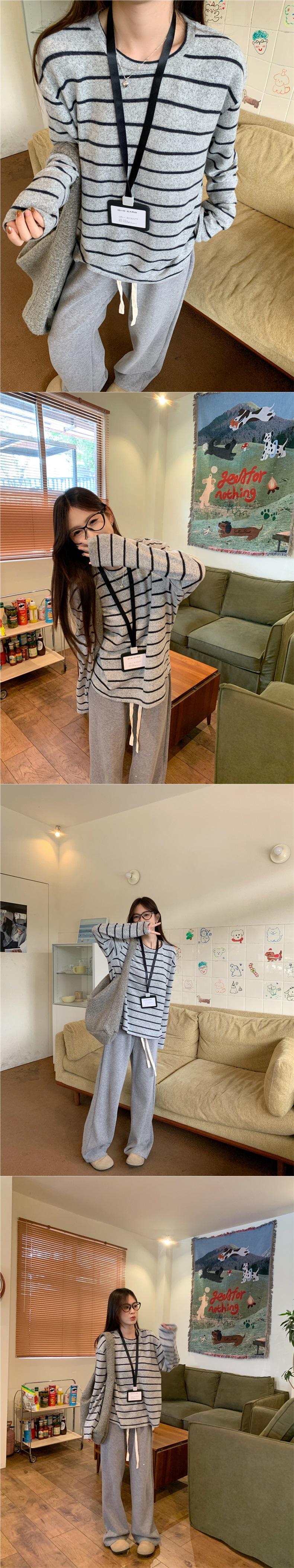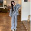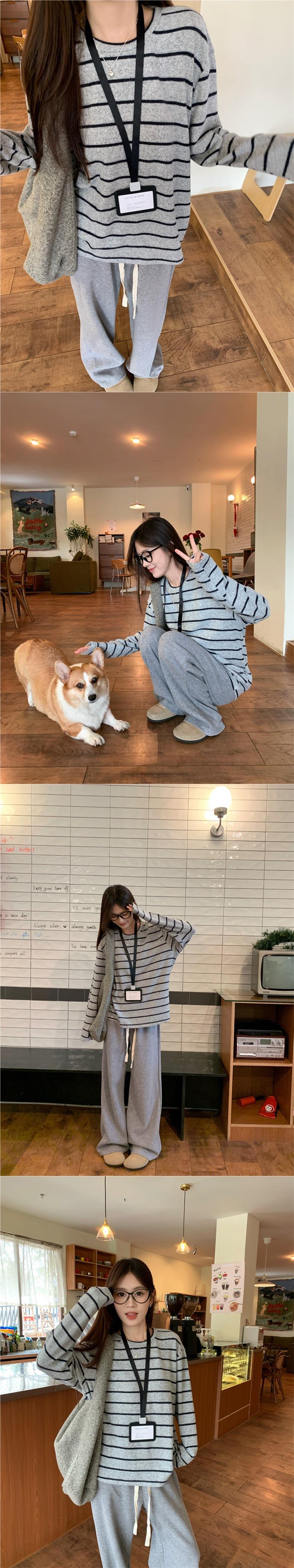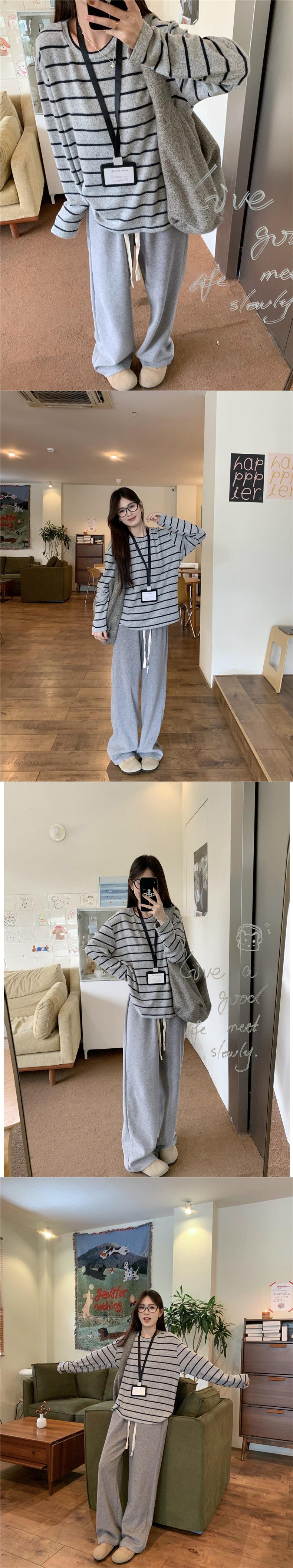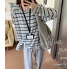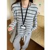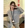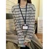 Playera de Manga Larga Cepillada a Rayas con Bloque de Color de Cuello Redondo para Mujer Otoño/Invierno Casual Estilo Coreano Perezoso Holgada Top de Tendencia para Capa Interior
