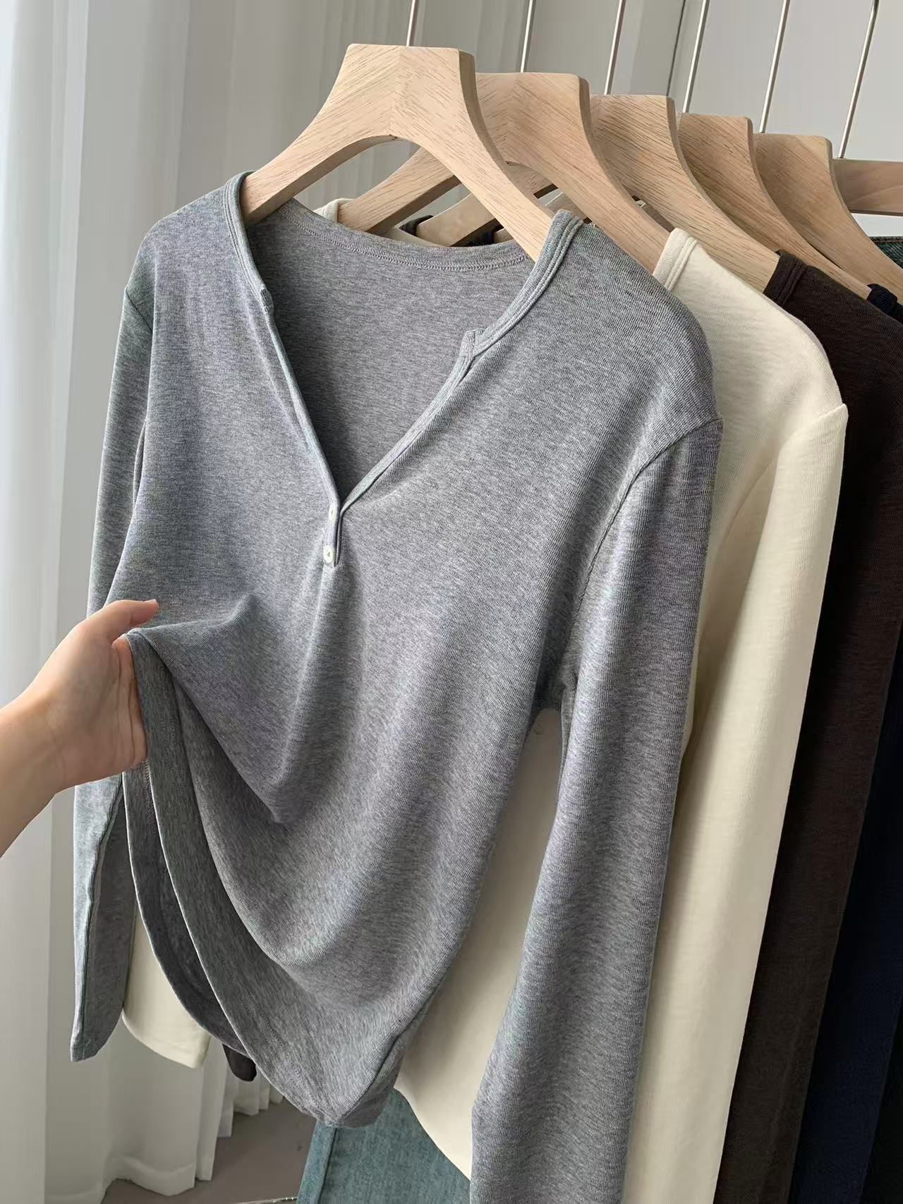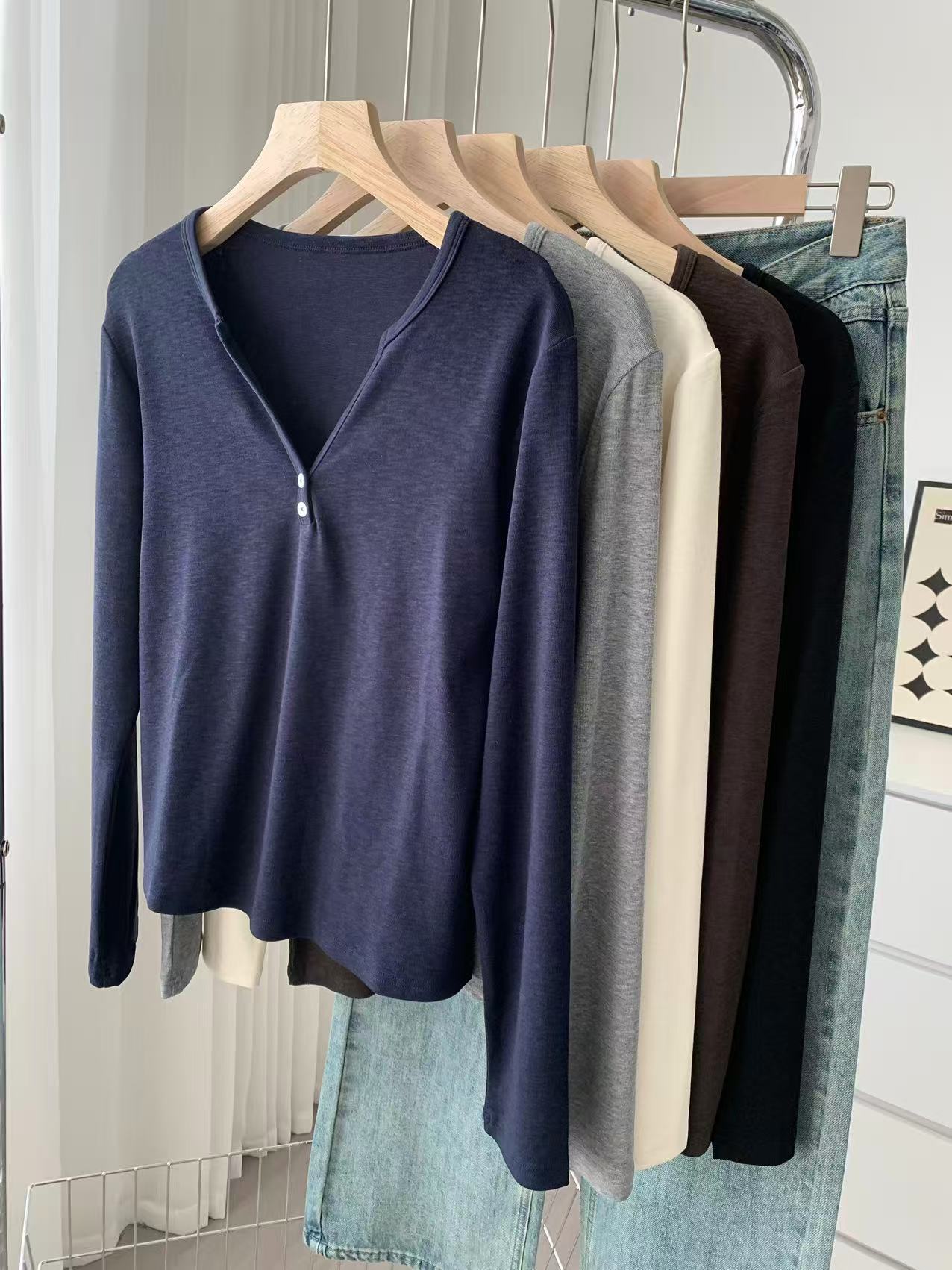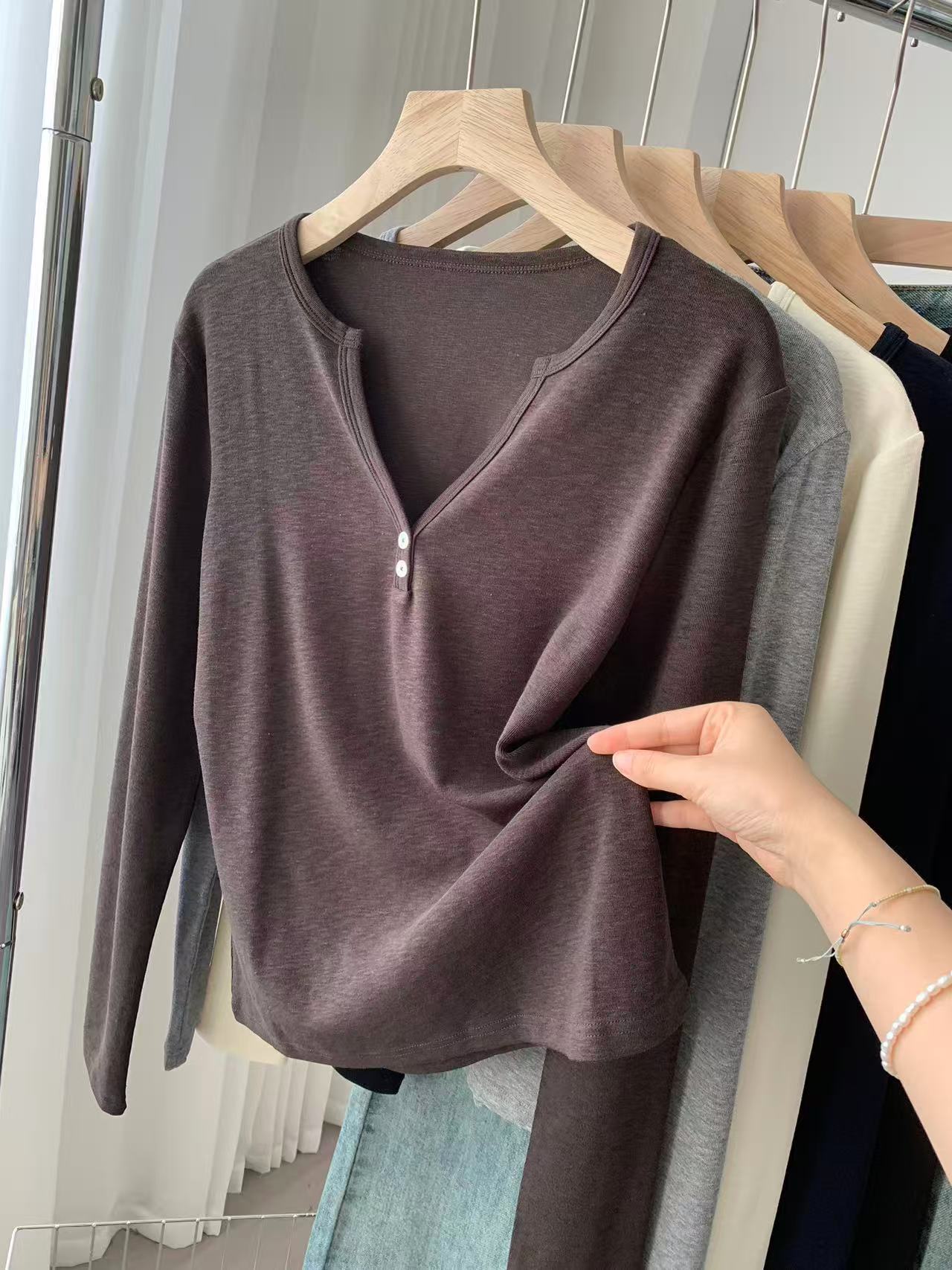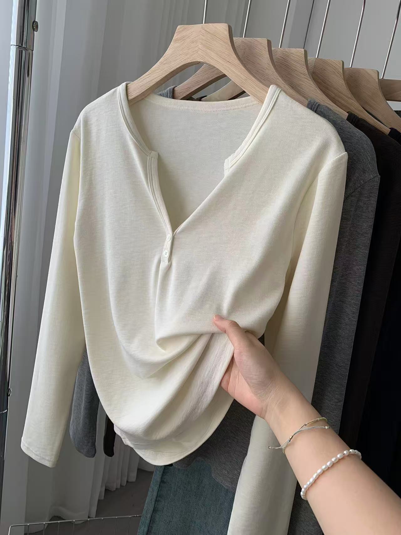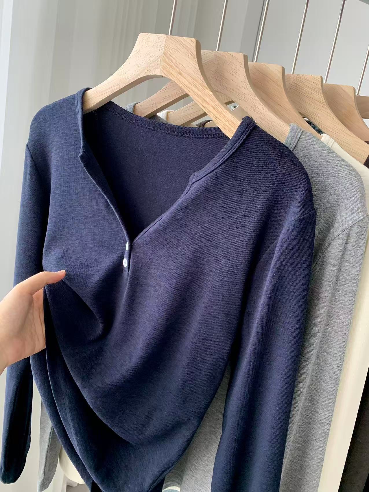 ¡ju muestra delgadez~Camiseta de manga larga con cuello en V y dos botones de Lenzing Tencel para mujer! Top base versátil de otoño elástico ajustado puro y sexy
