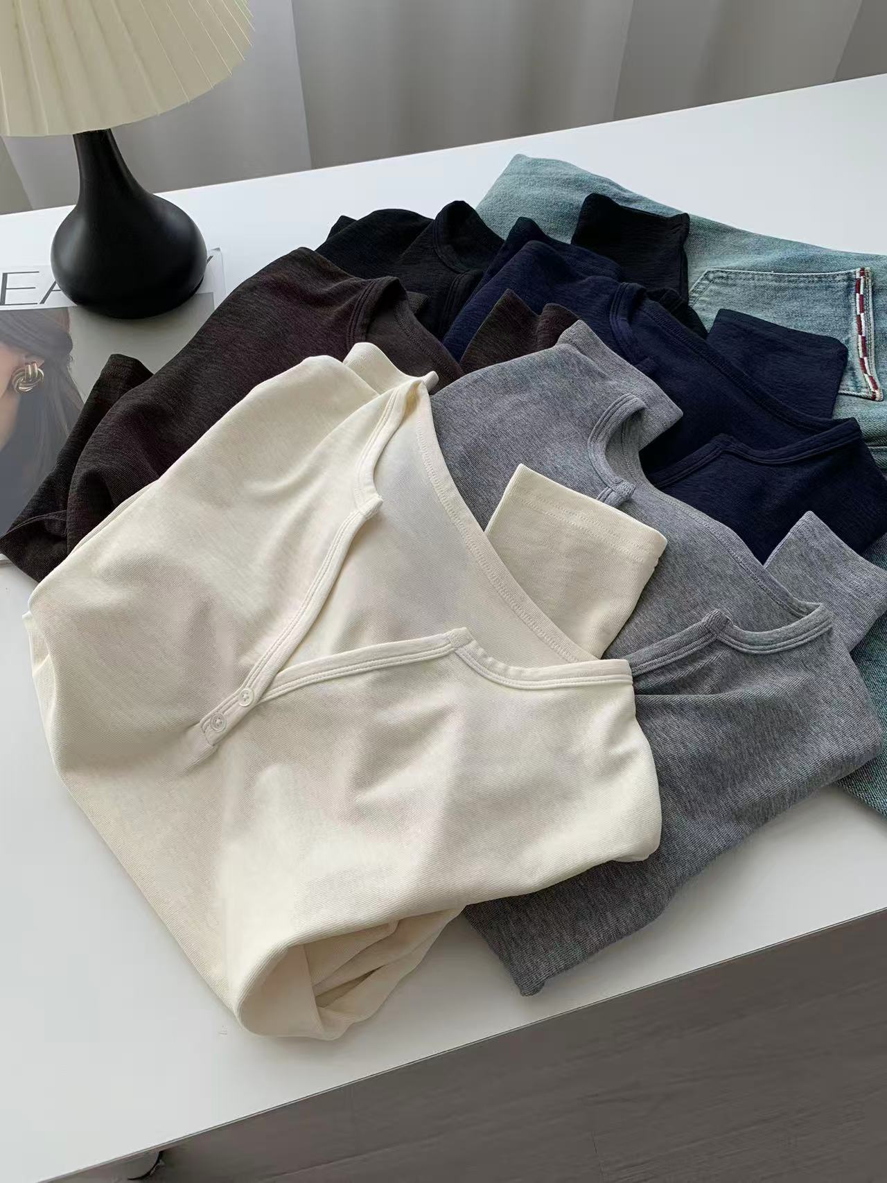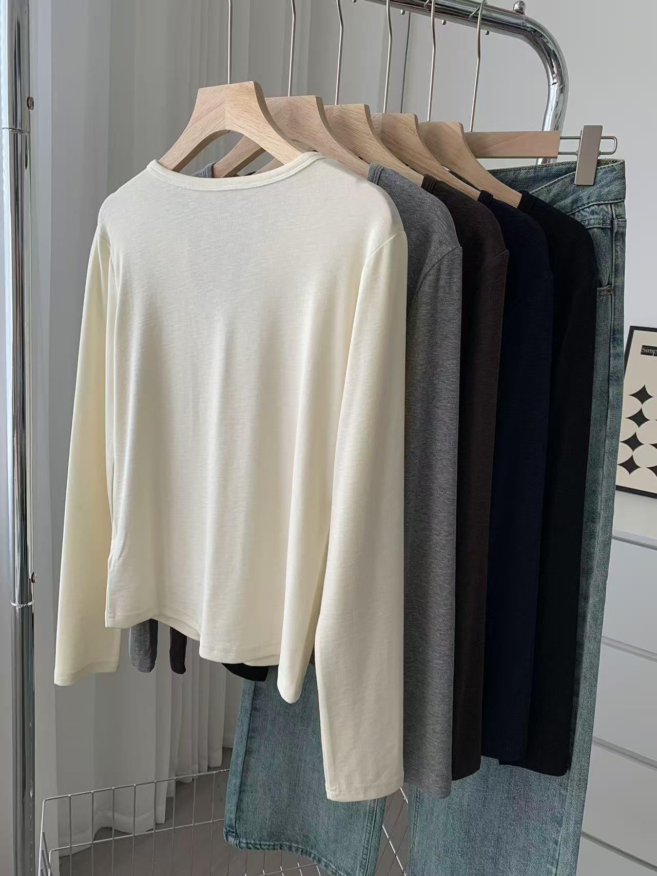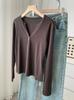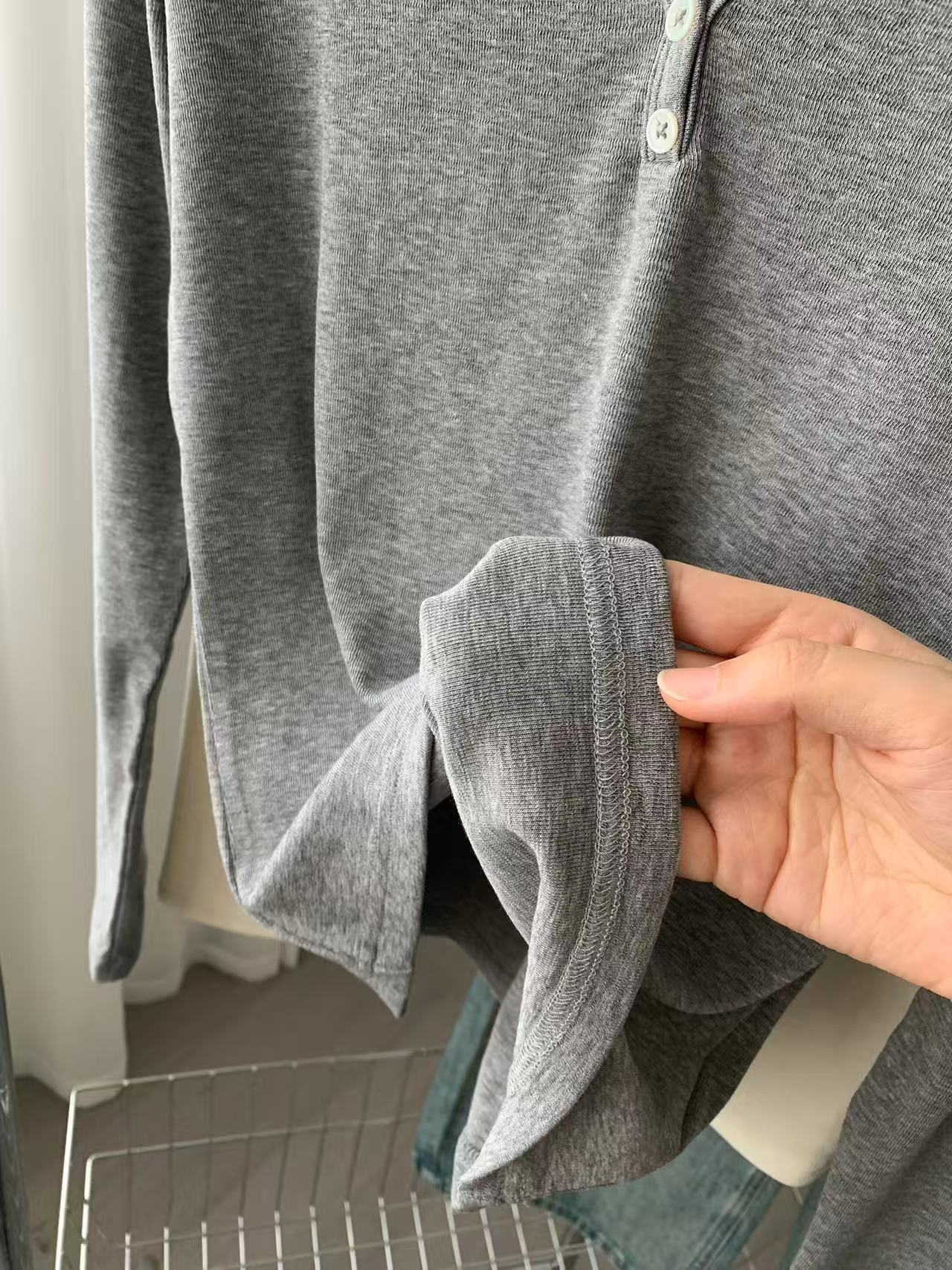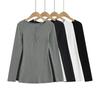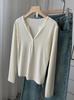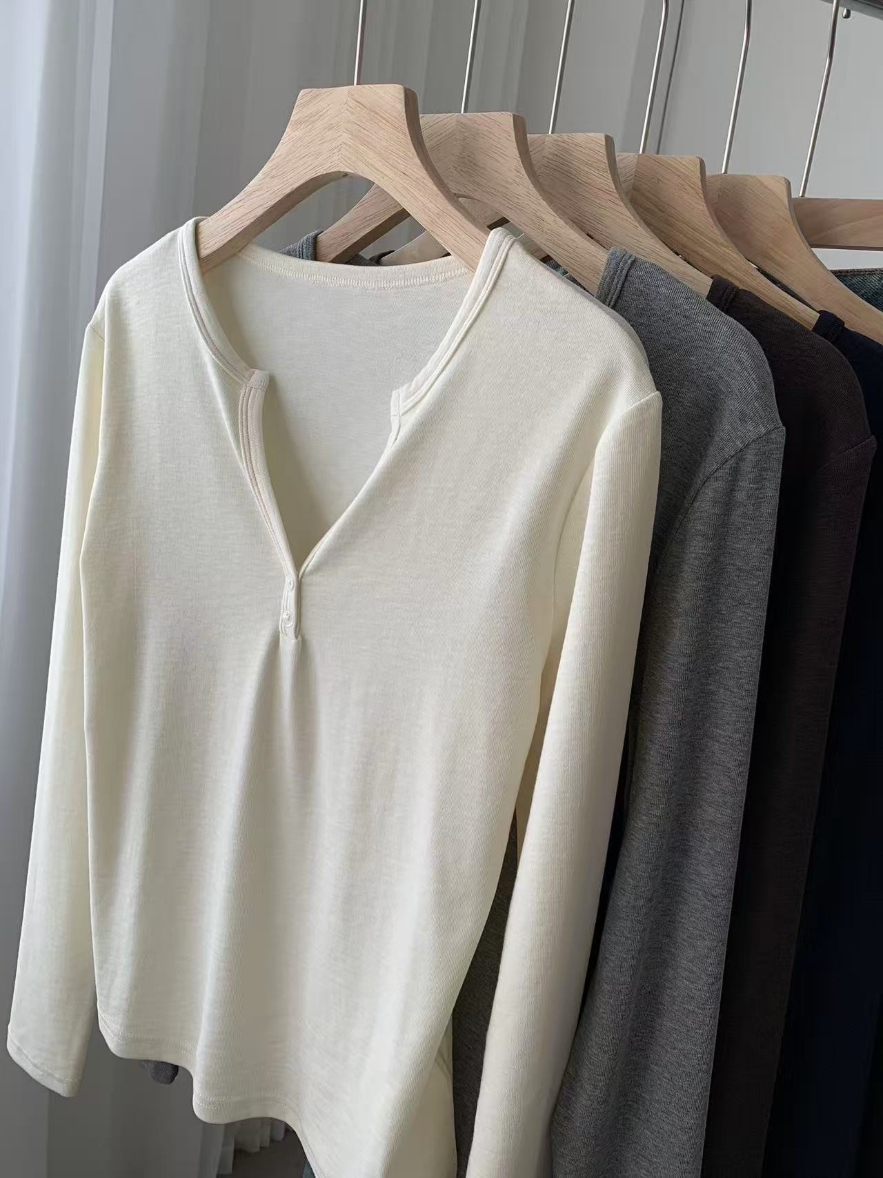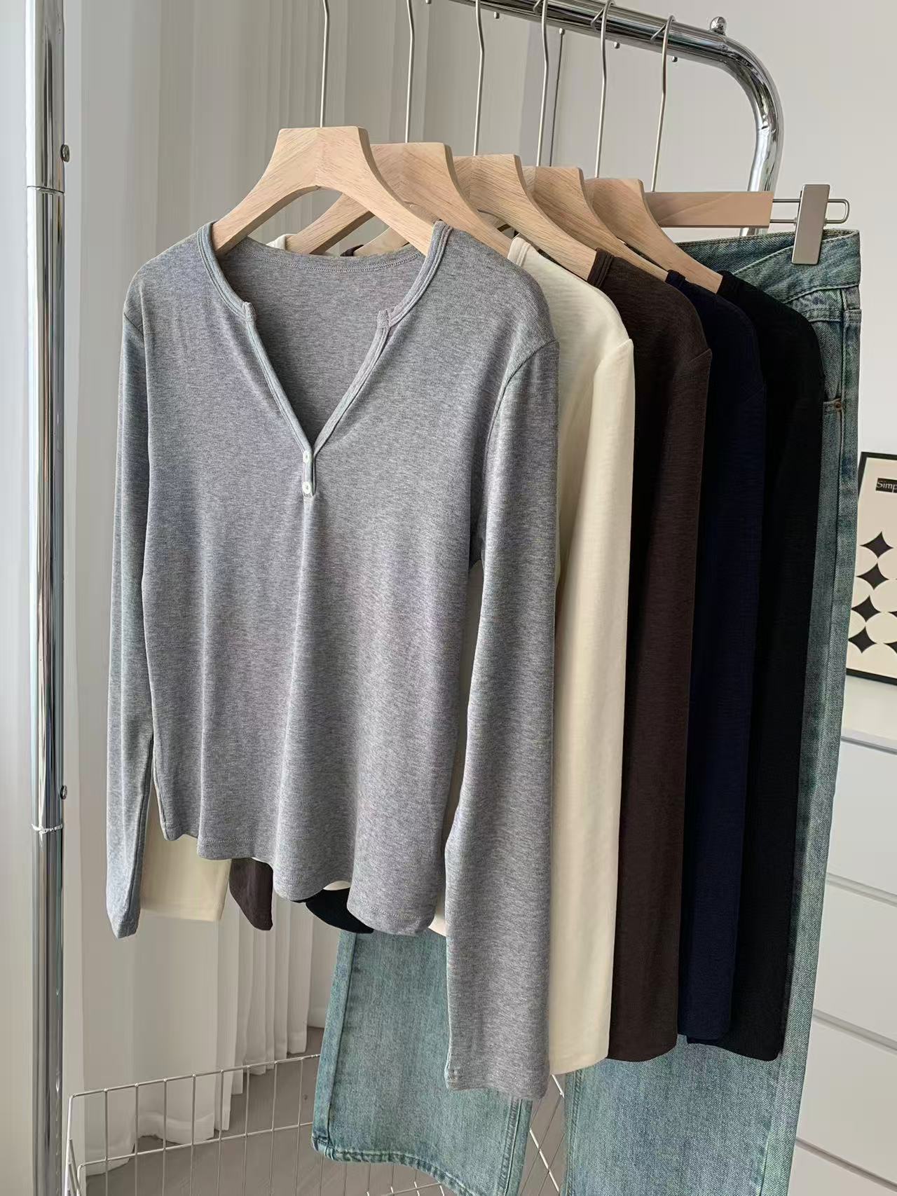 ¡ju muestra delgadez~Camiseta de manga larga con cuello en V y dos botones de Lenzing Tencel para mujer! Top base versátil de otoño elástico ajustado puro y sexy