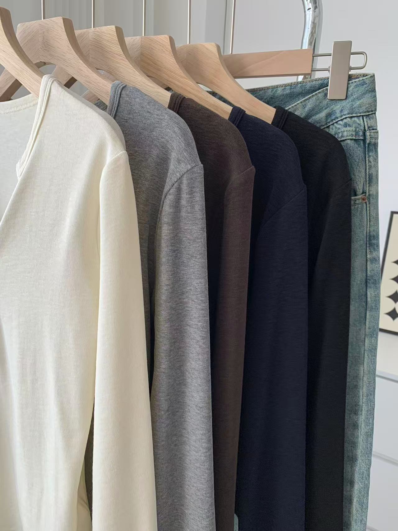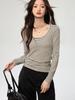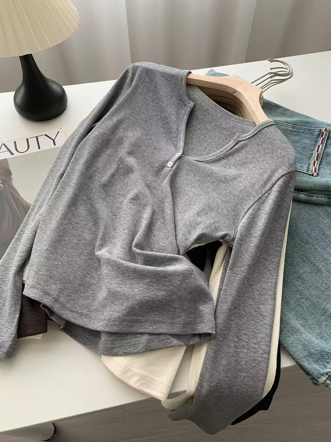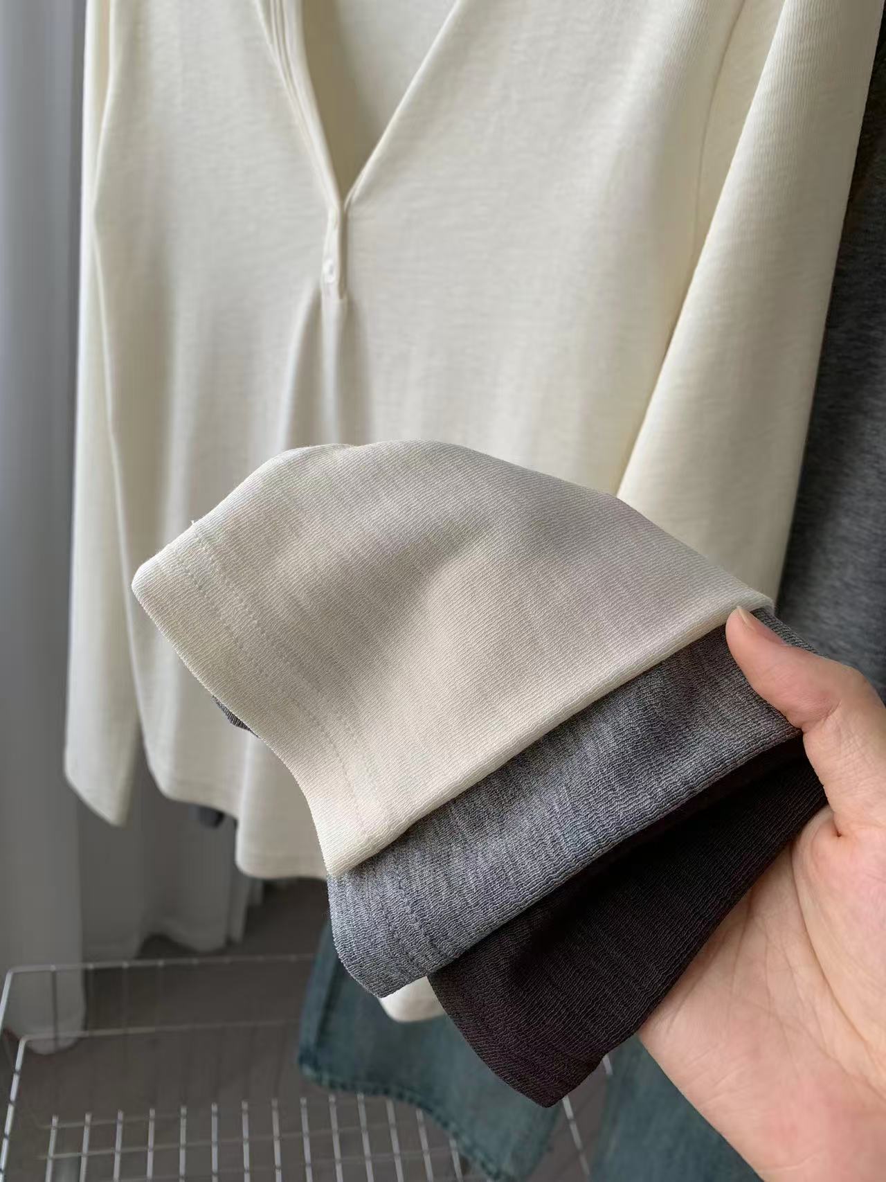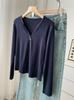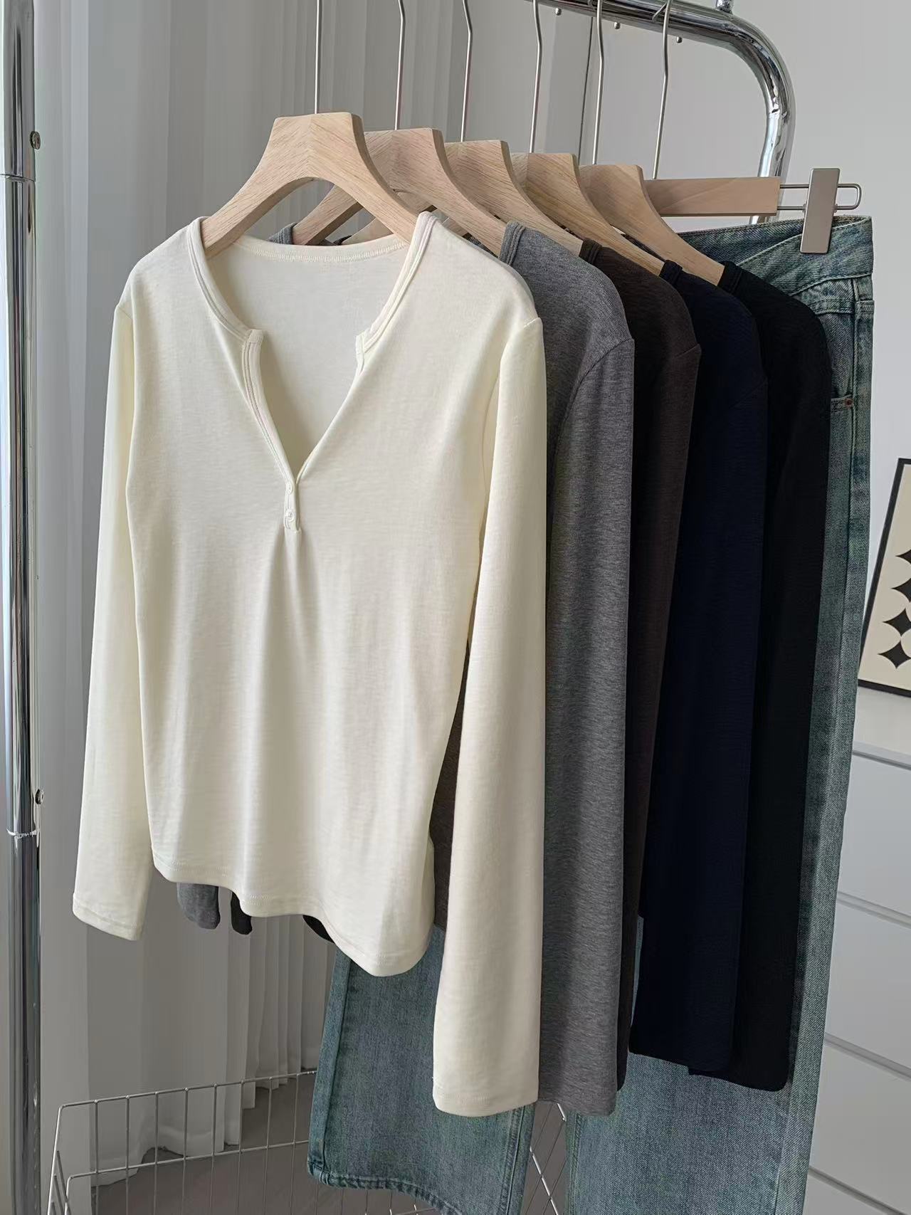 ¡ju muestra delgadez~Camiseta de manga larga con cuello en V y dos botones de Lenzing Tencel para mujer! Top base versátil de otoño elástico ajustado puro y sexy