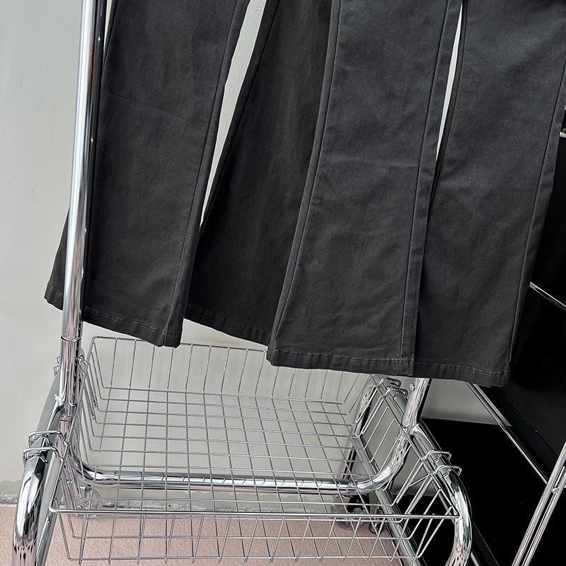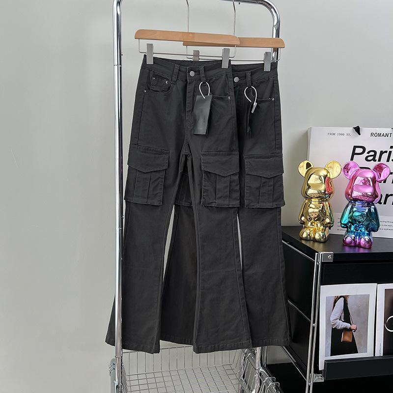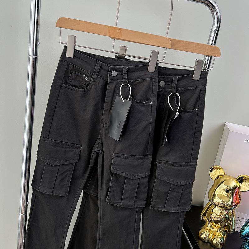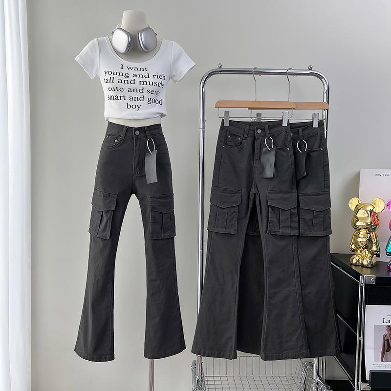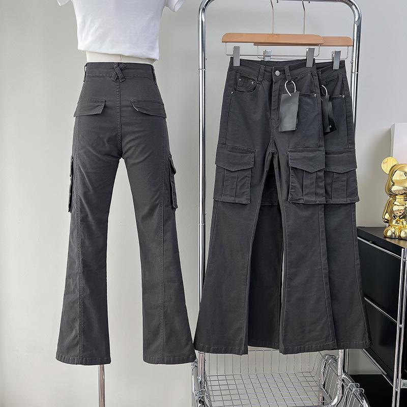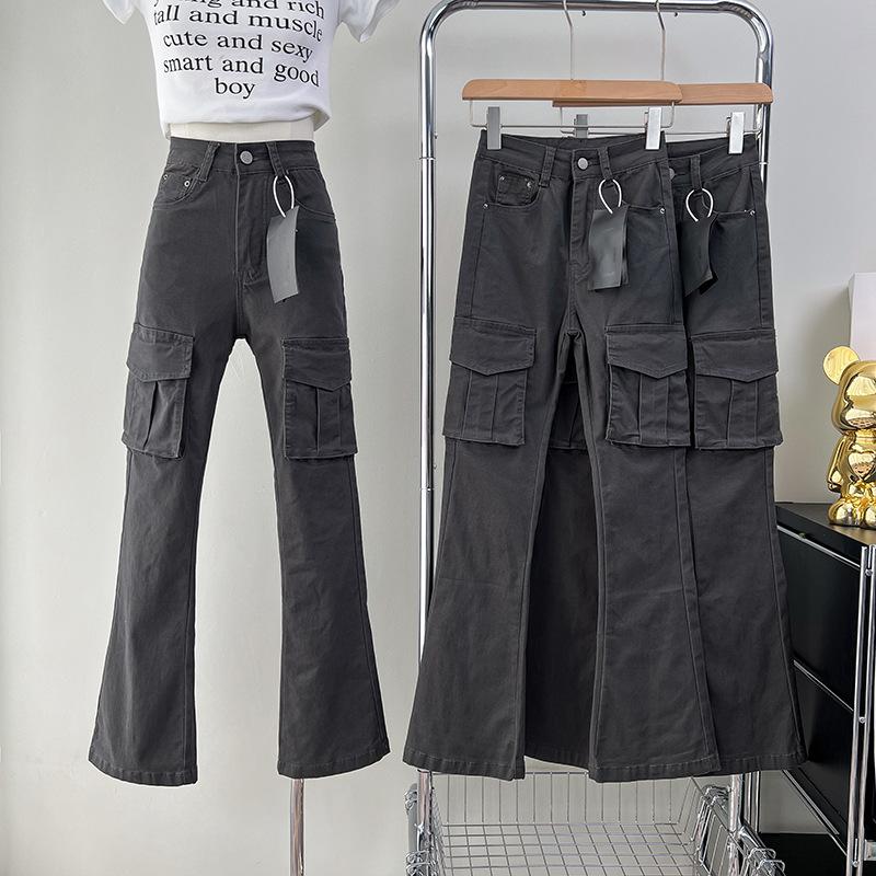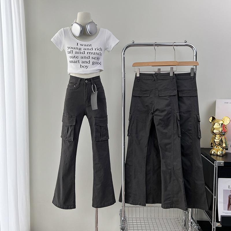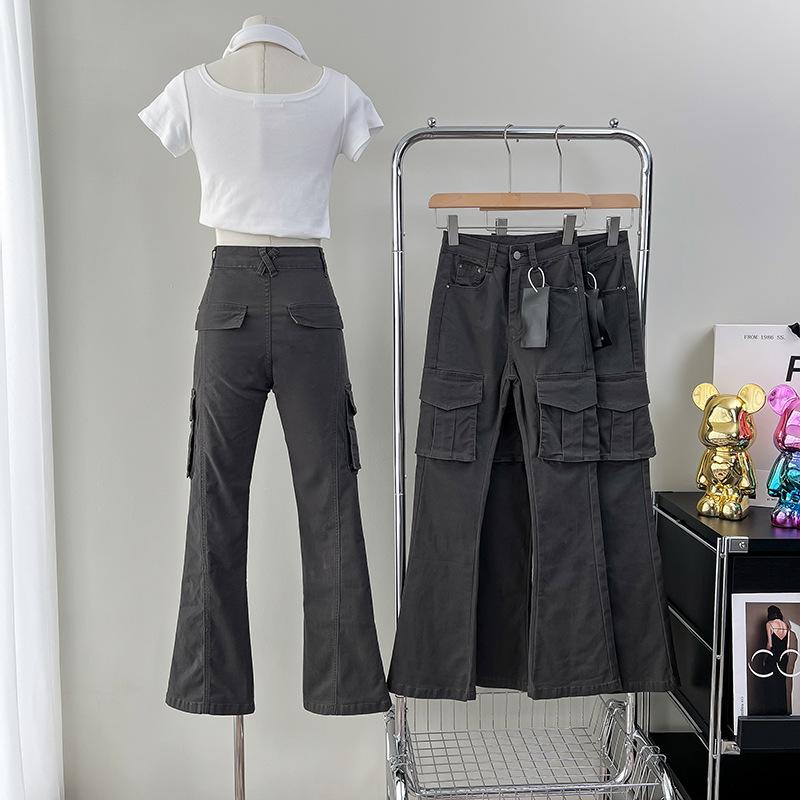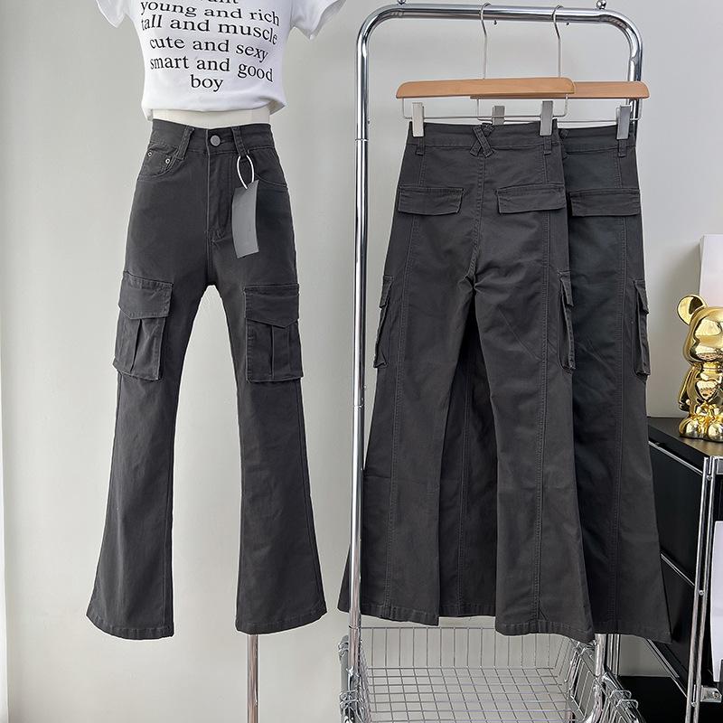Primavera y Otoño Nuevos Jeans Elásticos de Cintura Alta Grises Pantalones Acampanados Micro para Mujer Altos Multip Bolsillos Pantalones de Trapeador