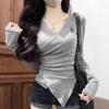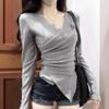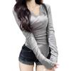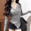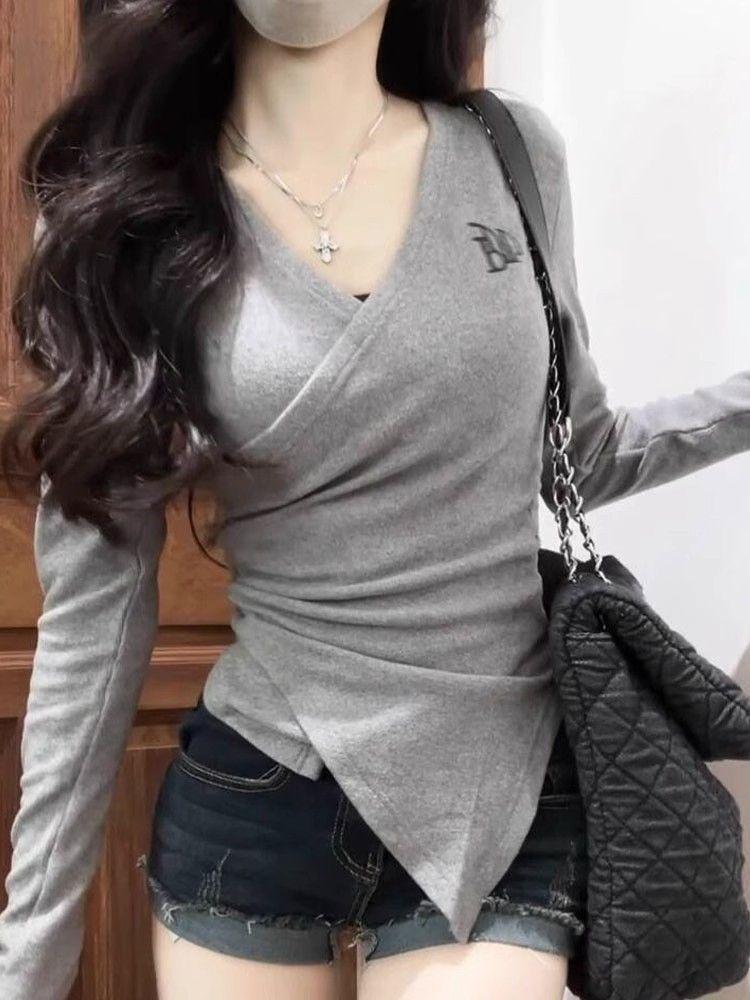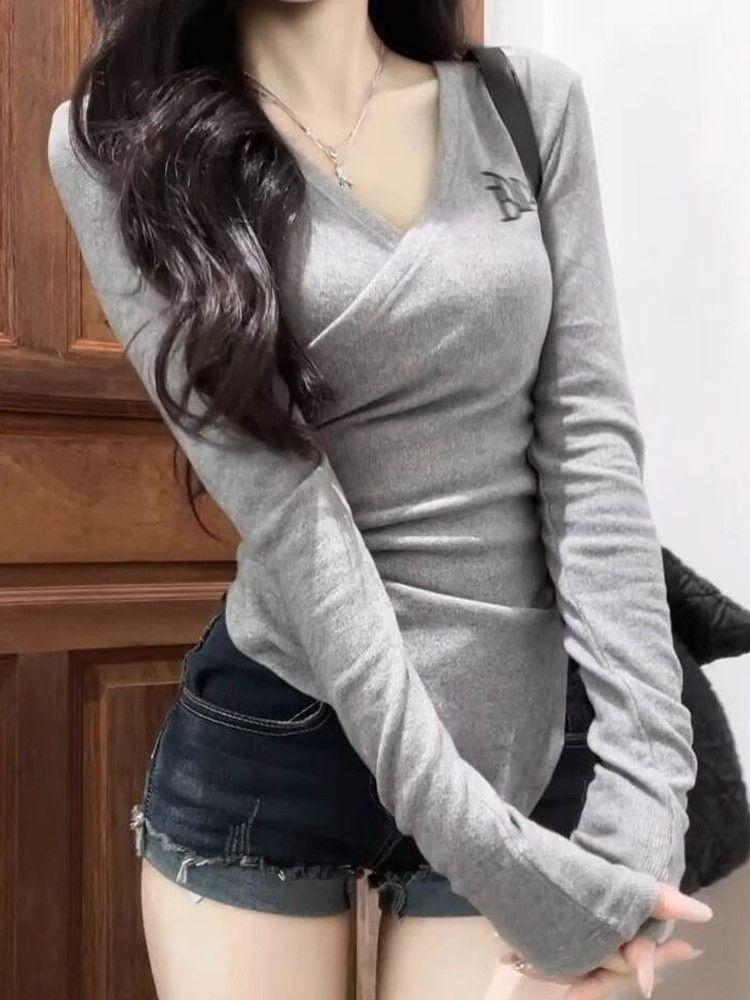 Camiseta de manga larga con cuello en V cruzado de estilo puro y sexy para mujer, otoño, nicho chic, camiseta básica, top corto ceñido a la cintura para chica hot, ins